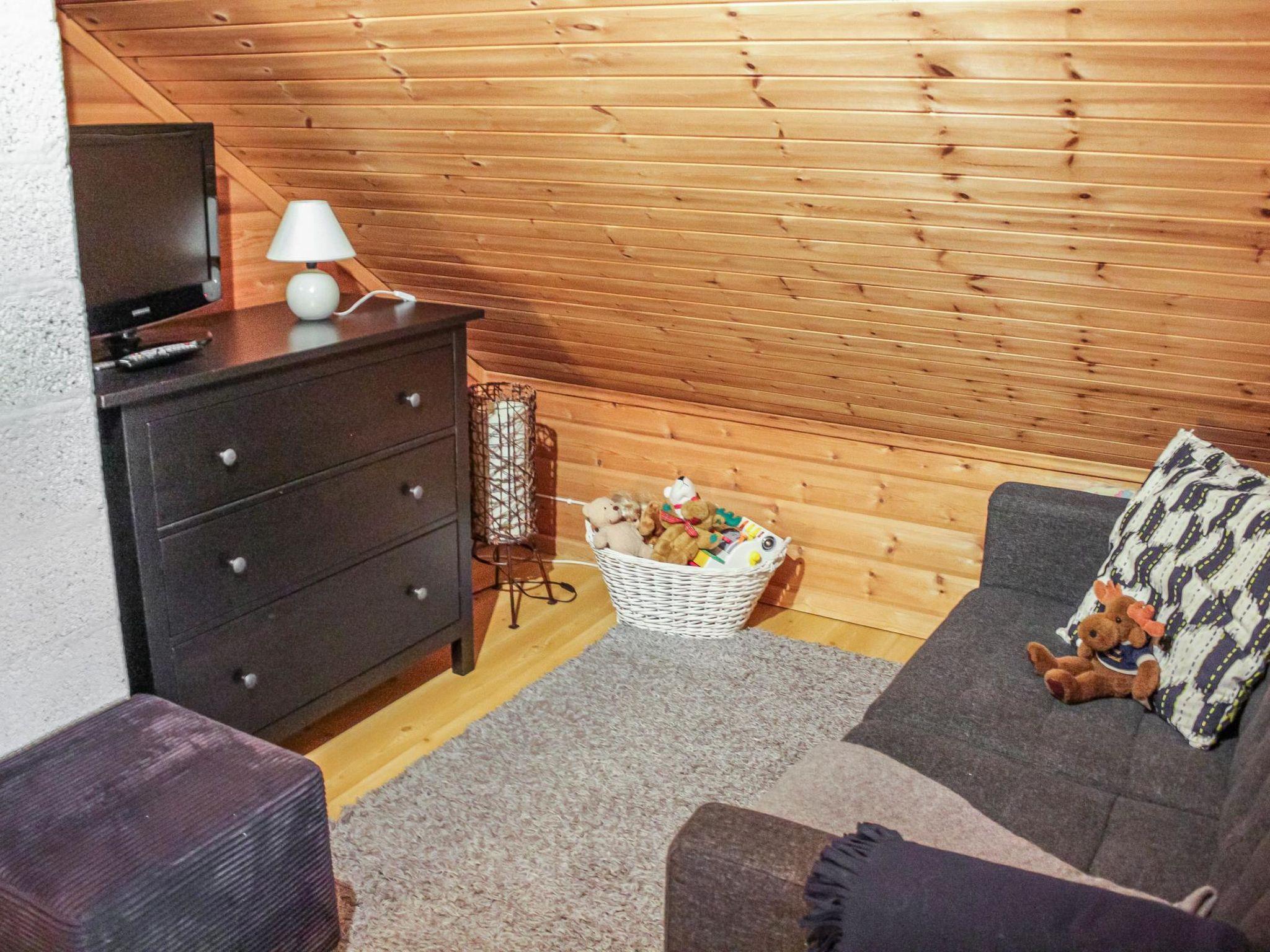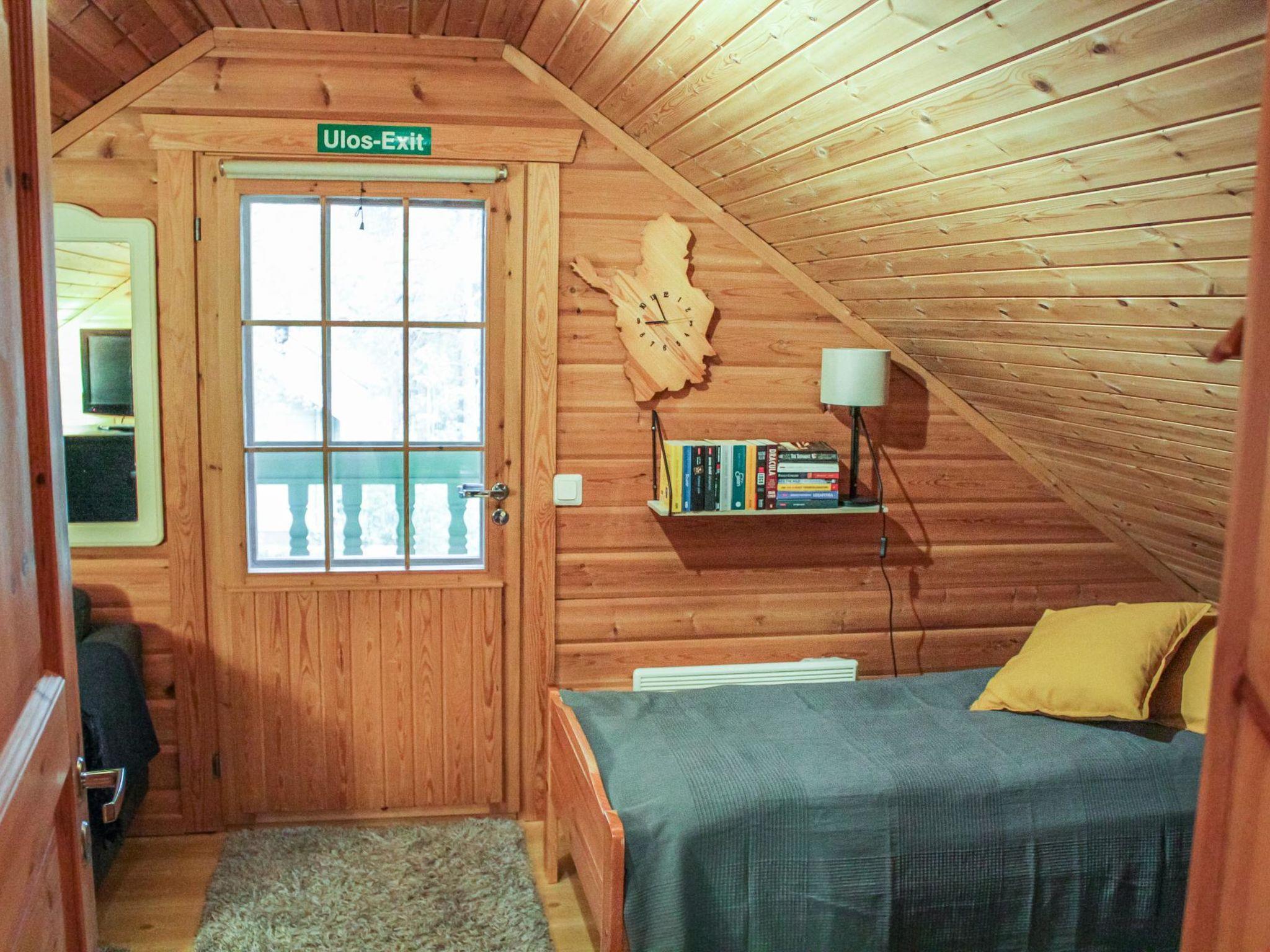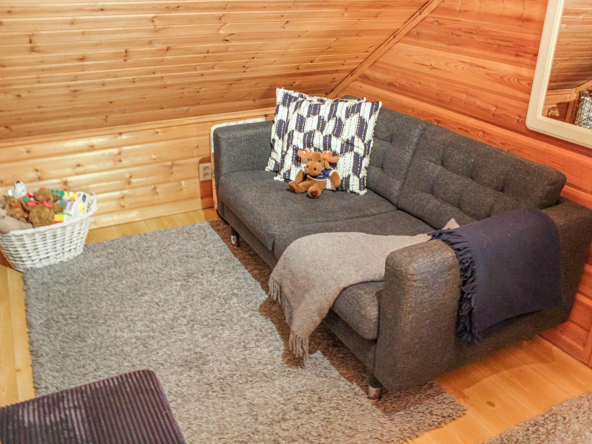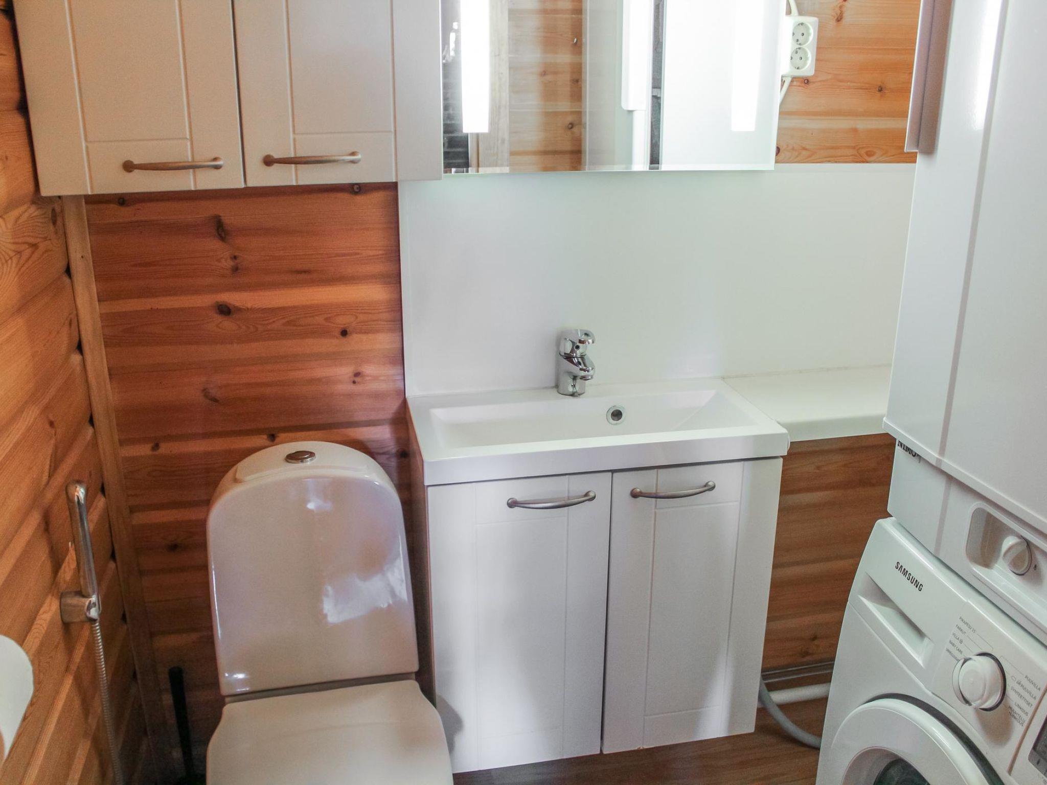 Downstairs well equipped kitchen, lounge with fireplace and TV with Chromecast-service. Bedroom with double bed, toilet, sauna (electric stove) and washroom.
