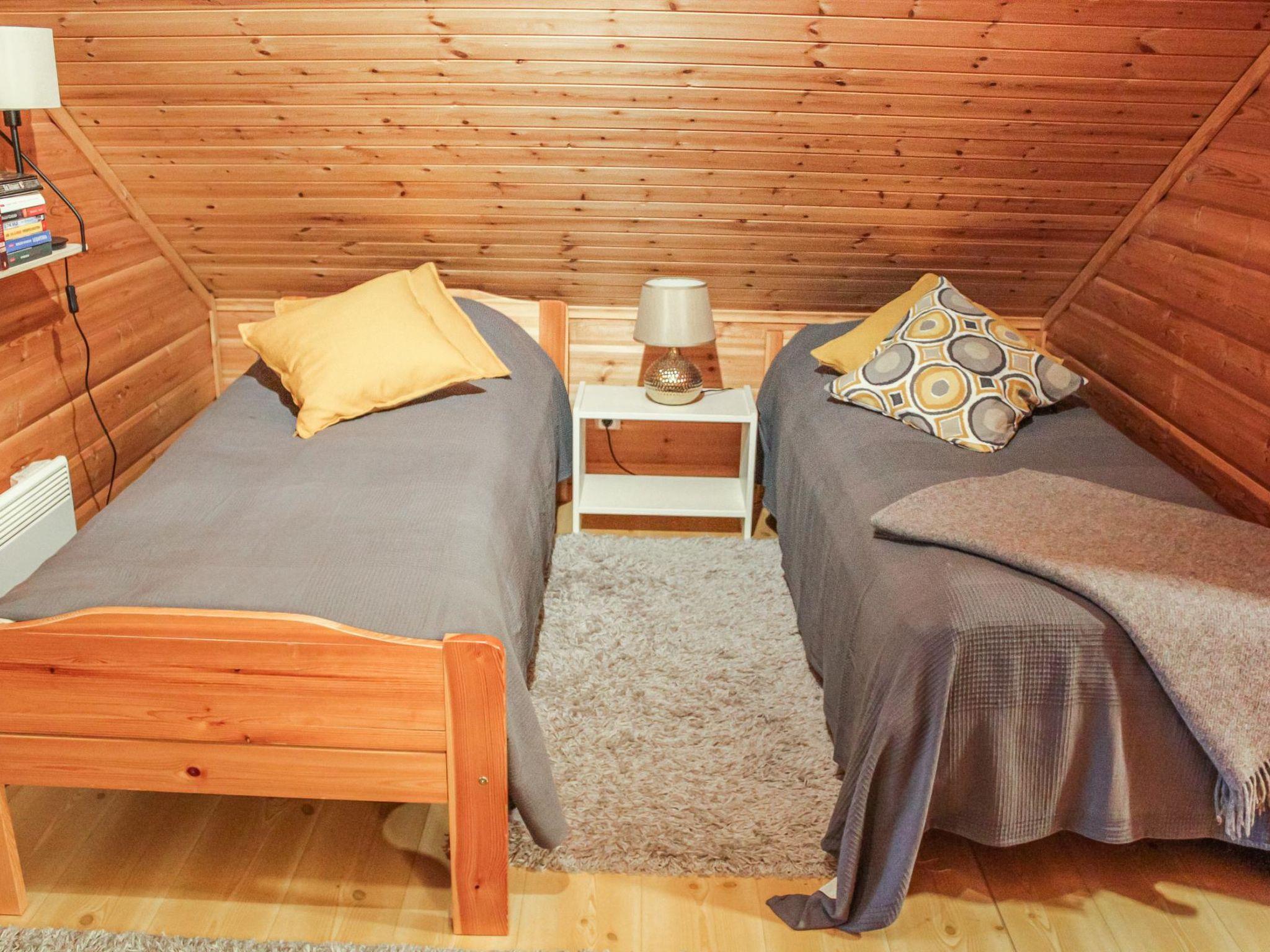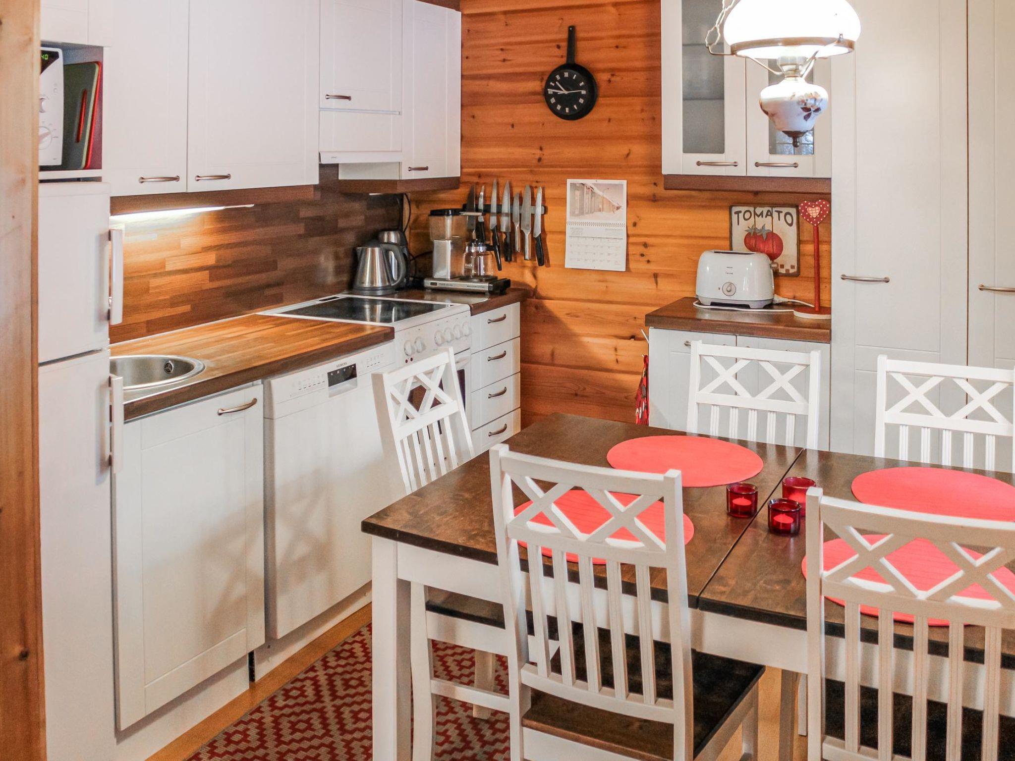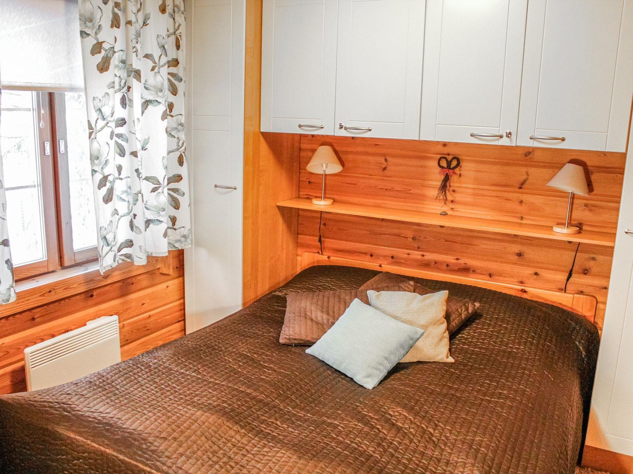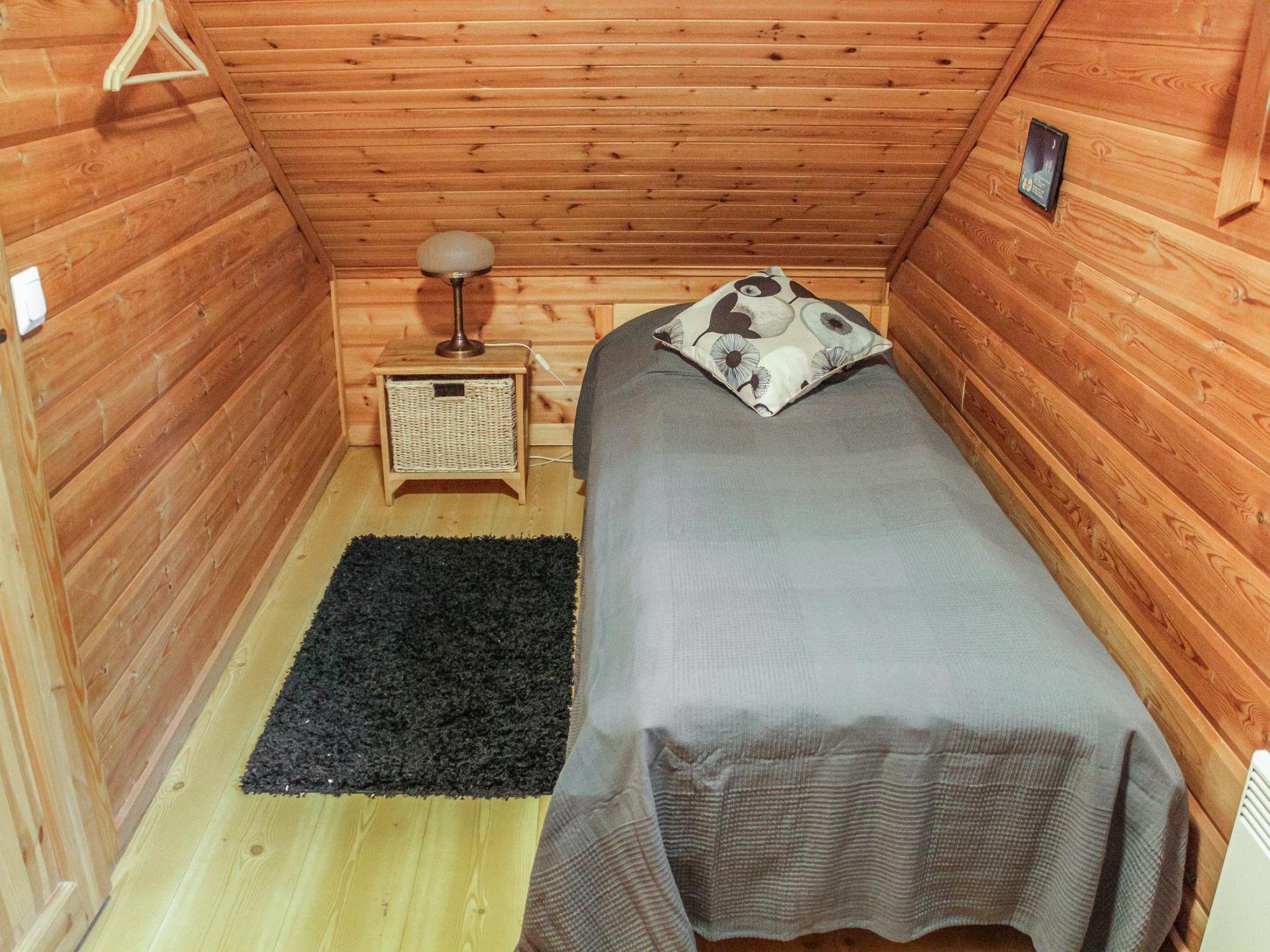 Downstairs well equipped kitchen, lounge with fireplace and TV with Chromecast-service. Bedroom with double bed, toilet, sauna (electric stove) and washroom.