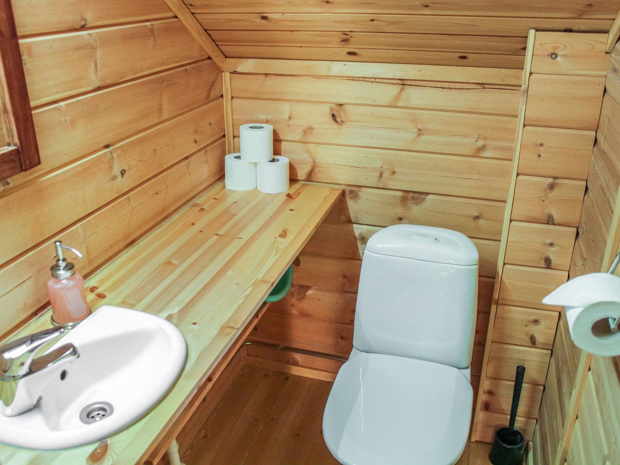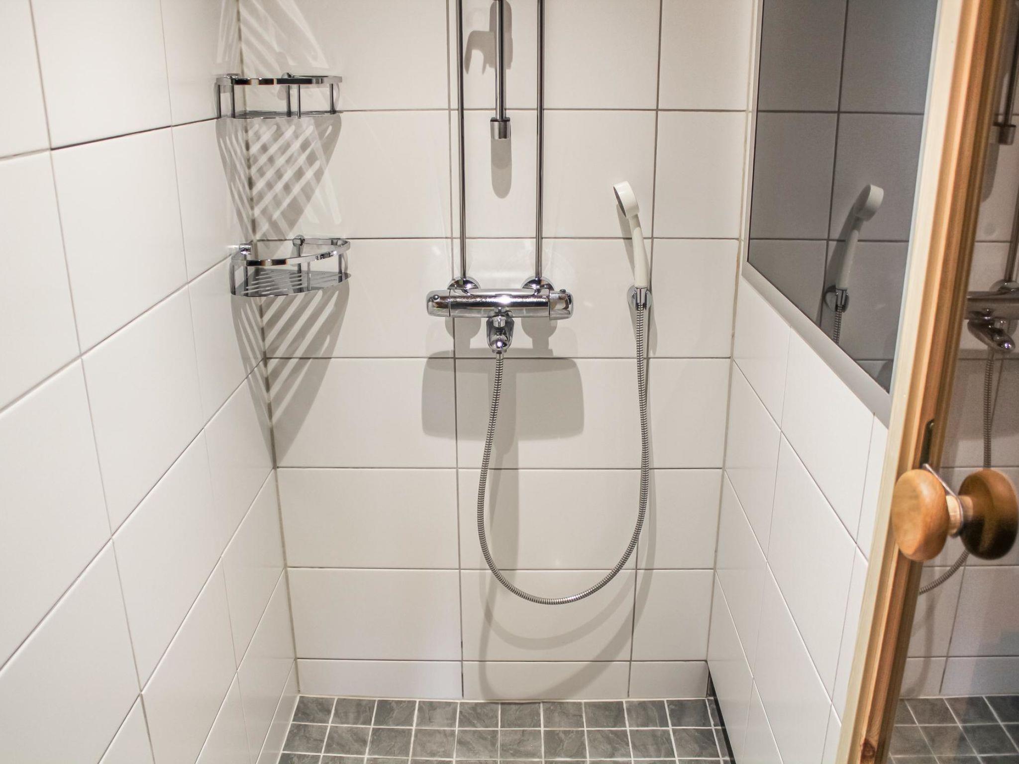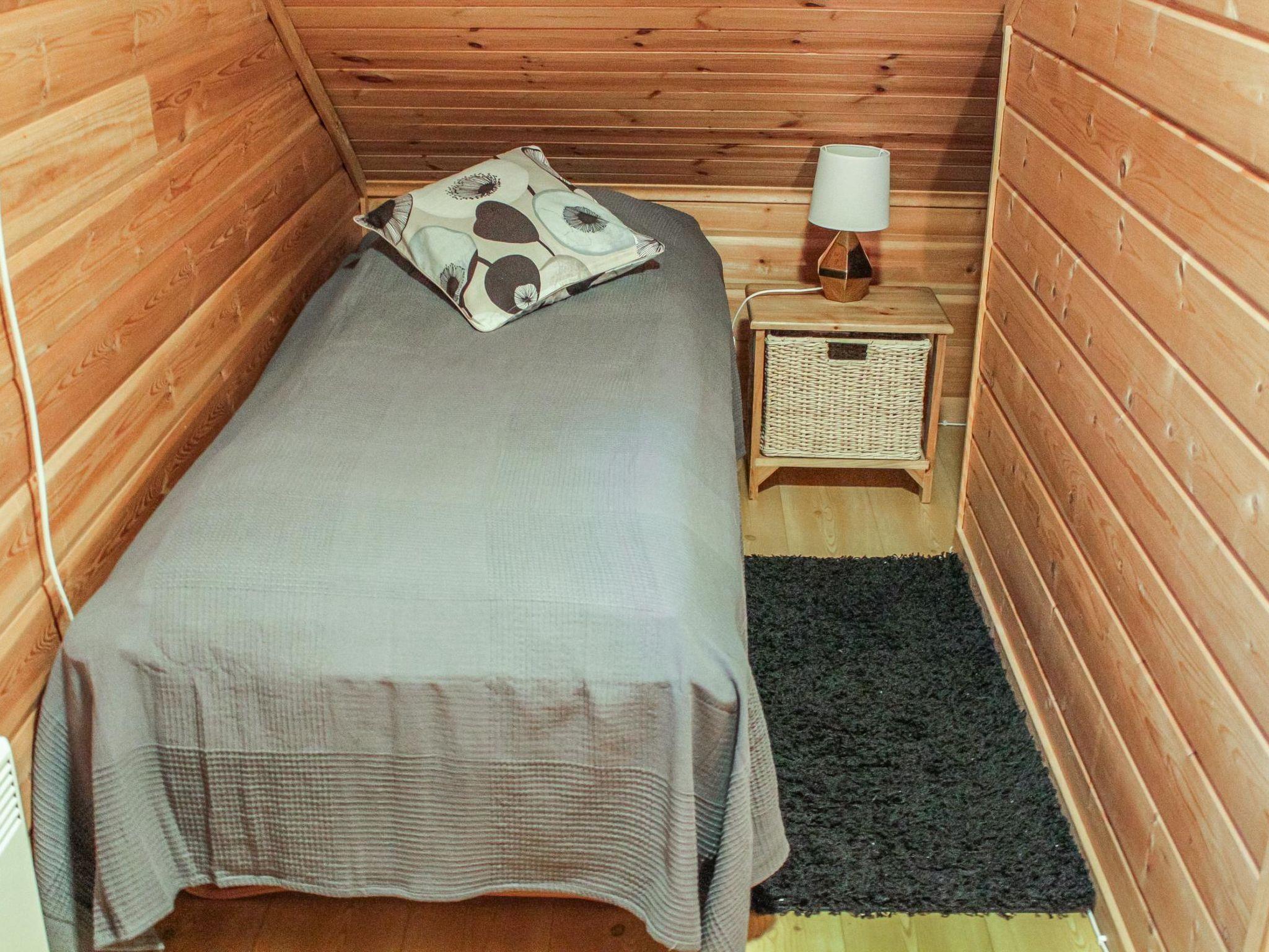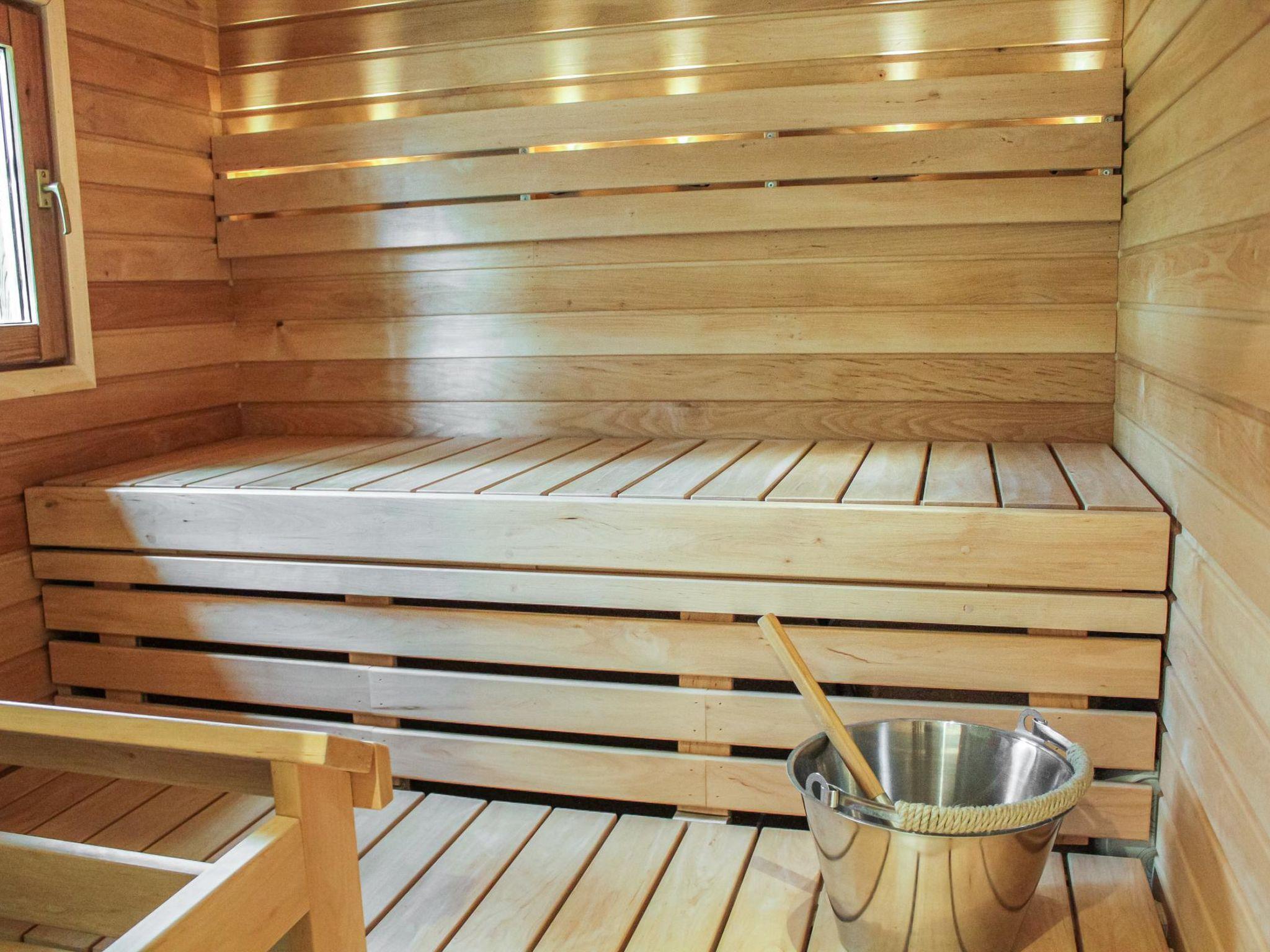 Downstairs well equipped kitchen, lounge with fireplace and TV with Chromecast-service. Bedroom with double bed, toilet, sauna (electric stove) and washroom.