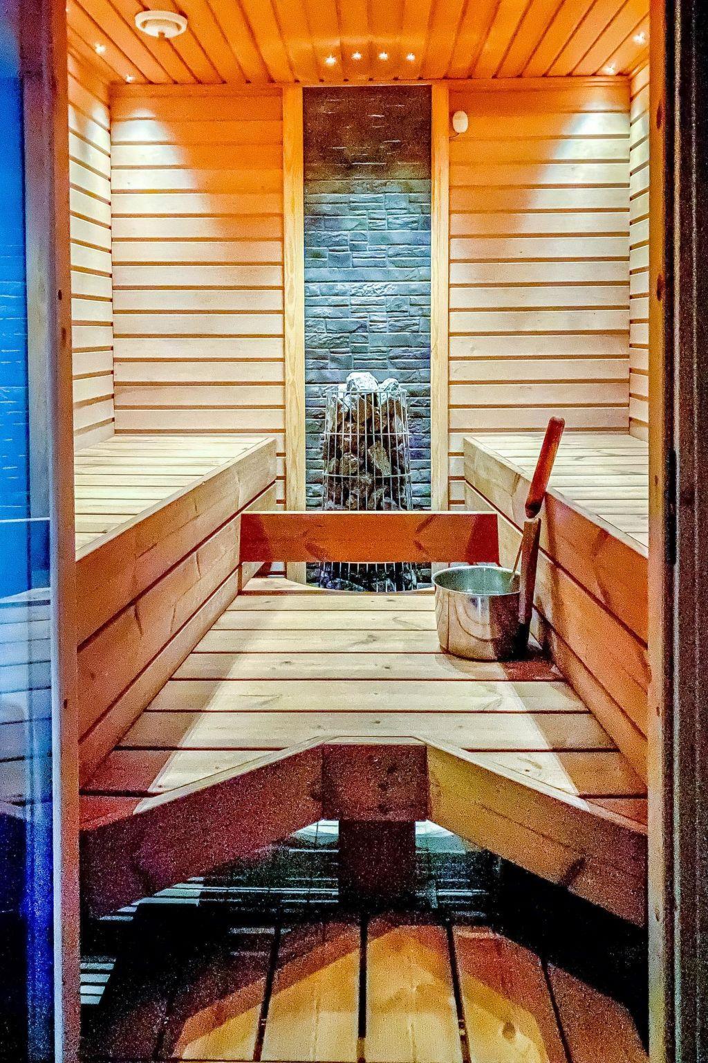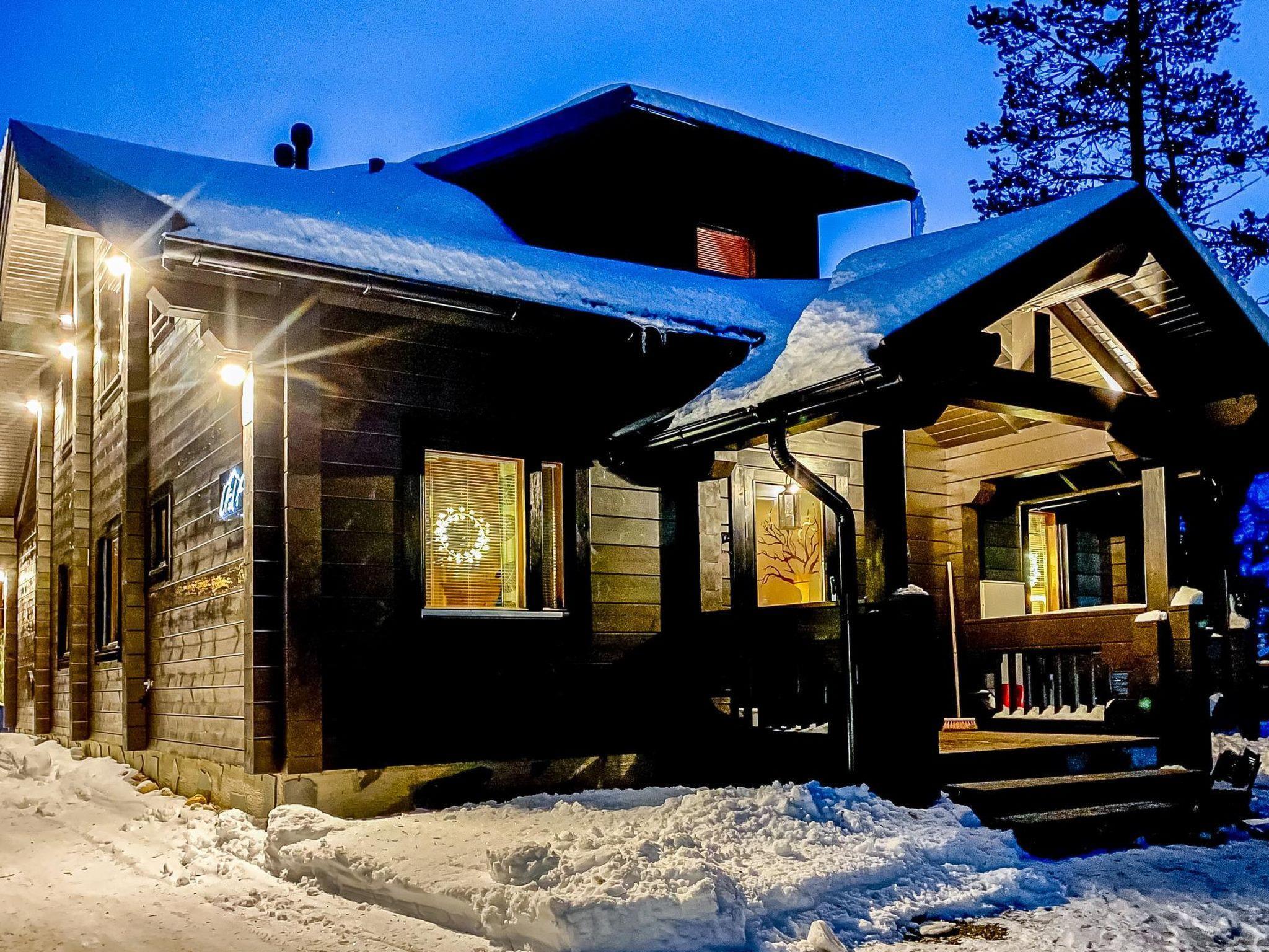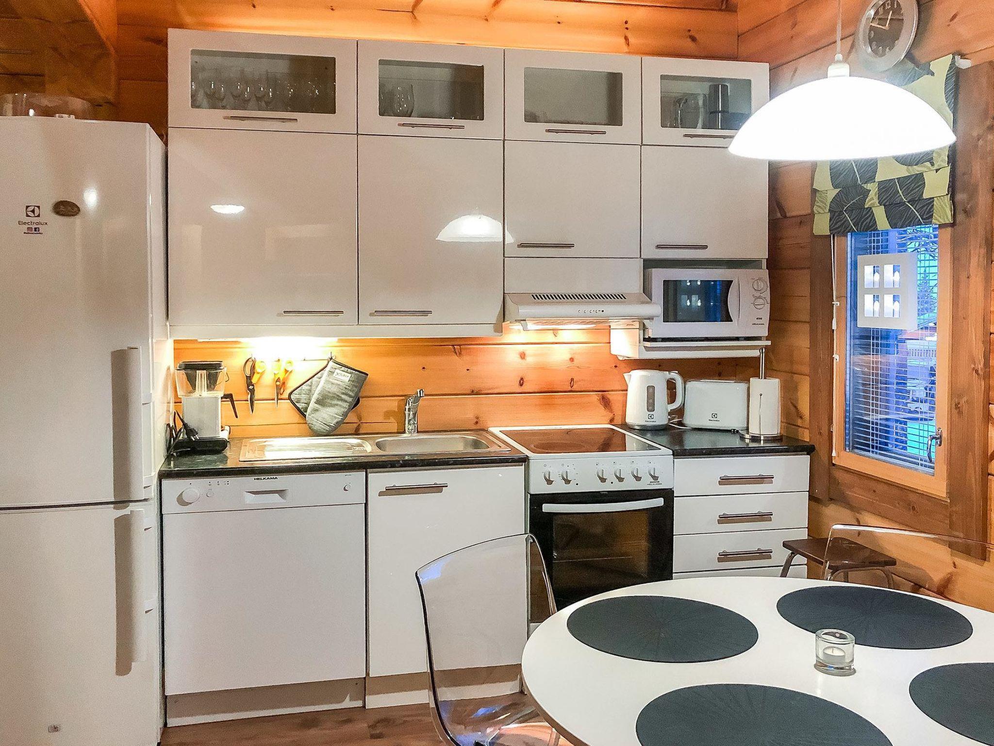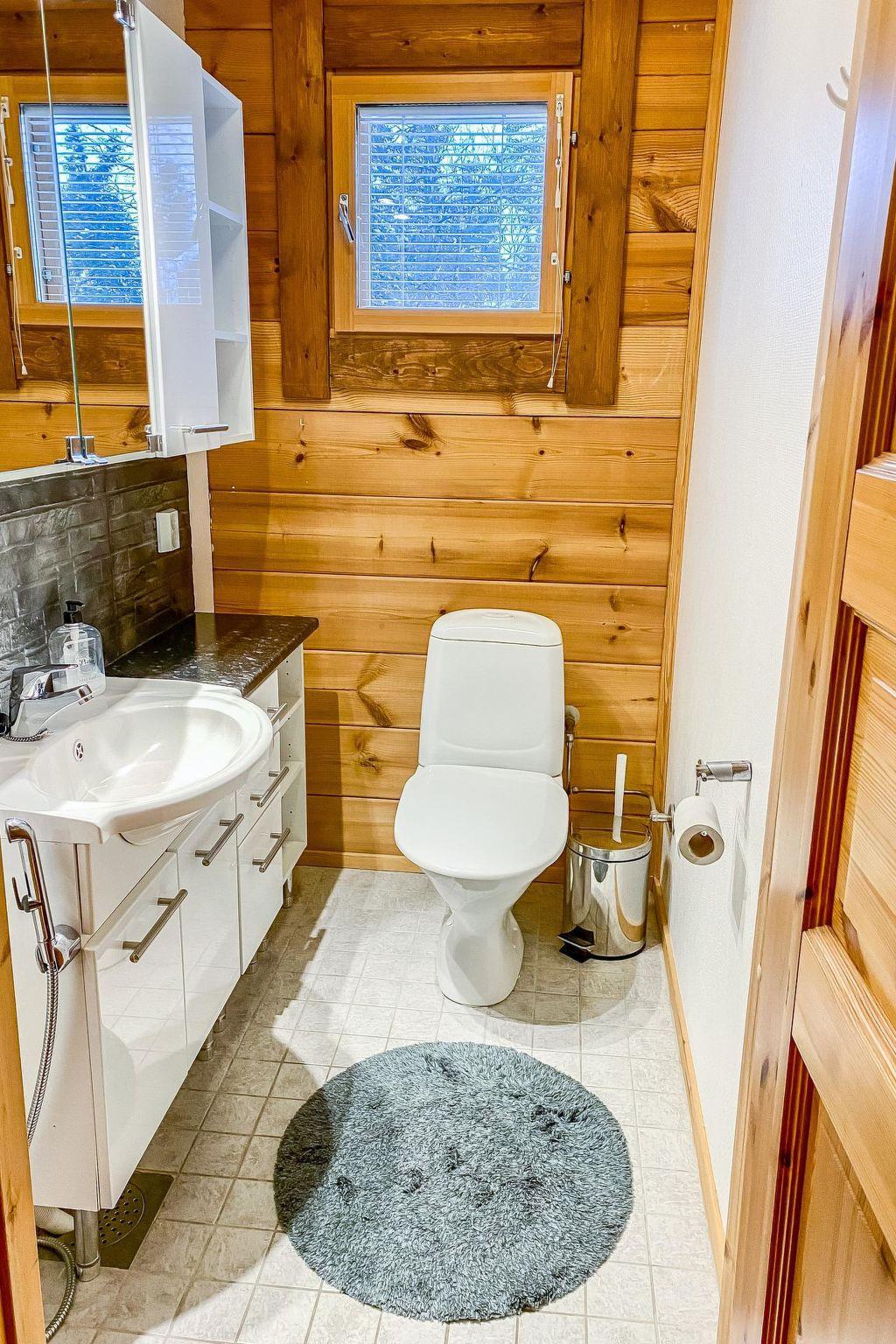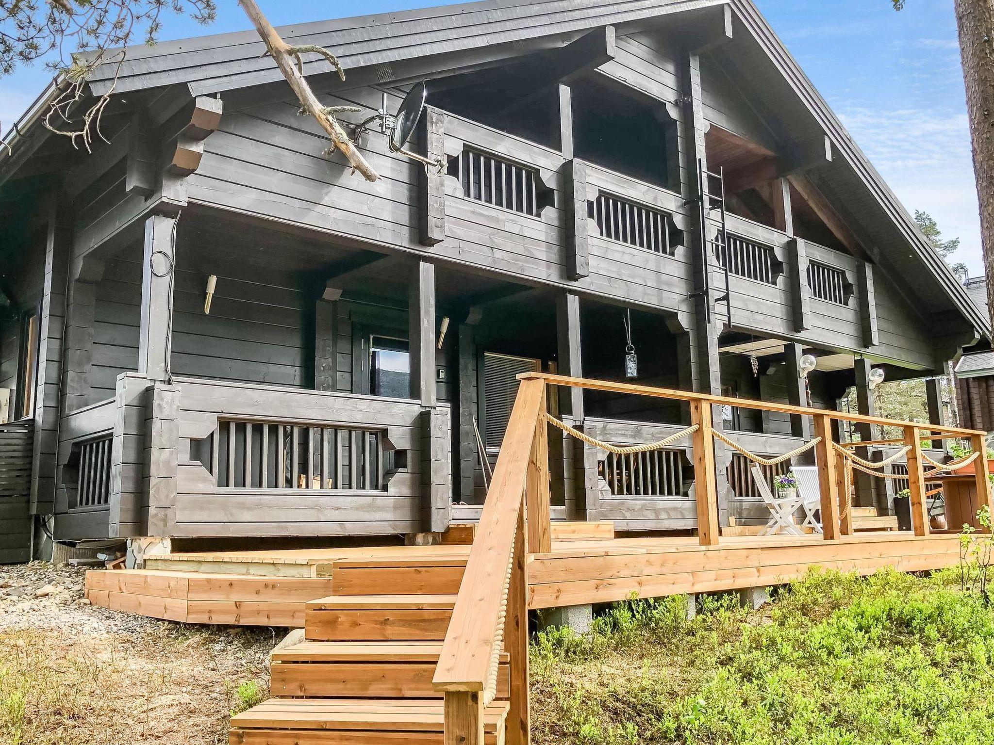 Half of (= apartment in) semi-detached log unit, panelled interior, 2008, living room/kitchen, bedroom double bed, bedroom 1 bed, sauna (electric stove), washroom (2 showers). Upstairs: sofa bed for 1-2 persons, sleeping alcove 2 beds, WC also upstairs, balcony, open porch.