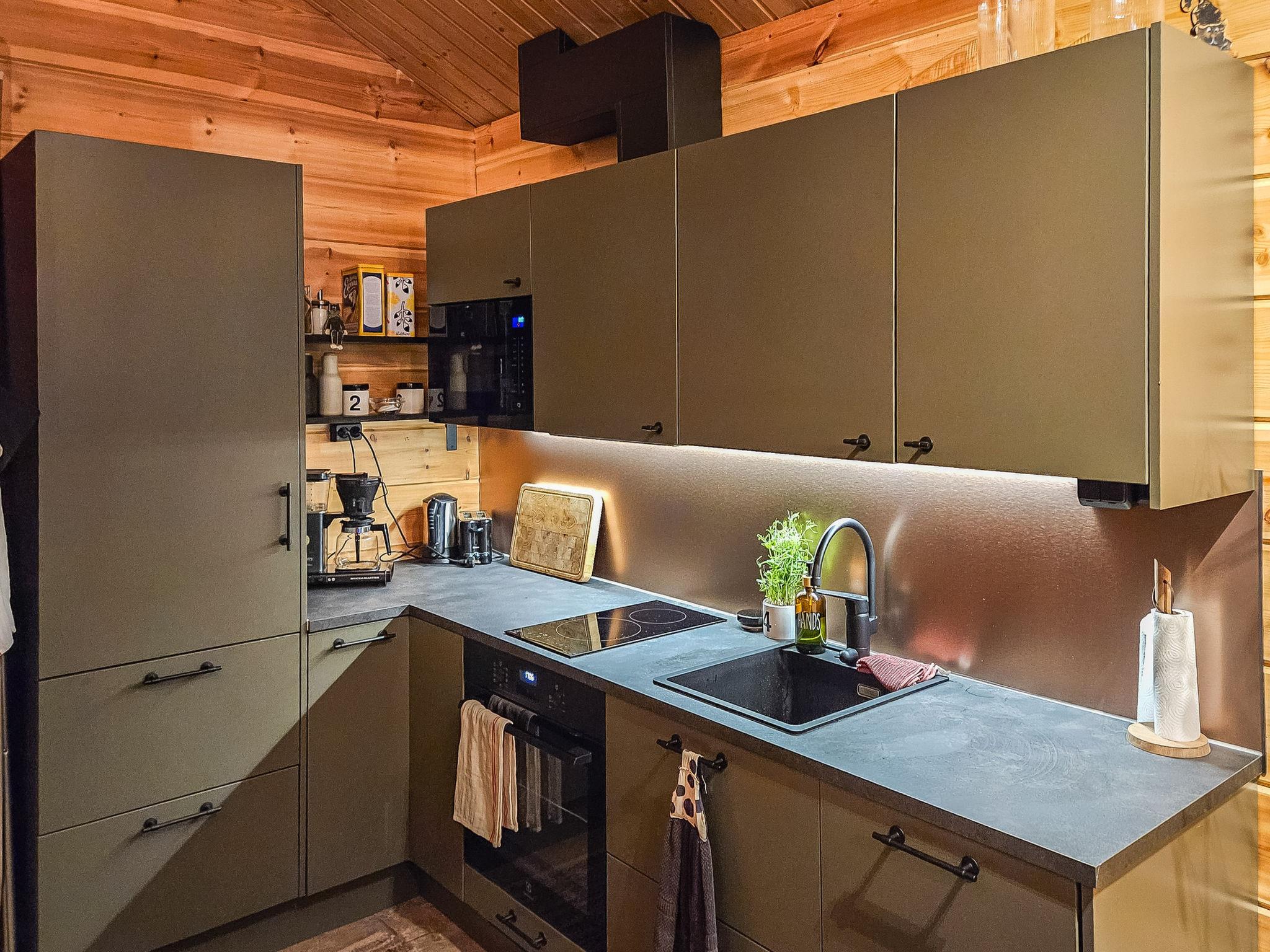 Semi-detached house, inside paneled, built in 2006. Downstairs kitchen, bedroom with 2 single beds, sauna (electric stove), washroom / toilet, open porch. Upstairs alcove with 2 single beds and another alcove with 1 single bed (120 cm), toilet also upstairs. 2 TVs.