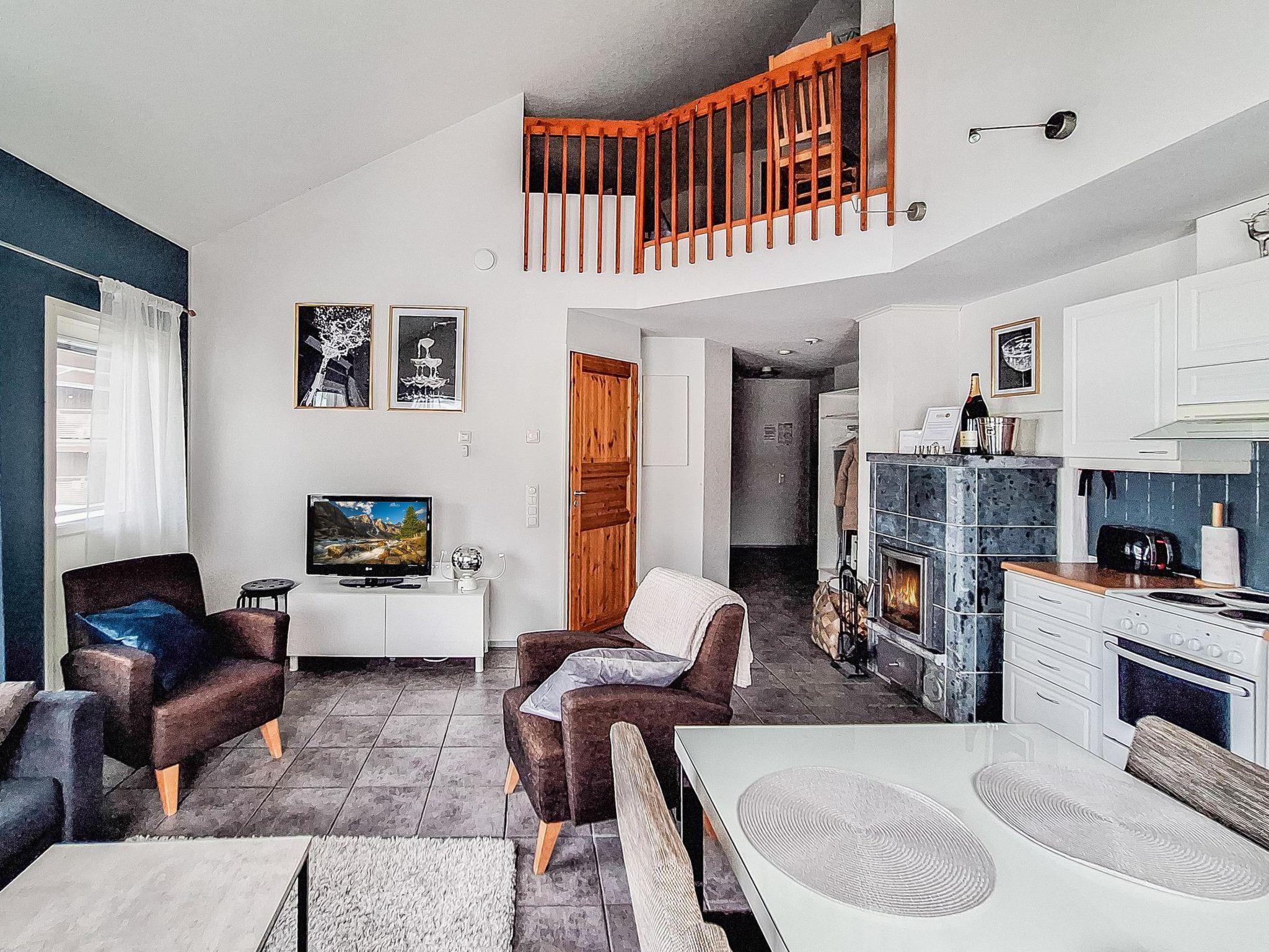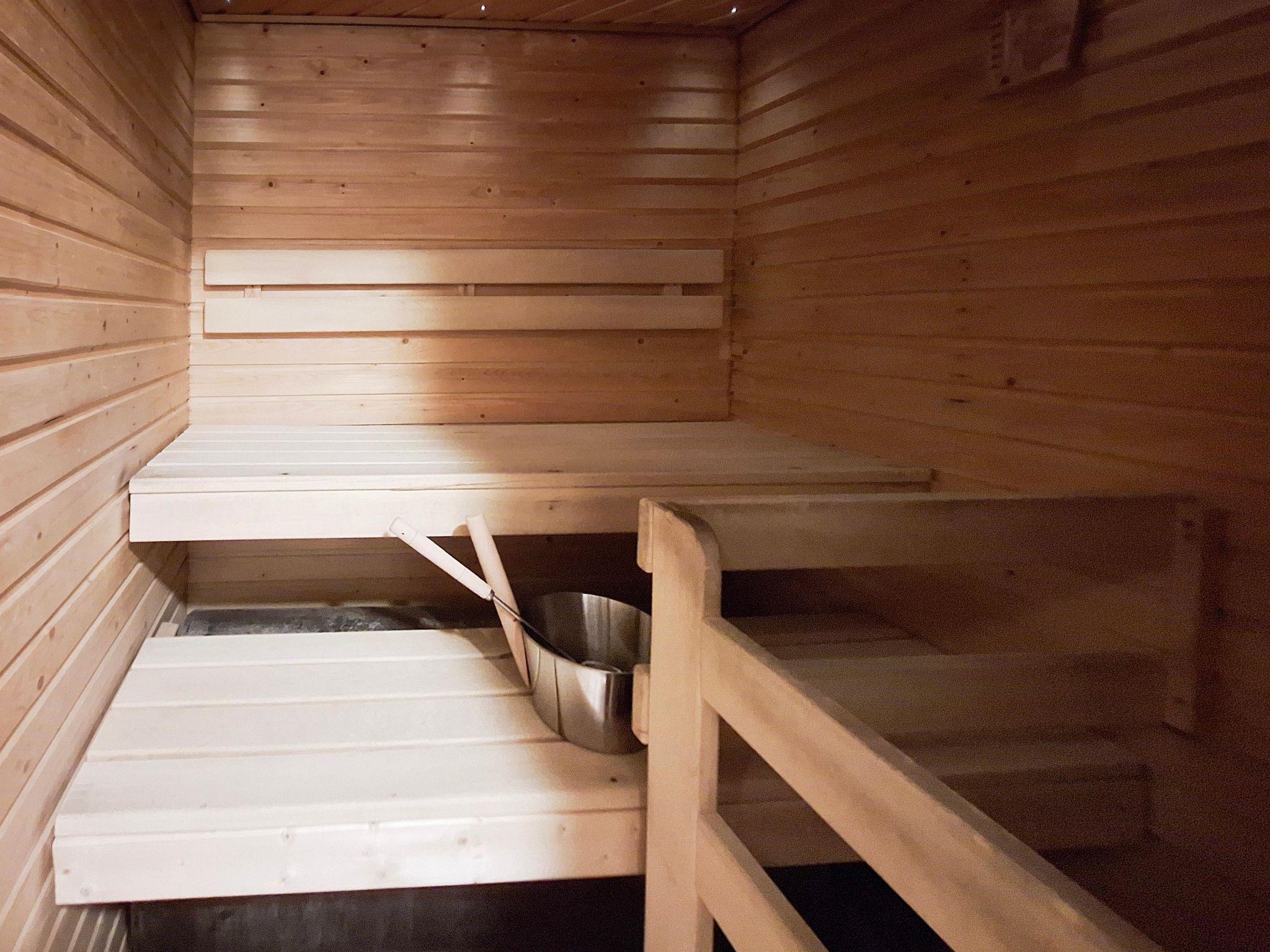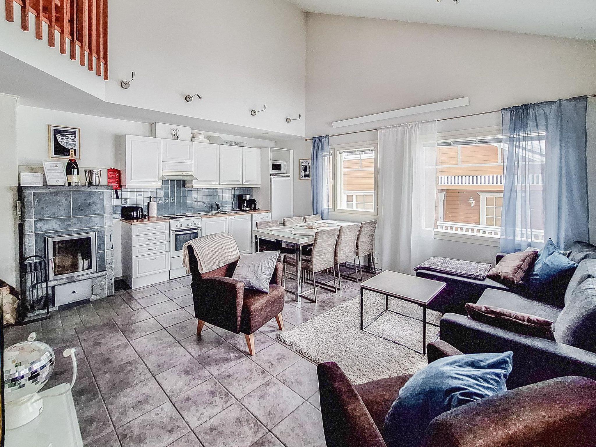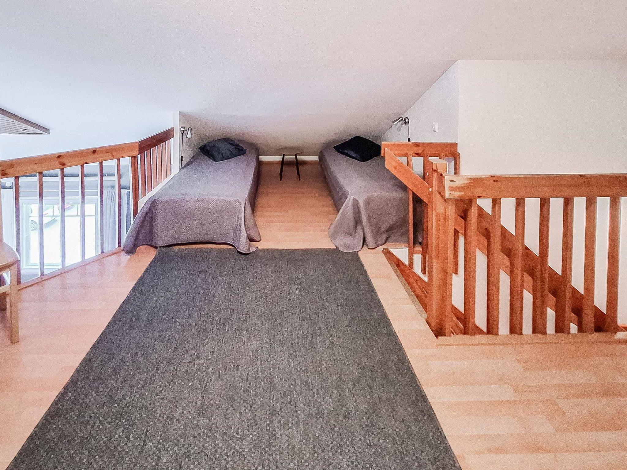 On the ground floor of the apartment: kitchen-living room with sofa bed, bedroom with 2 single beds, toilet and balcony. Upstairs bedroom with 2 single beds and balcony ensuite, sauna, shower room, loft with two single beds, an additional separate toilet.
