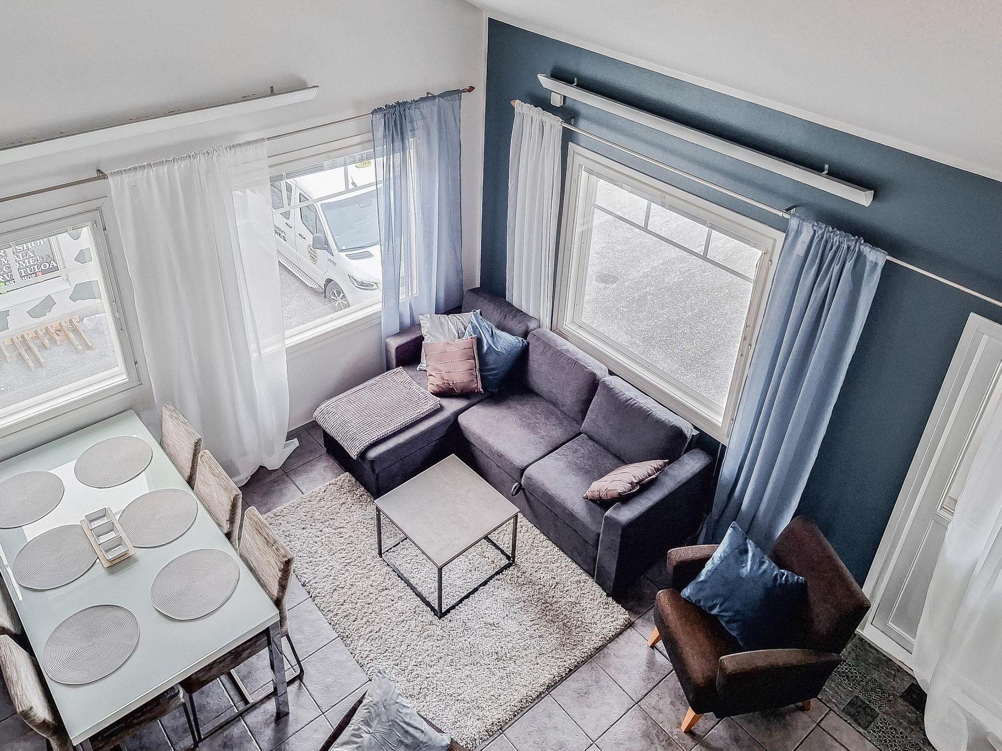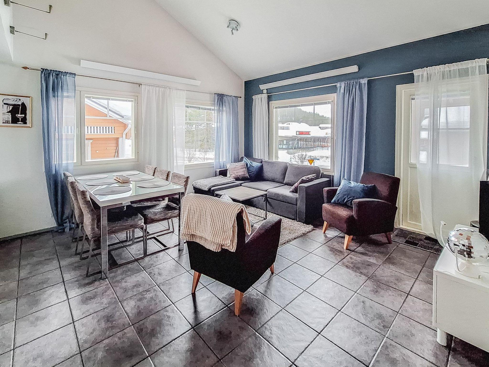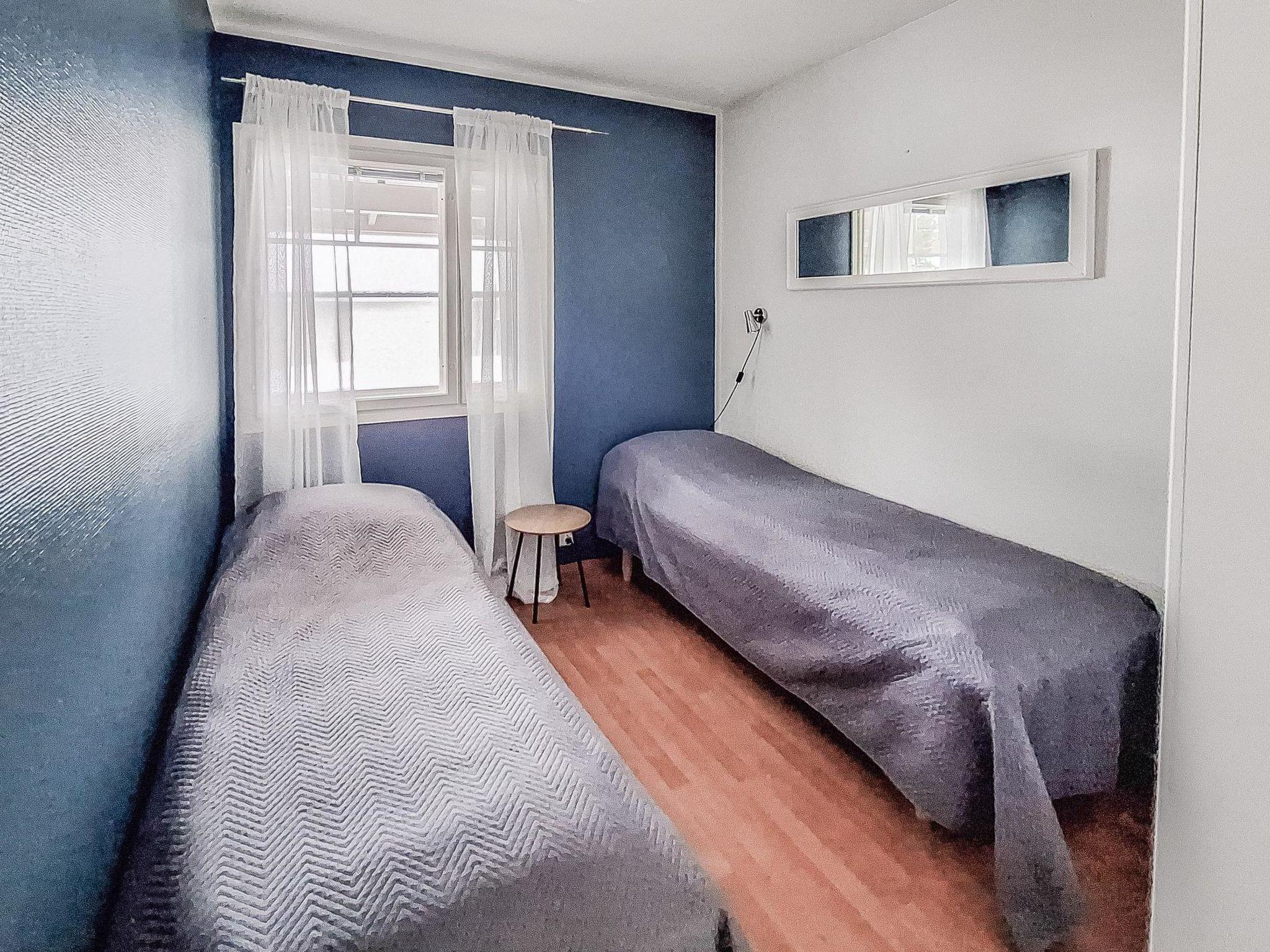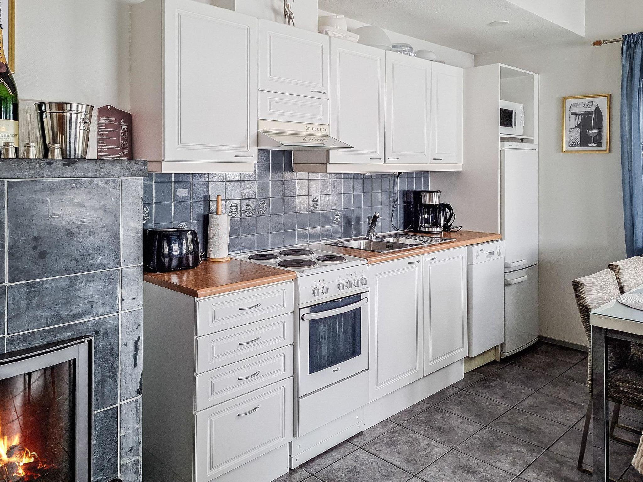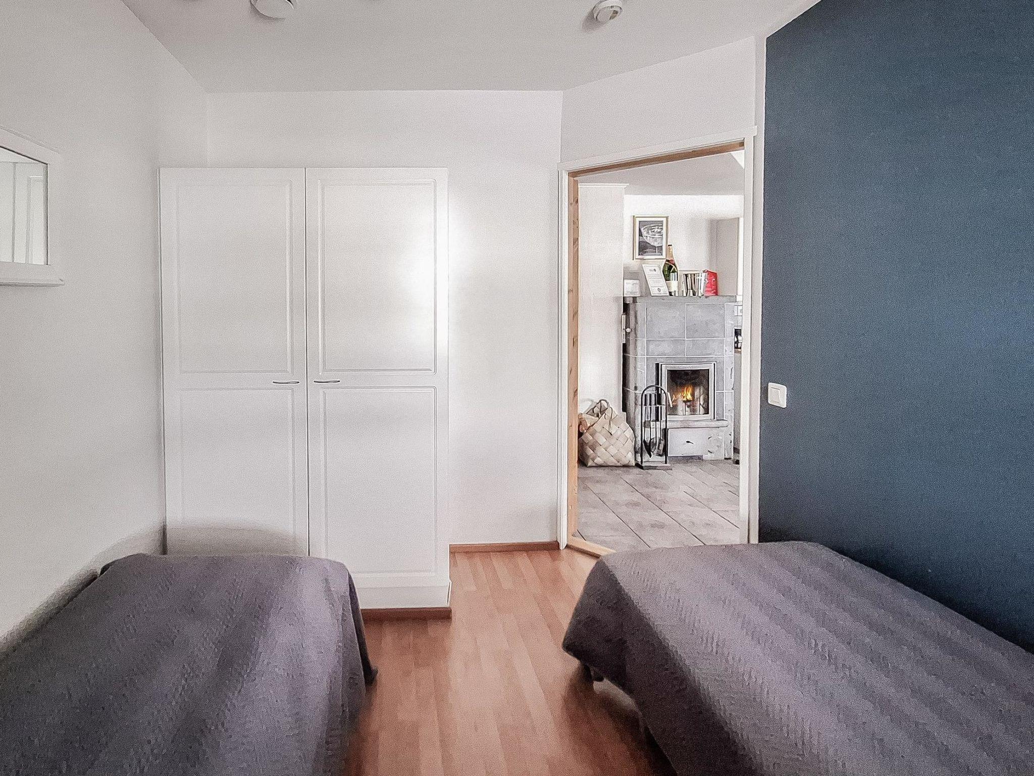 On the ground floor of the apartment: kitchen-living room with sofa bed, bedroom with 2 single beds, toilet and balcony. Upstairs bedroom with 2 single beds and balcony ensuite, sauna, shower room, loft with two single beds, an additional separate toilet.