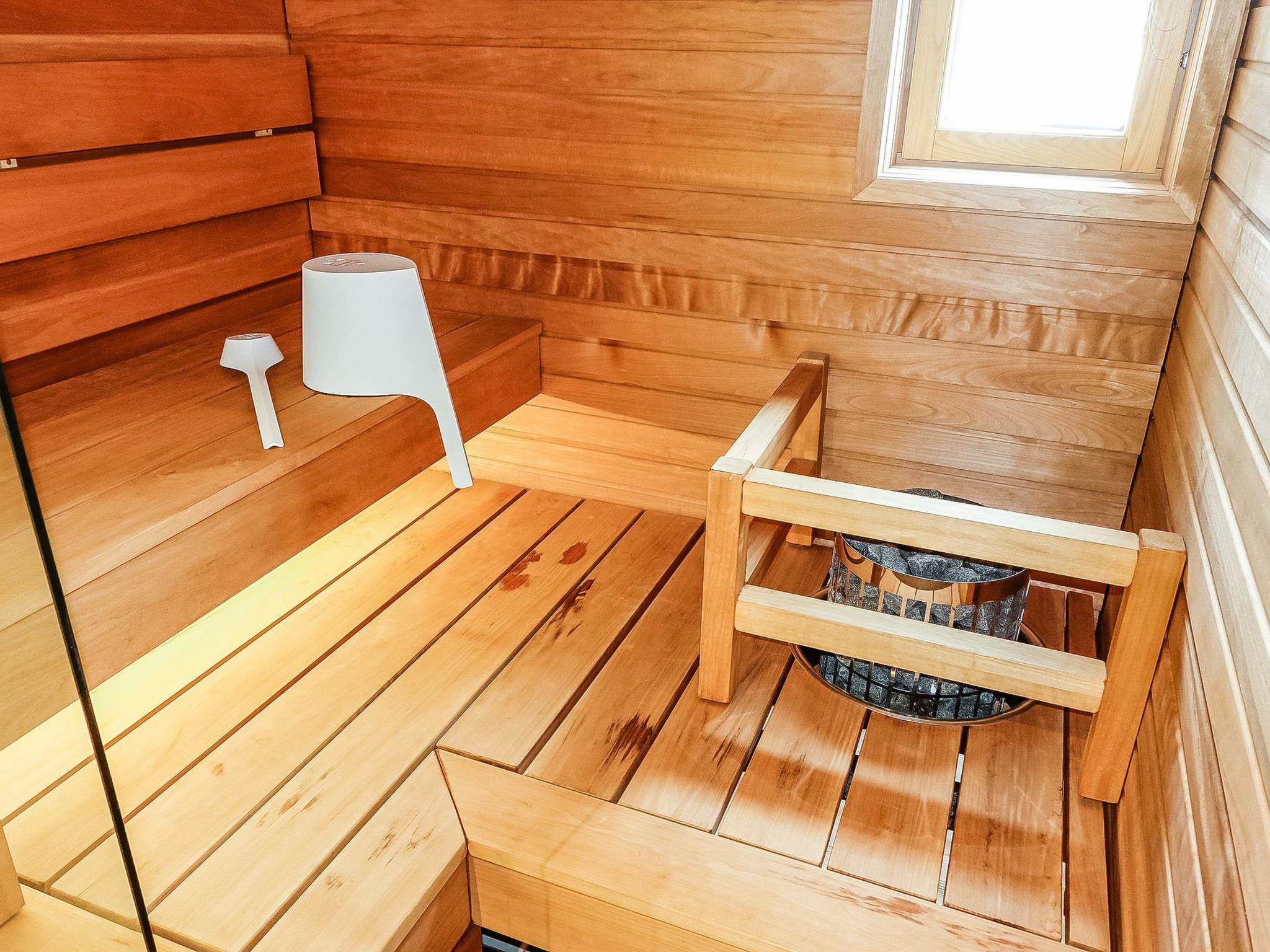 Living room/kitchen with sofa bed, bedroom with 2 beds, sauna, washroom/WC and glazed balcony.