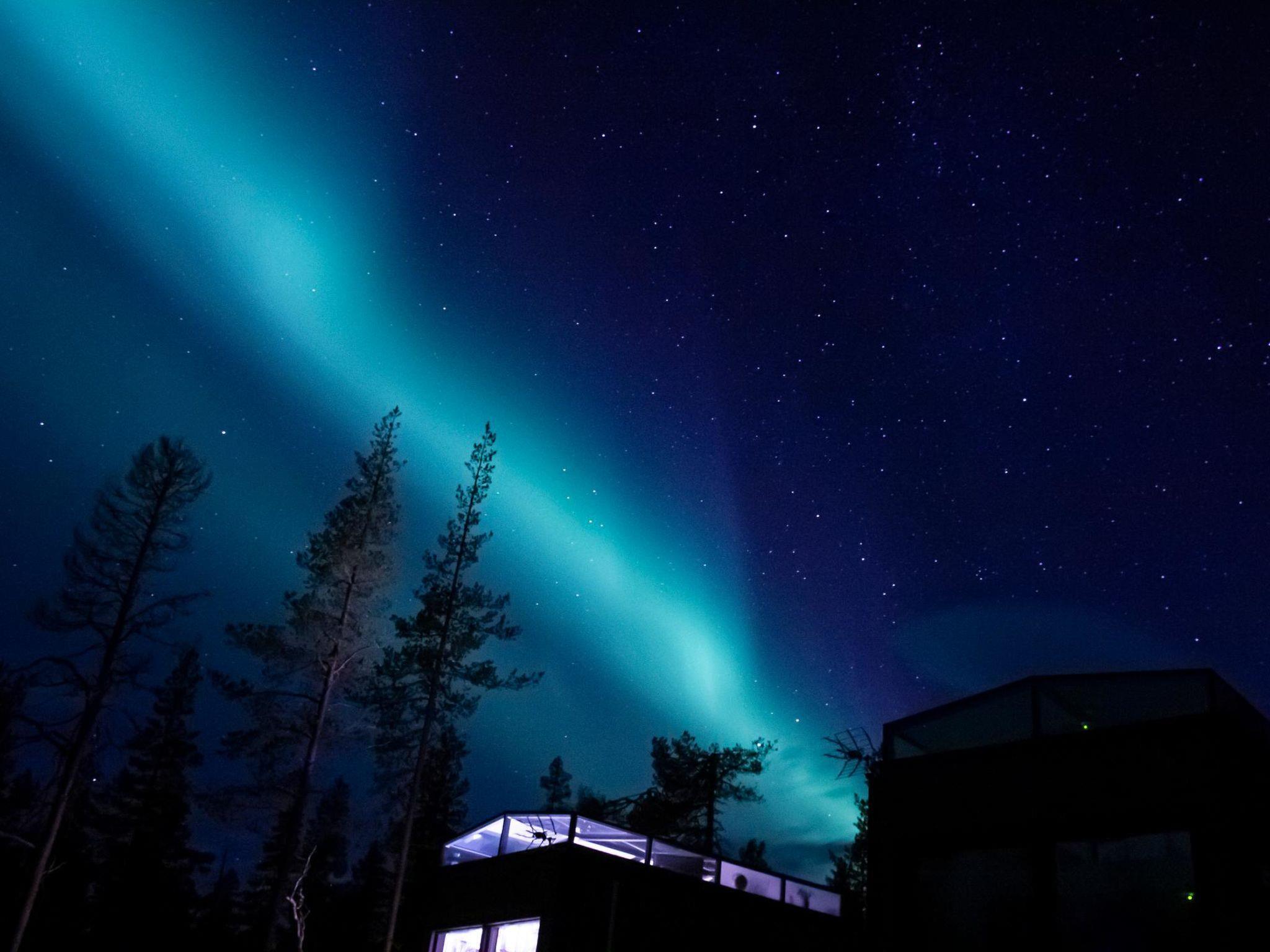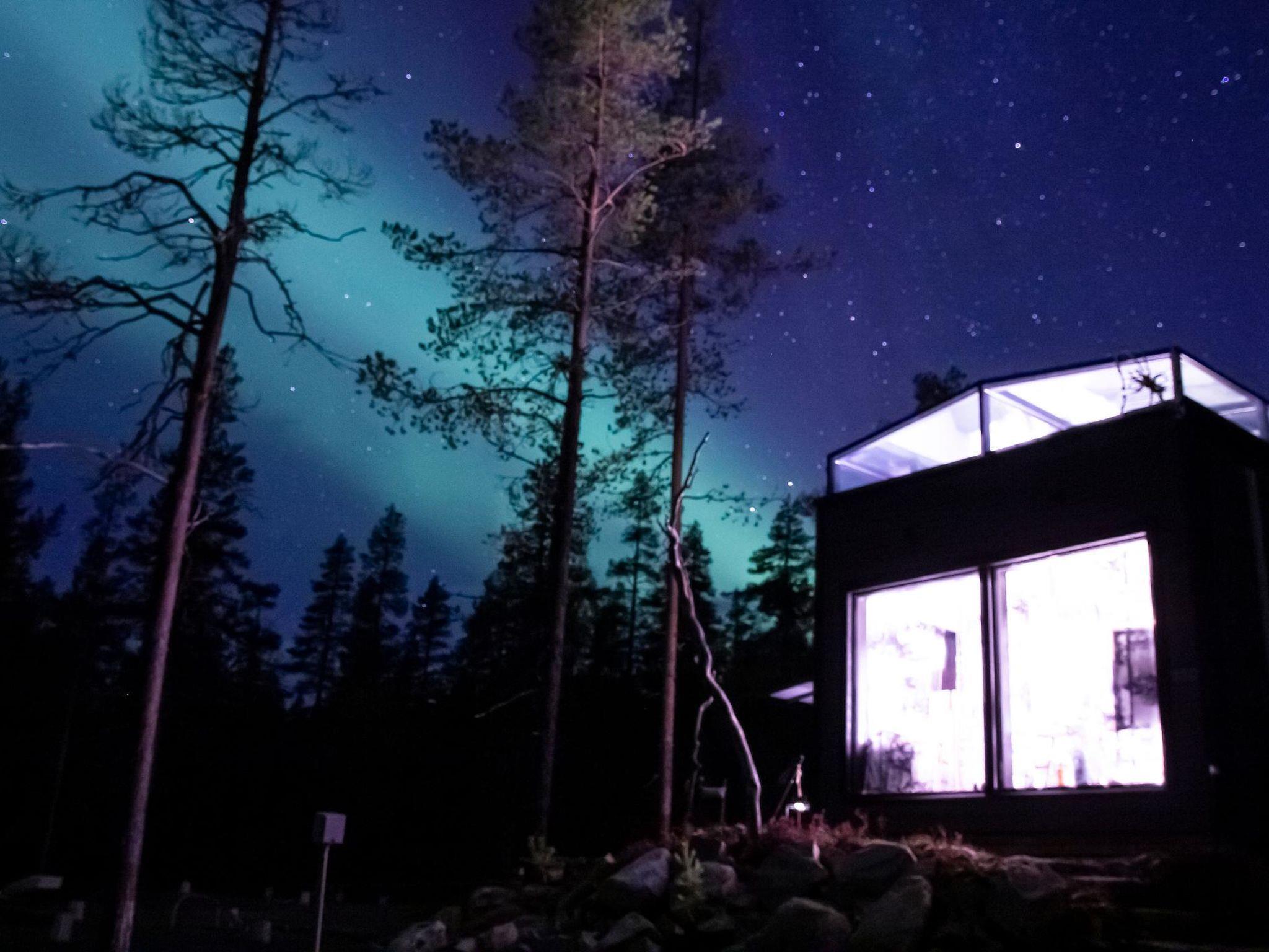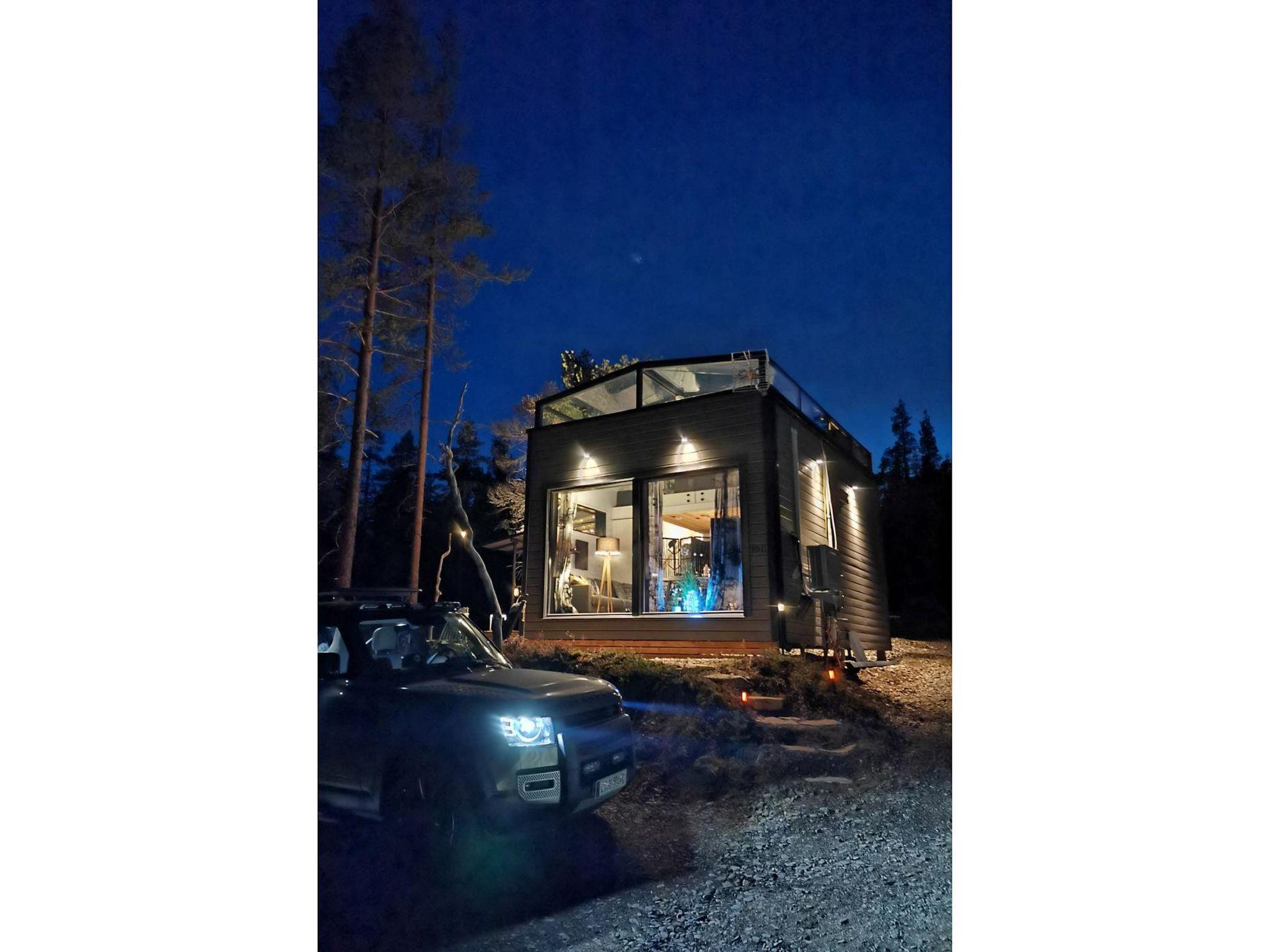 Modern igloo-style cabin with a glass roof. The glass roof is equipped with heating from the inside and outside, so viewing aurora borealis, starry sky and fell scenery is always easy.