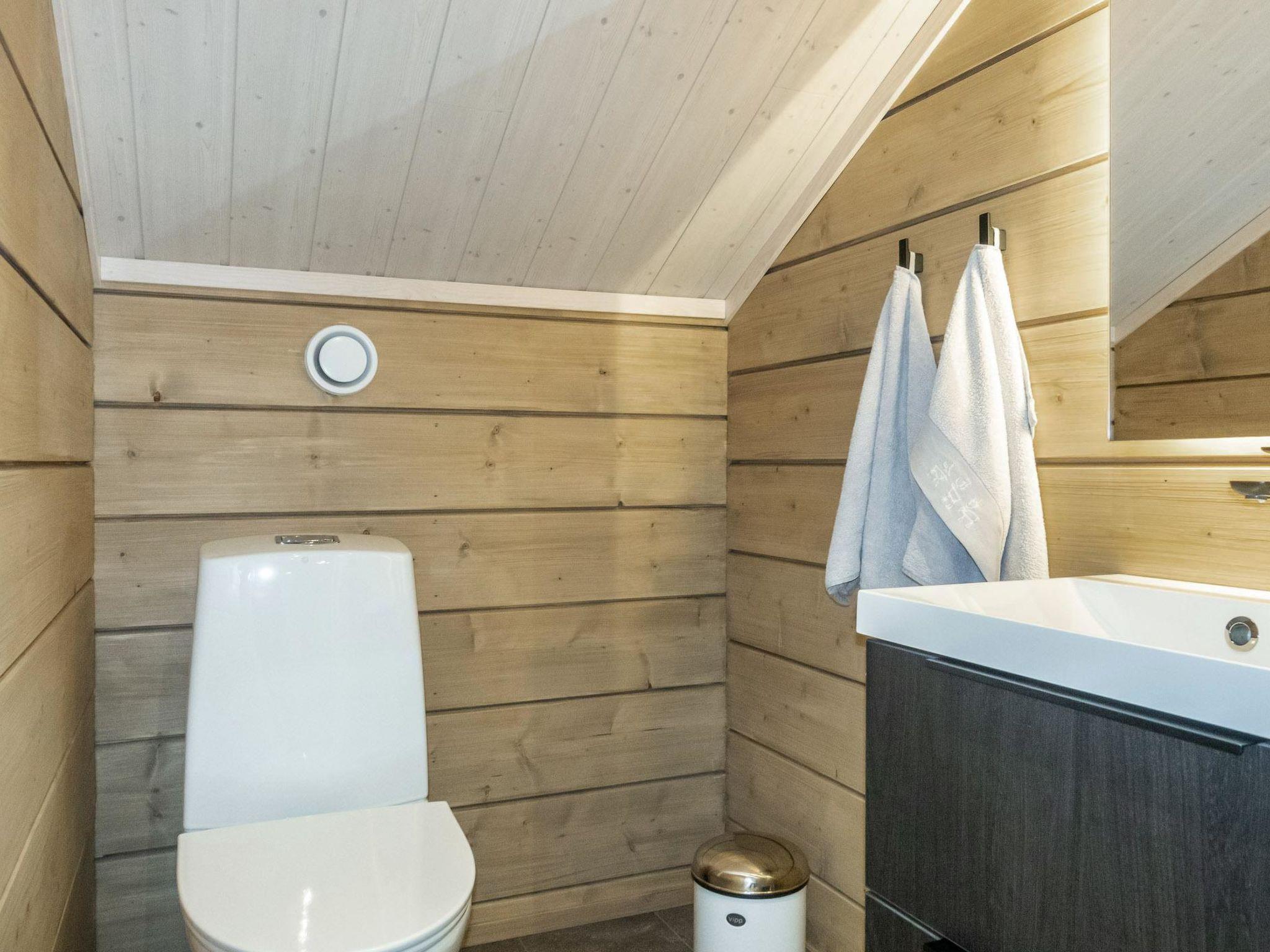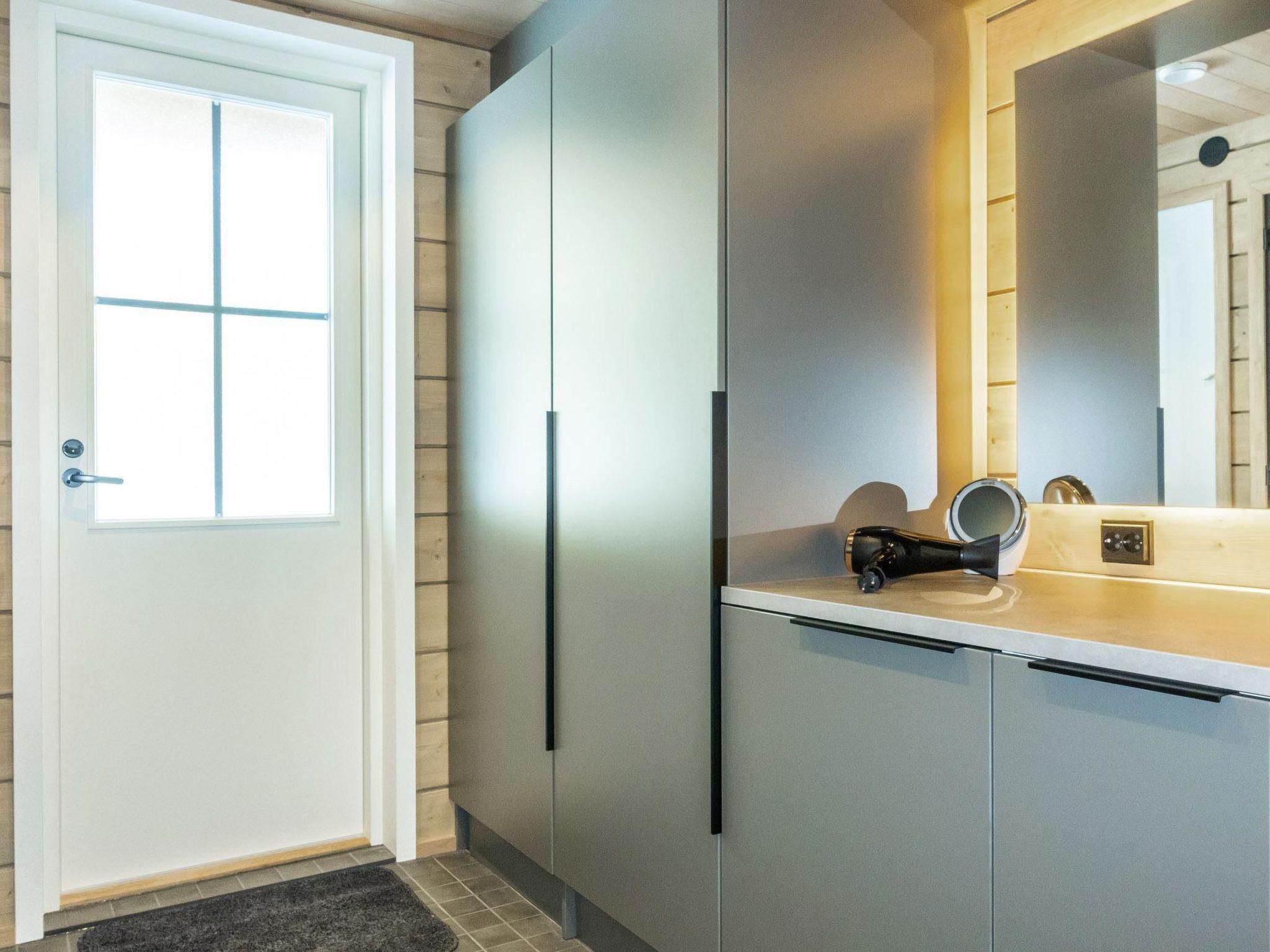 The ground floor (96,8m2) of the villa has a modern open kitchen connected to the living room. Room height in the villa is more than 5 meters. There are large windows facing the forest, making the living area peaceful and private. The living room has a fireplace and 75” TV. In addition, on the ground floor, there are two double bedrooms, a separate WC, wardrobe, sauna, washroom, and utility room. The dressing room has a drying cabinet for outdoor clothes and access to the covered terrace. On the upper floor (26,6 m2), there is a living area with a TV, two double bedrooms, and WC. The villa is equipped with a wireless Internet connection.