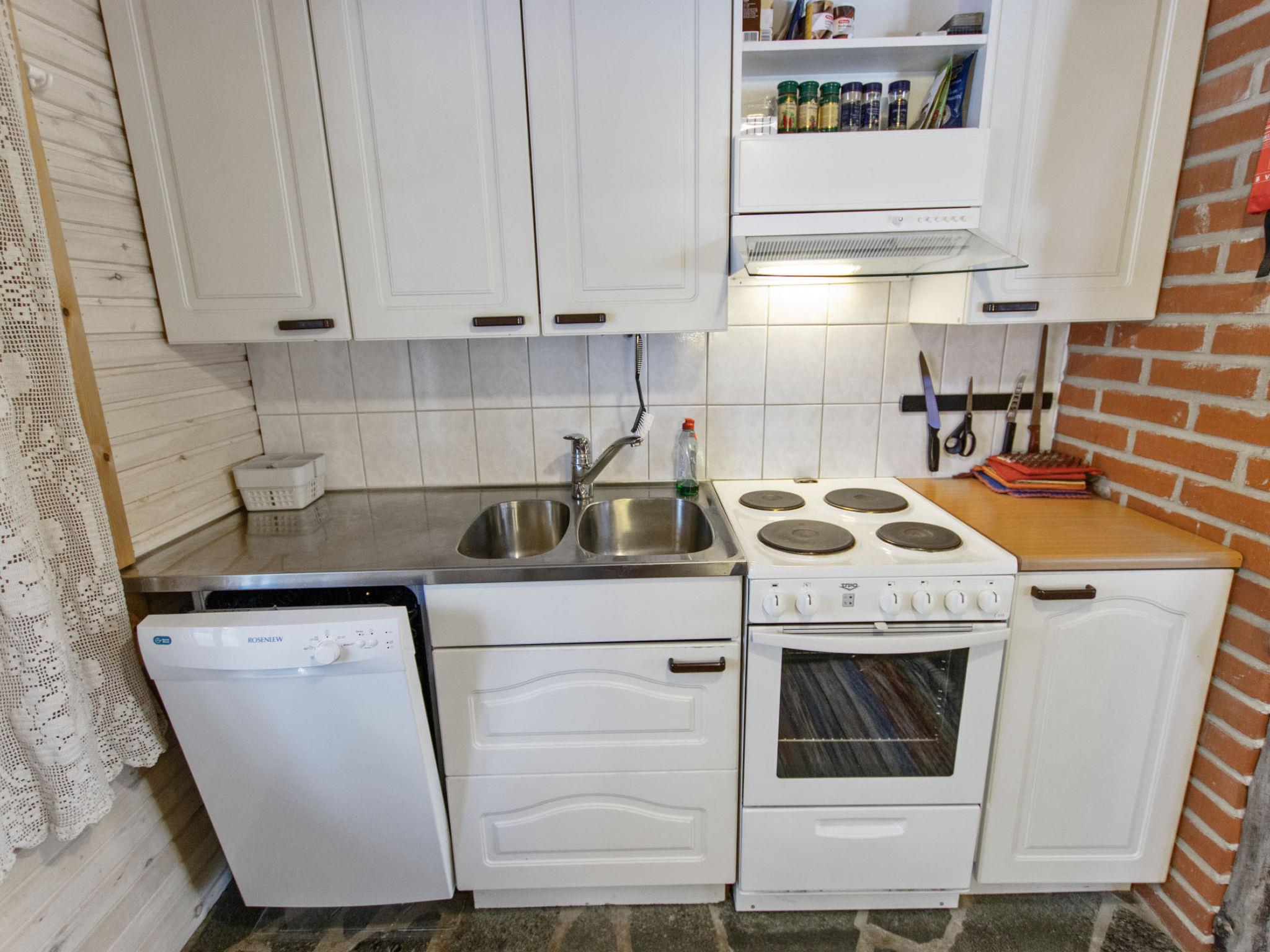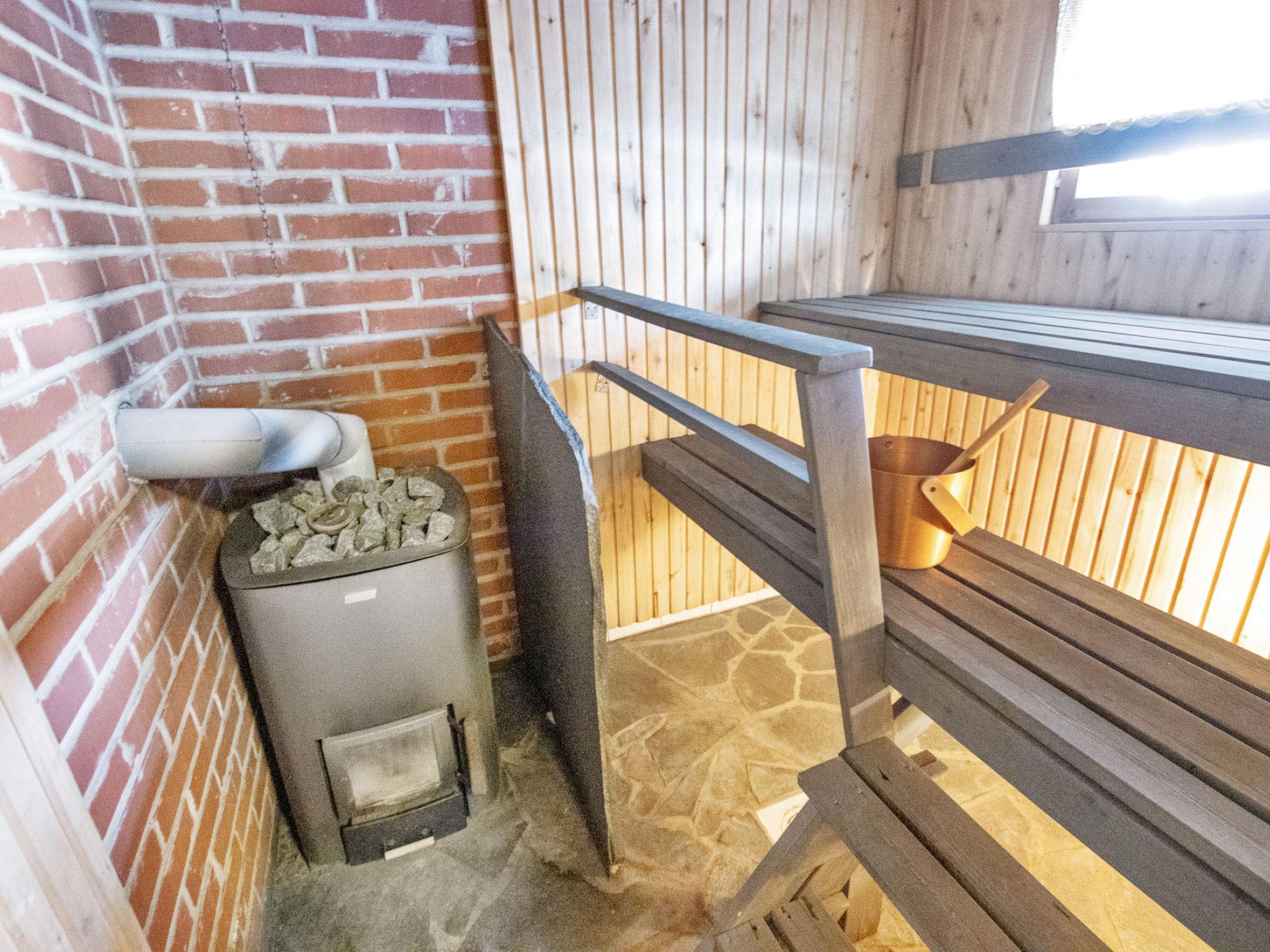 Kitchen and sauna with wood-burning stove. Loft has steep stairs and three mattresses.