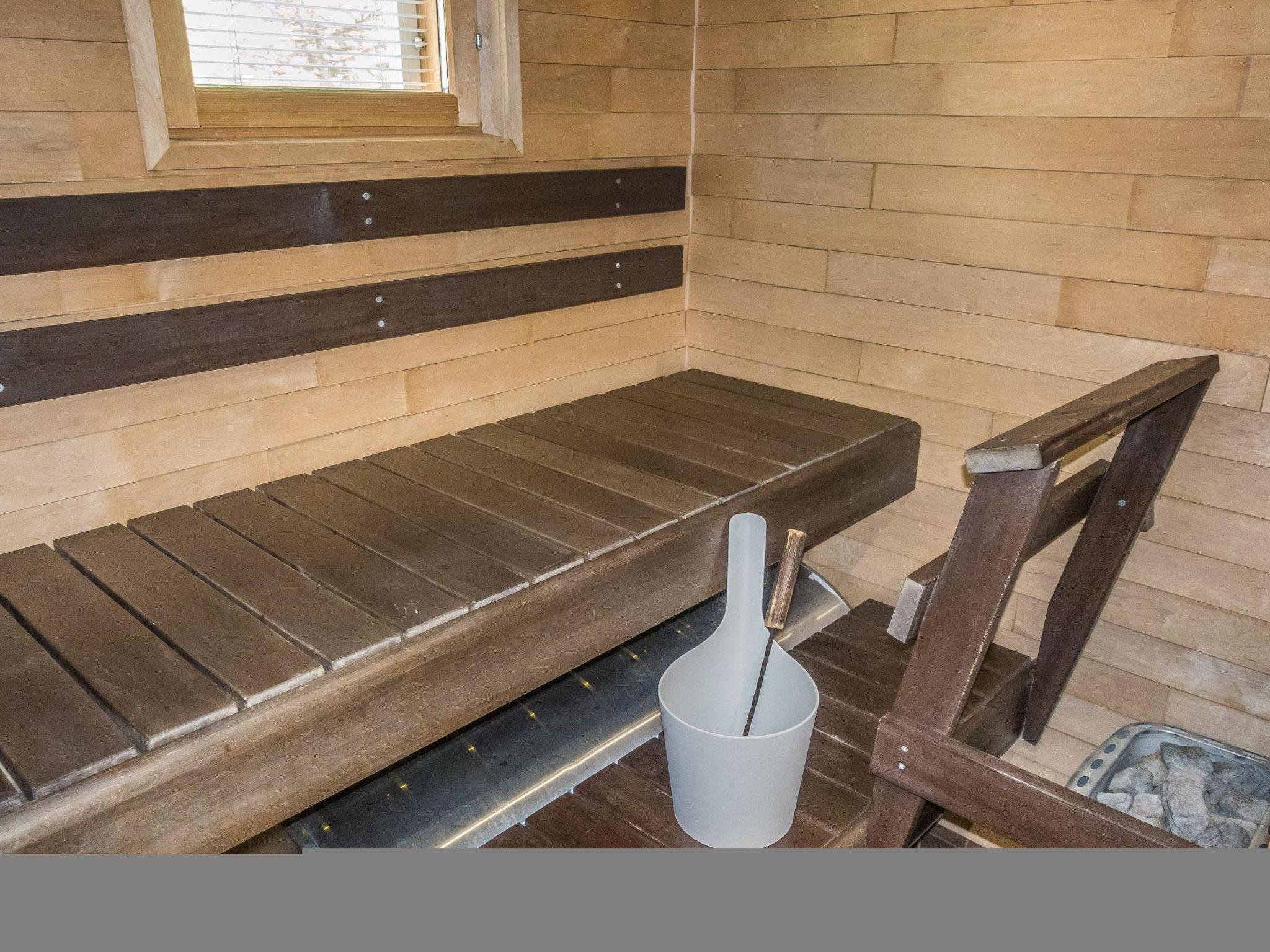 The apartment is spread over two floors. On the ground floor, there is an open kitchen and living area, a bedroom with a double bed, a sauna, a bathroom, and an open terrace.