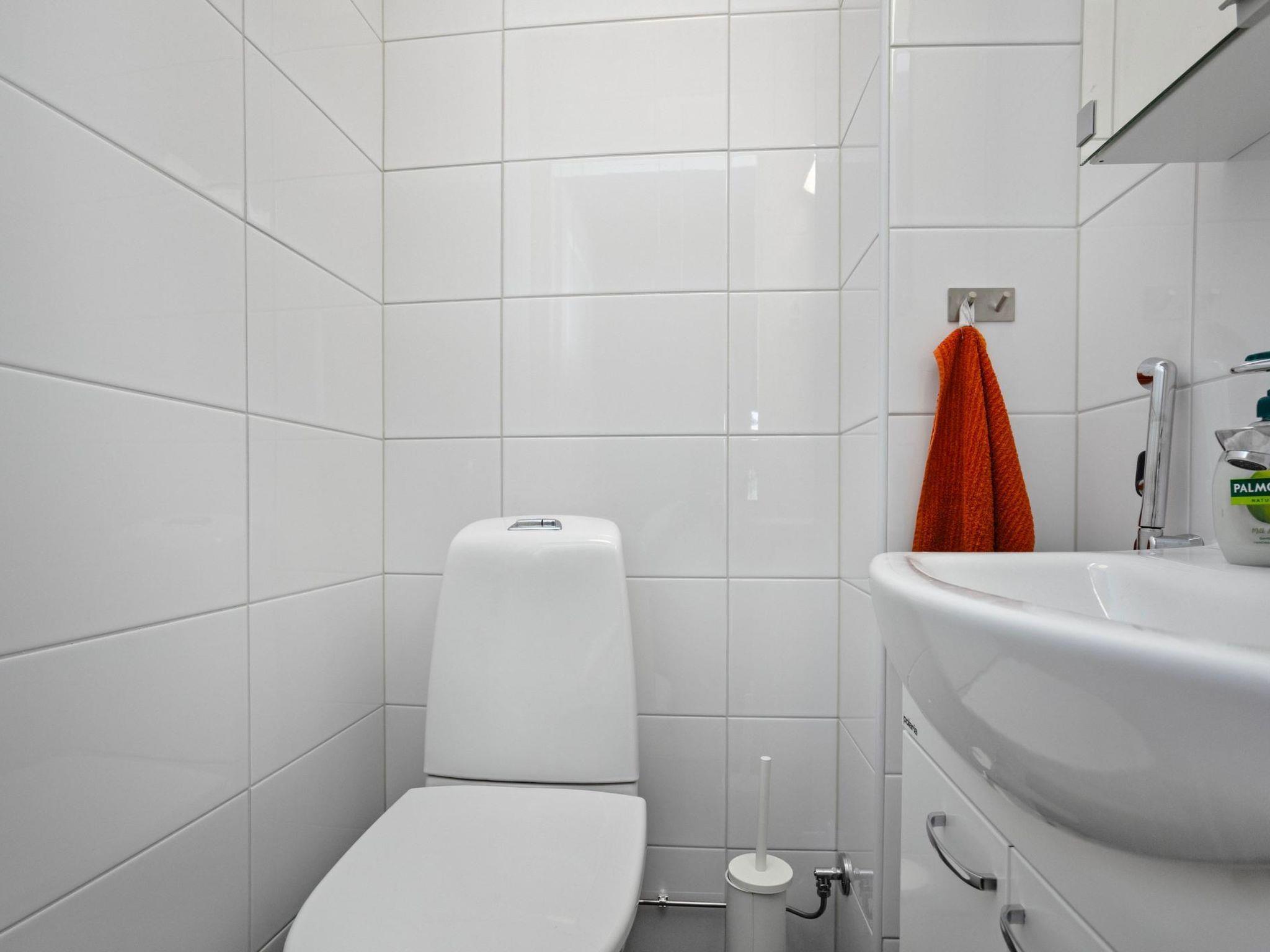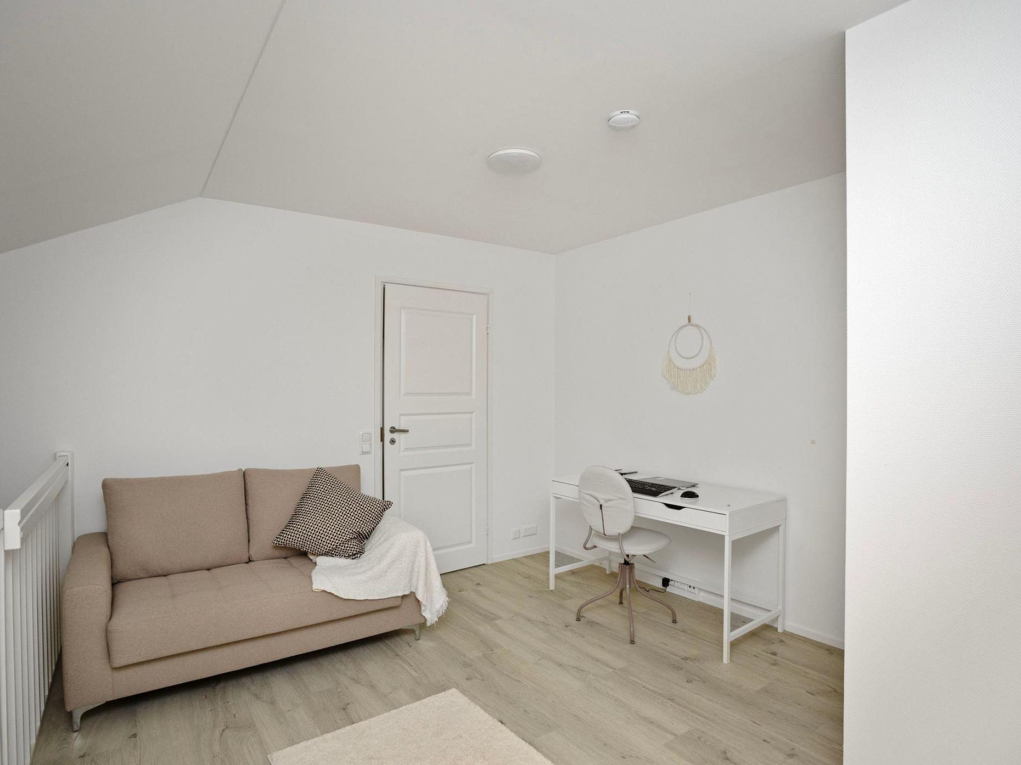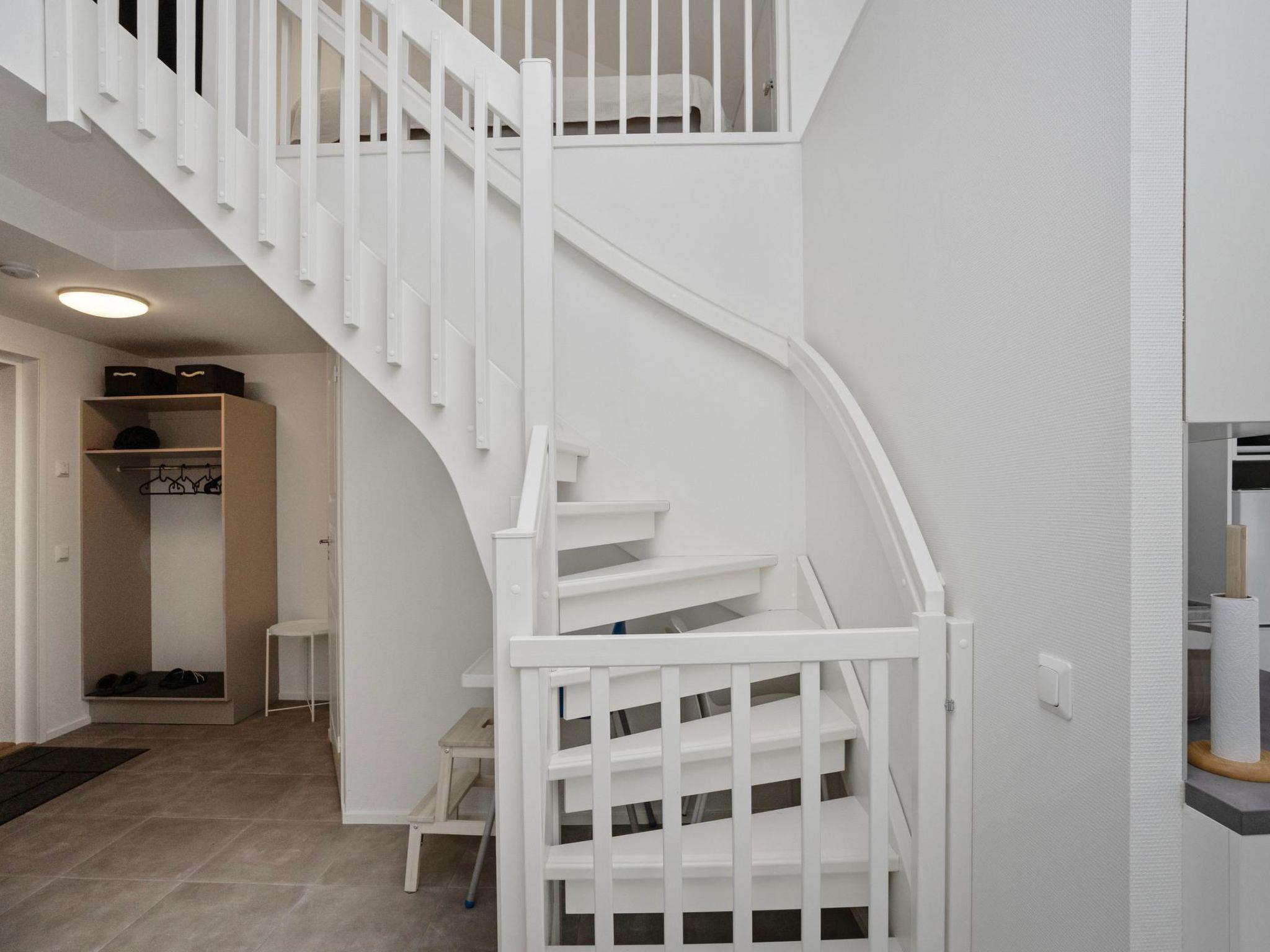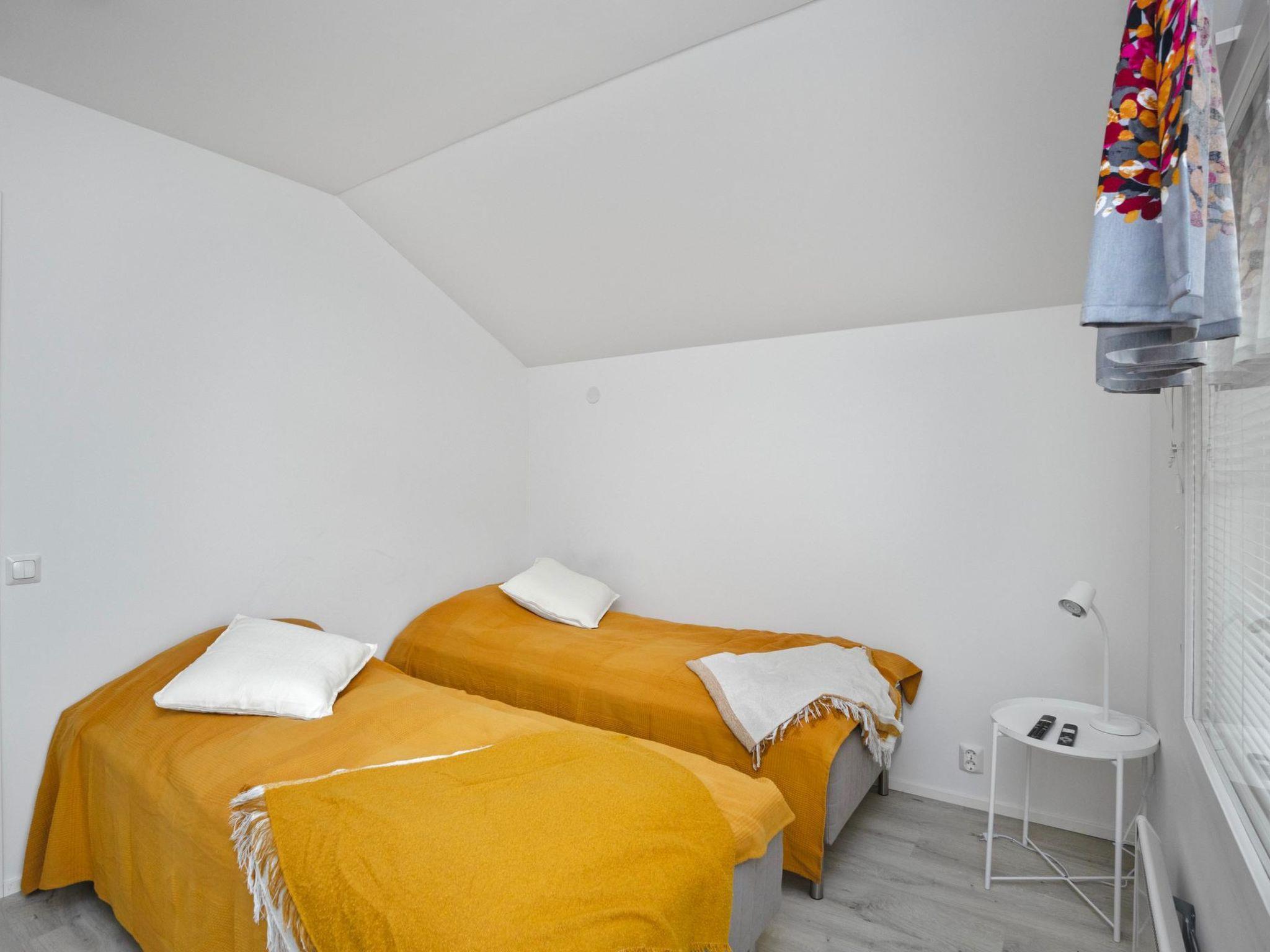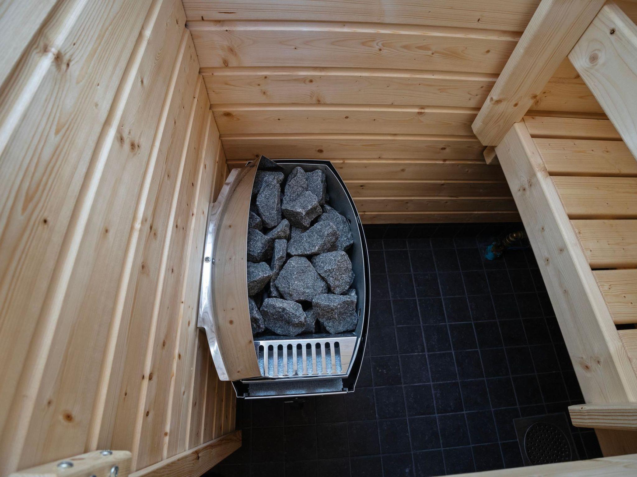 The living area and open-plan kitchen are cozy, with the atmosphere enhanced by a fireplace. The kitchen is well-equipped, and the dining table can be extended. The upstairs living area includes a workstation, so remote work is possible. The bathroom and sauna provide a great space for relaxation.