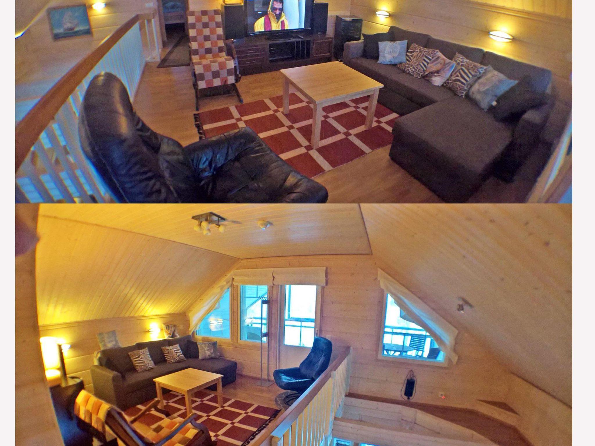Upstairs: bedroom with double bed (160 cm wide), bedroom with 2 beds (80 cm and 120 cm wide), lounge sofa-bed, bathroom, balcony.