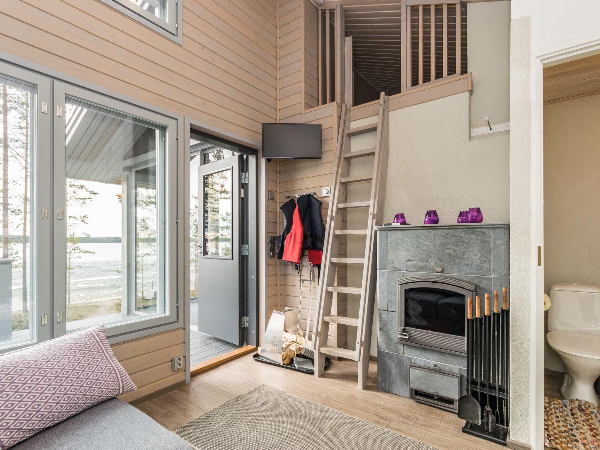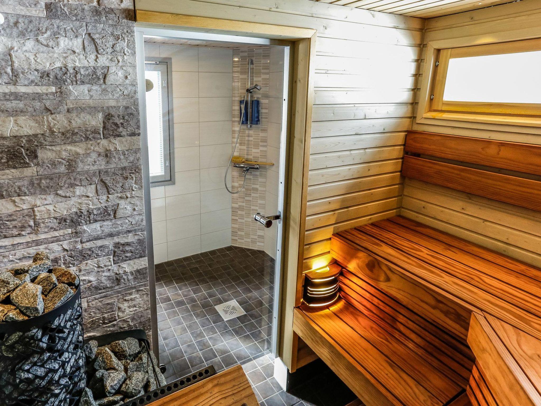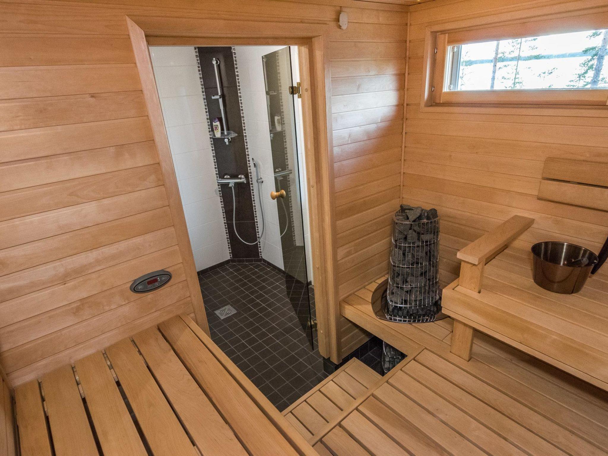 Well-equipped lakeside sauna (25 m²), terrace, dressing room, washroom, sauna (wood-burning stove), fireplace room with sofa bed (2 extra beds), mini-kitchen, toilet, loft (steep ladder to the loft). There are 2 alternative extra beds on the loft. On the glazed terrace there is a 6-person hydro massage bath freely available.