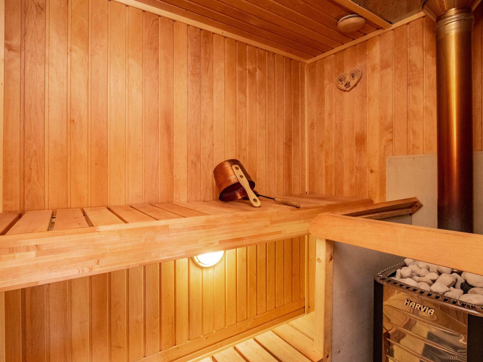 Washroom with shower and WC, sauna with wood-burning sauna stove.