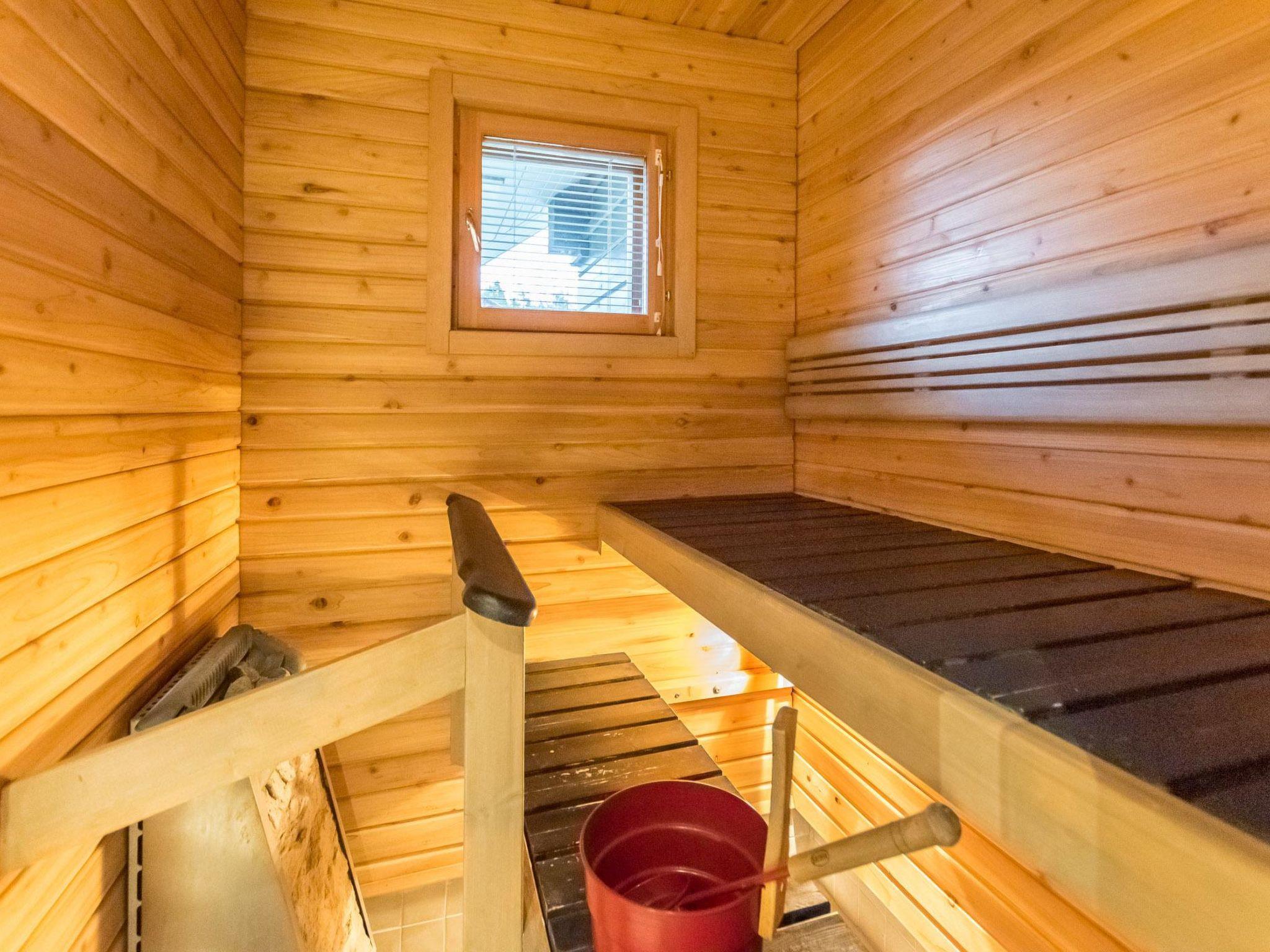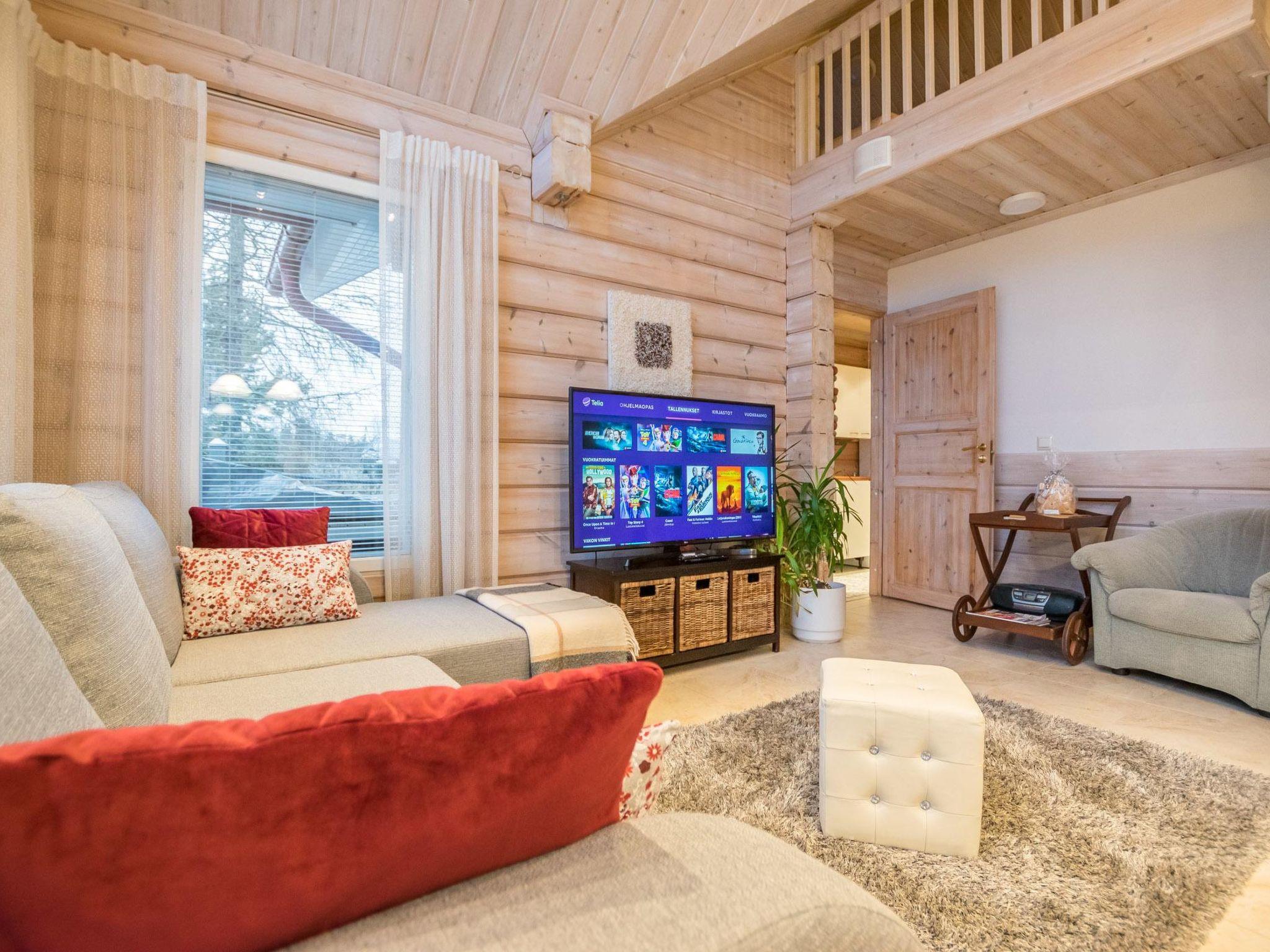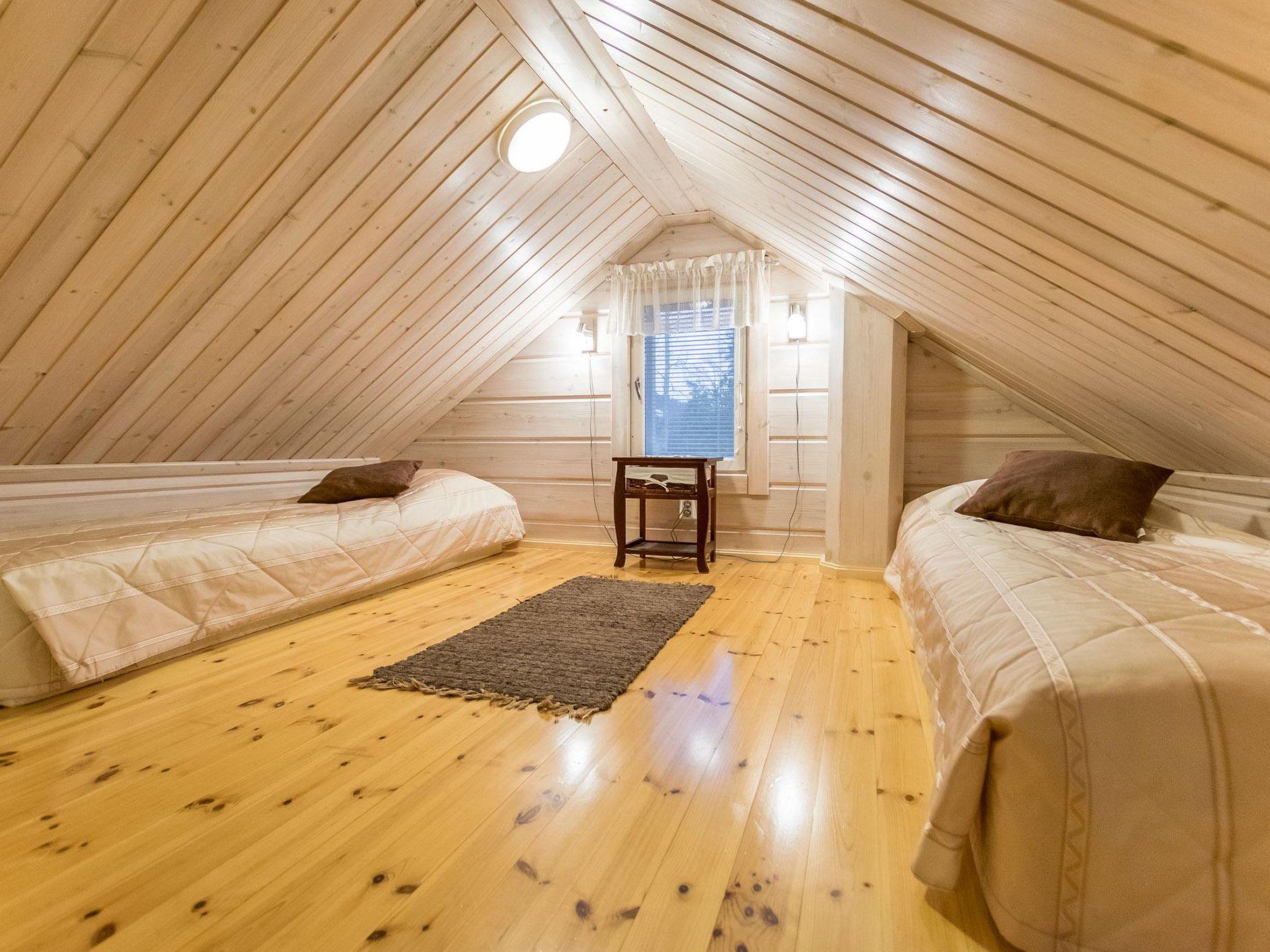 On the ground floor living room with dining group, heat reserving fireplace, sofa bed (bed size is 140 x 195 cm), TV (including Telia TV application for recording broadcasts), kitchenette, bedroom (160 x 200 cm Yankee bed), WC, sauna, washroom with toilet seat, washing machine, drying cabinet. Sleeping places for six person (80 x 200 cm spring mattress + mattress pad) in the loft (slope ceiling).