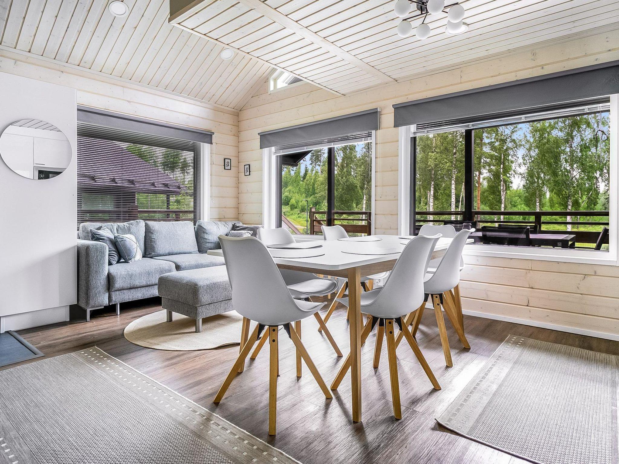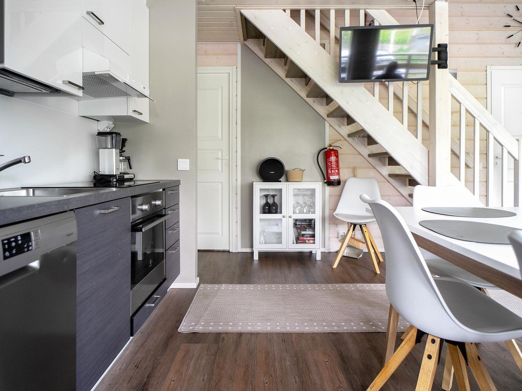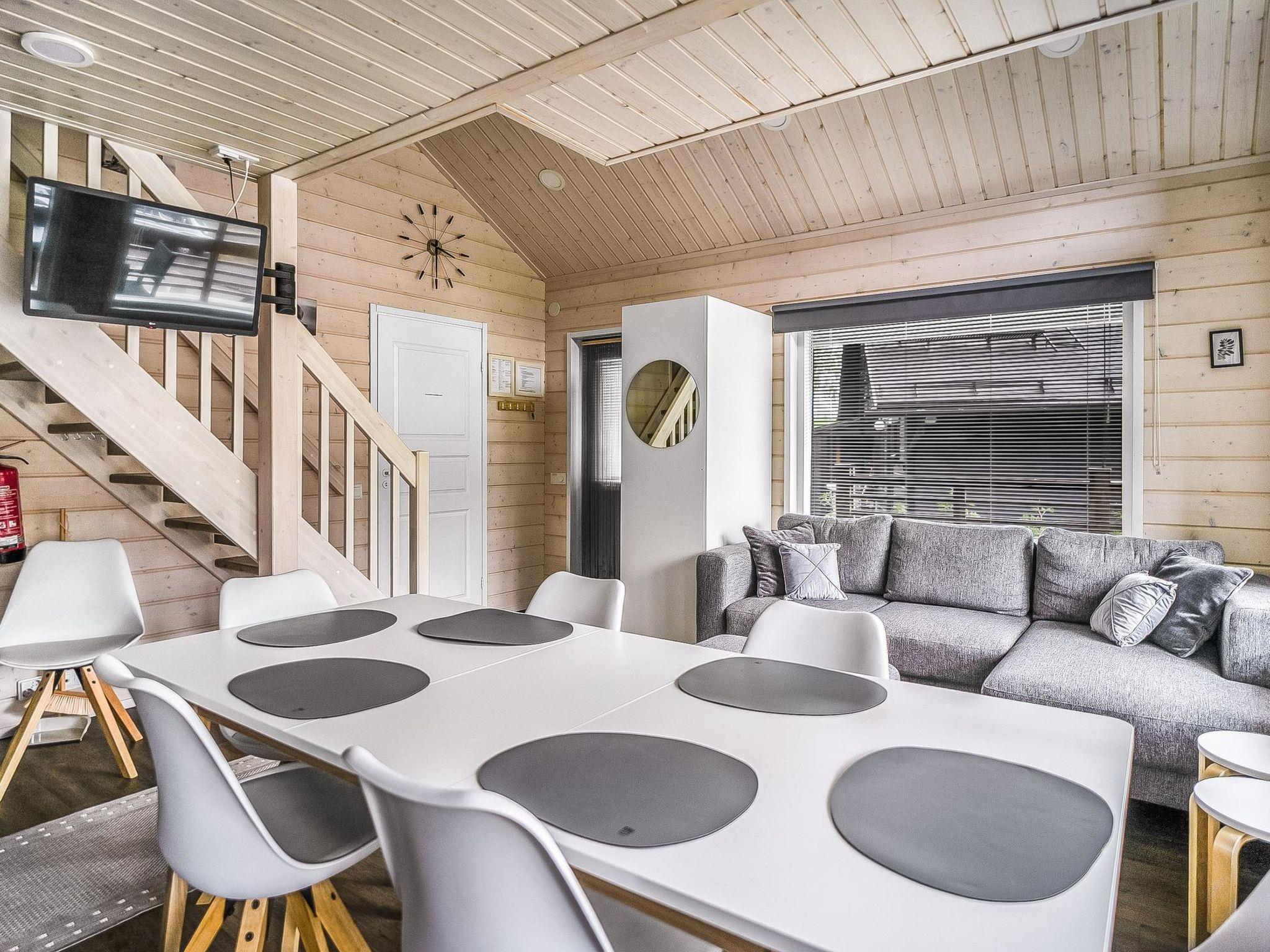 Log-built semi-detached apartment (2019). On the ground floor of the high-quality furnished apartment, there is a living room with a sofa bed (spread out 140x205 cm) and a kitchen with a spacious dining table for six people.