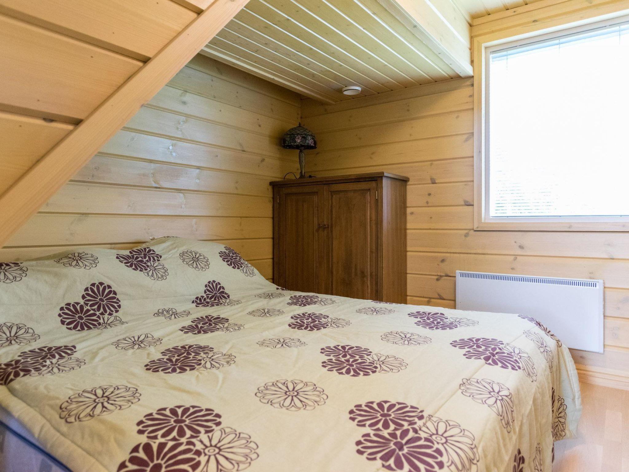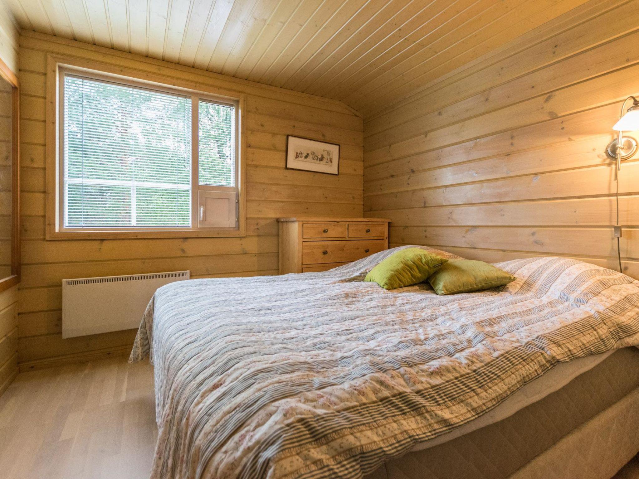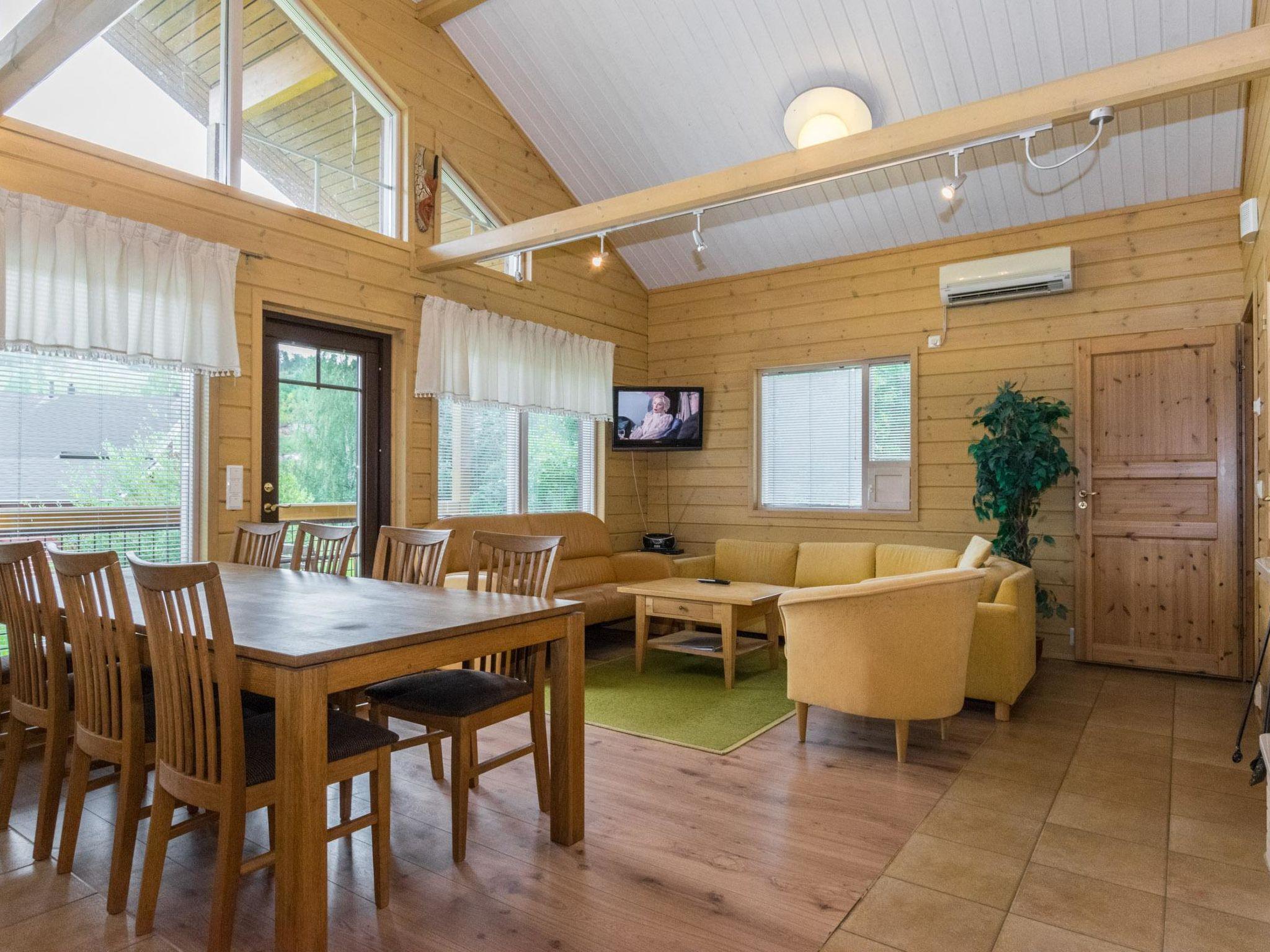 Wooden cabin (2008) features a spacious living room with a heat-storing fireplace and air source heat pump, a kitchenette, and two bedrooms - one with a double bed and the other with two single beds. On the upper floor, a sleeping area with three beds. Separate WC, electric sauna, bathroom with shower, another WC, and a washing machine.