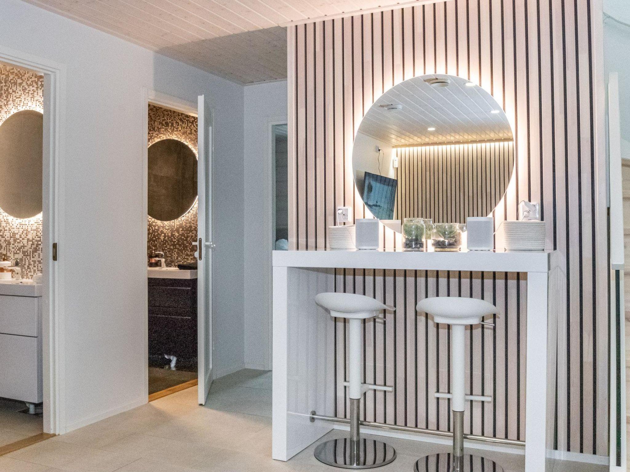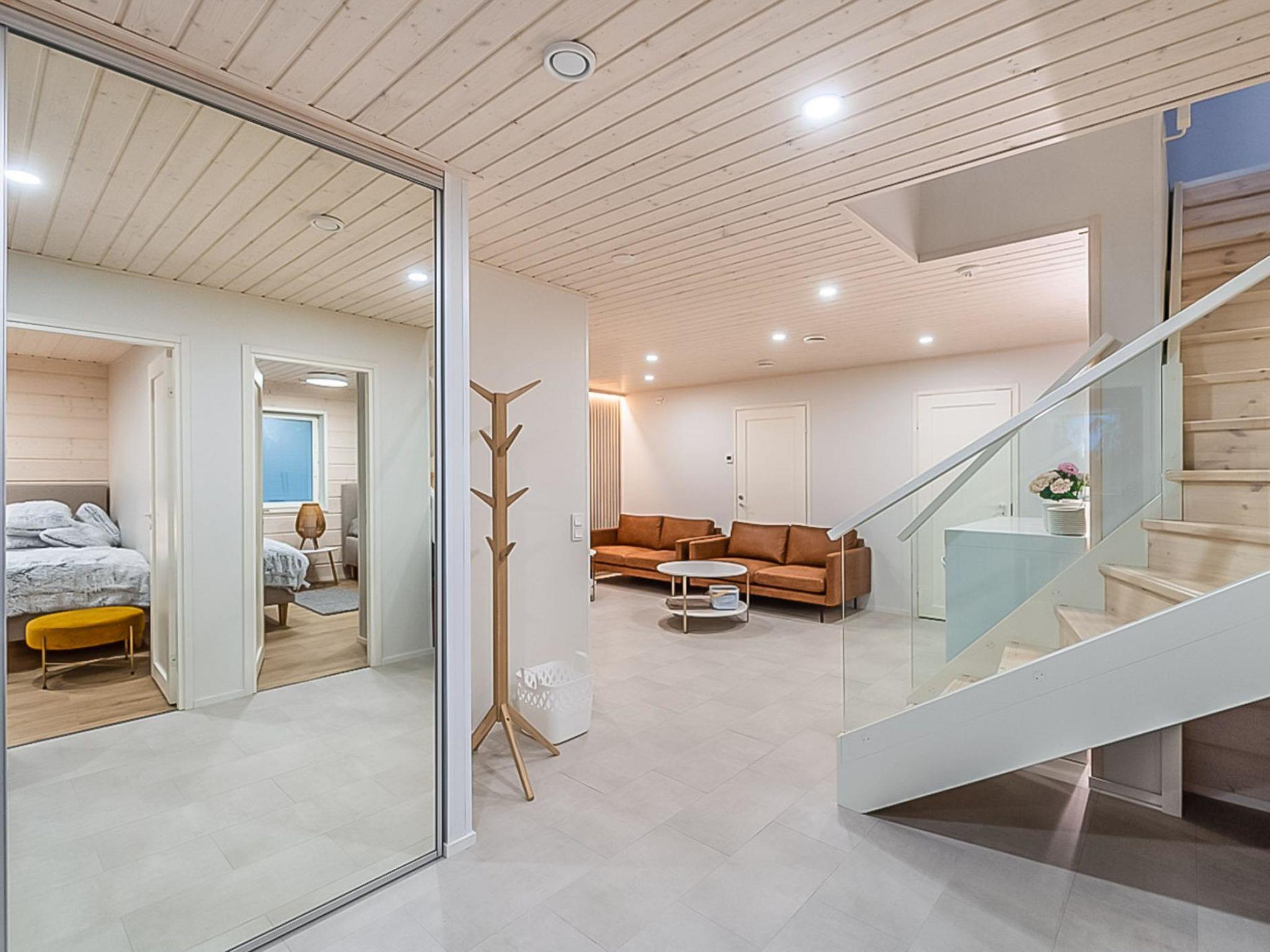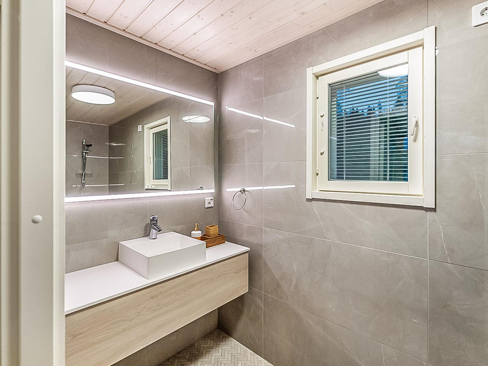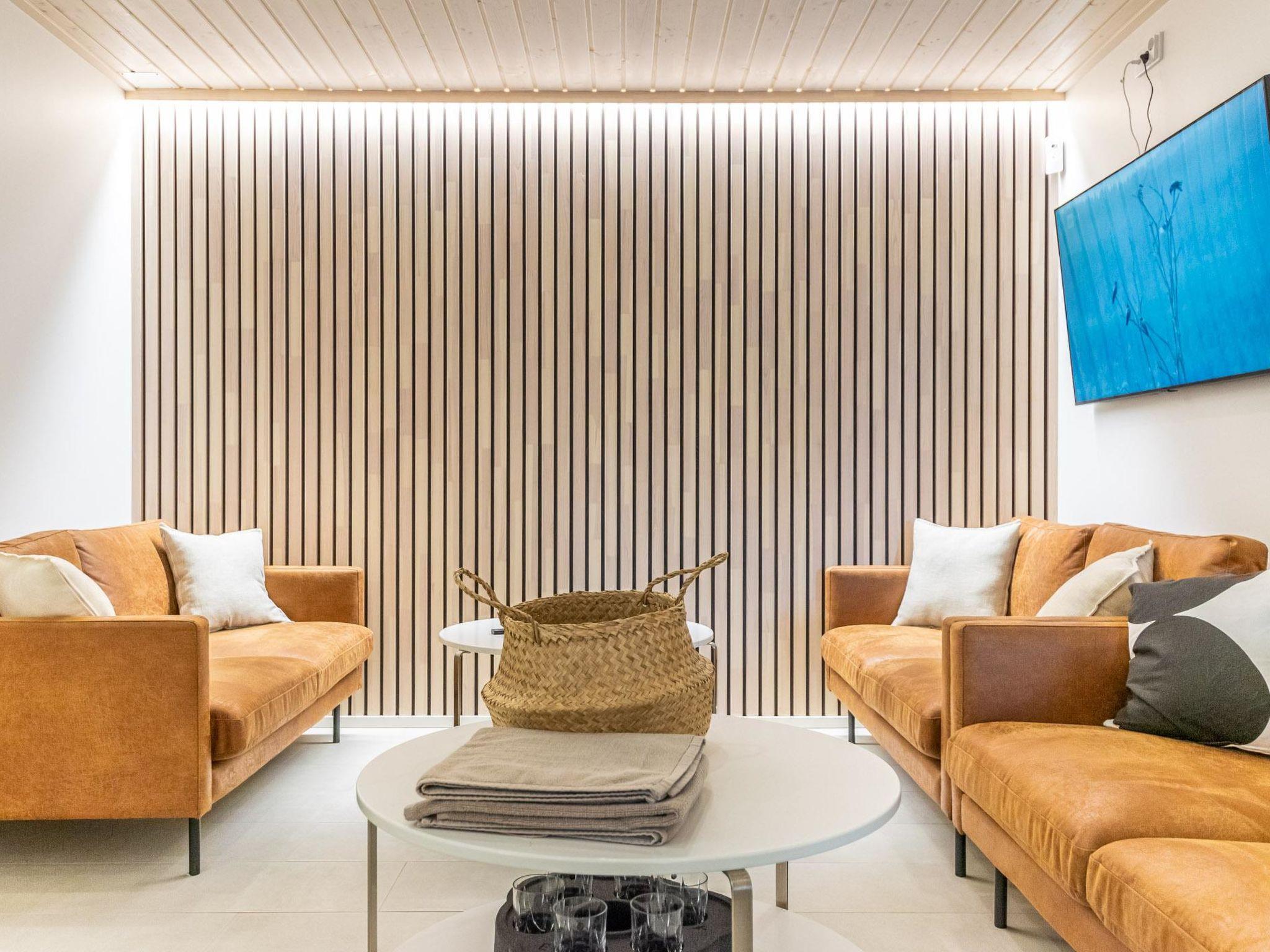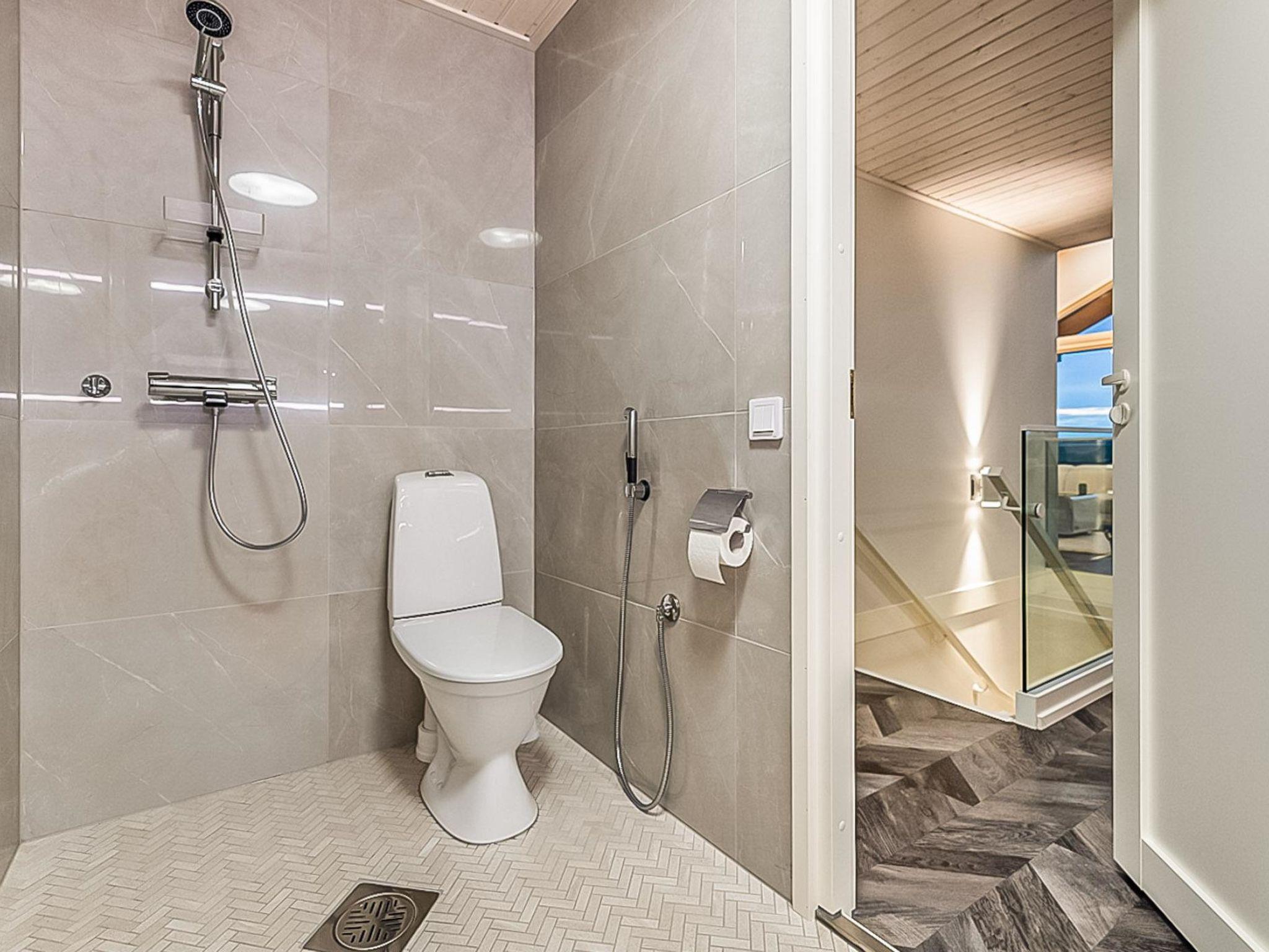 The ground floor includes a lounge area with sofas and a TV, a sauna (electric sauna stove), a bathroom with three showers, and two WCs. There is also a terrace with a hot tub available for rent. The cabin has a garage for storing golf carts, with space for one regular car. There is an electric outlet in the yard for charging electric cars with your own charger.