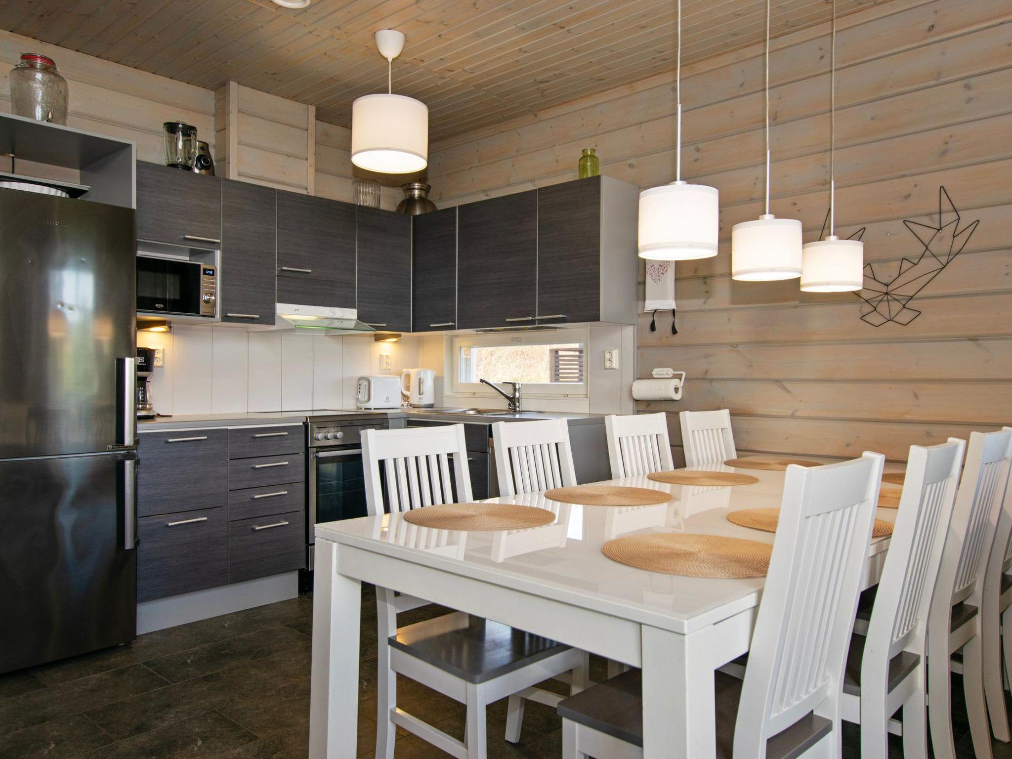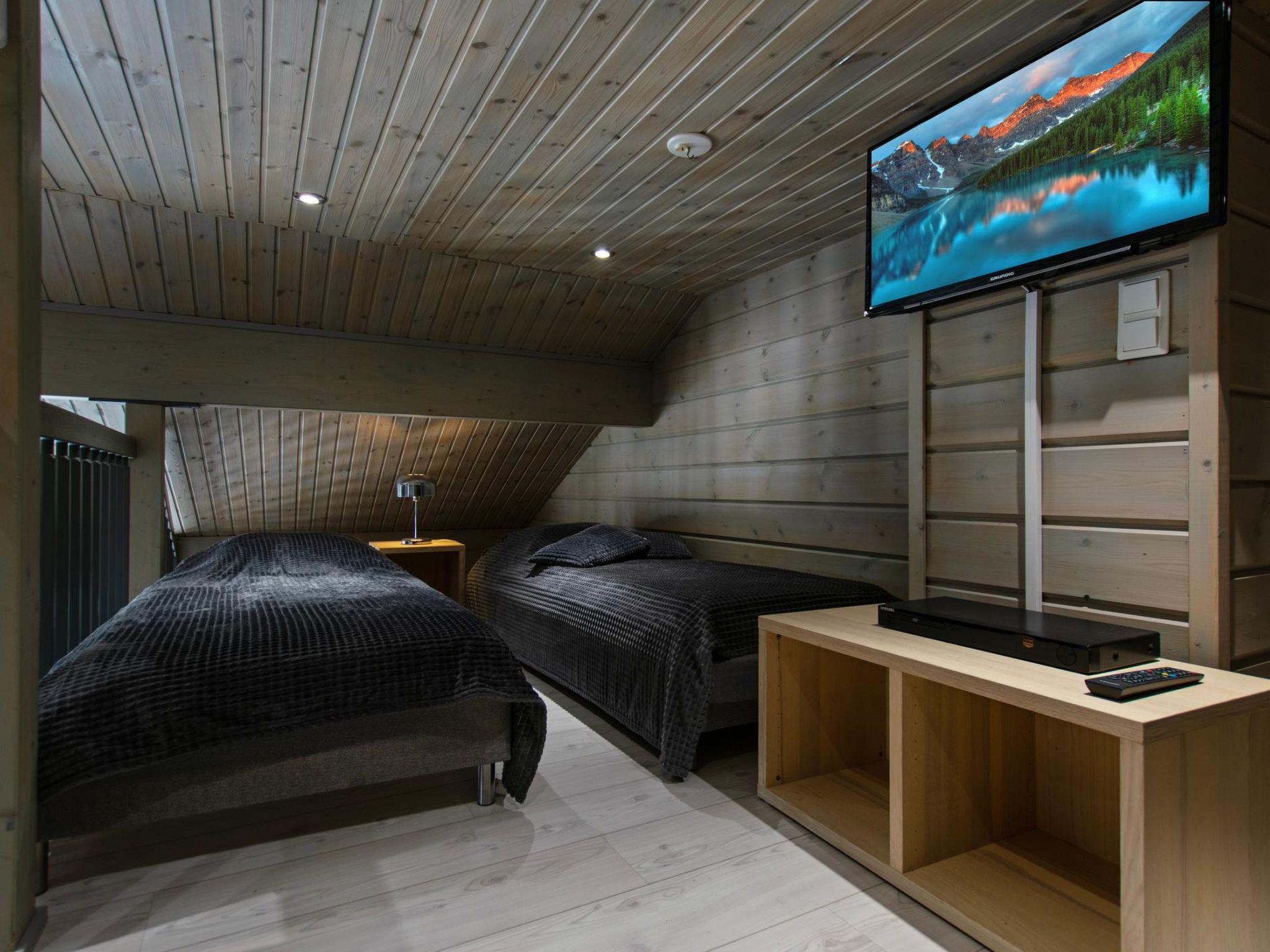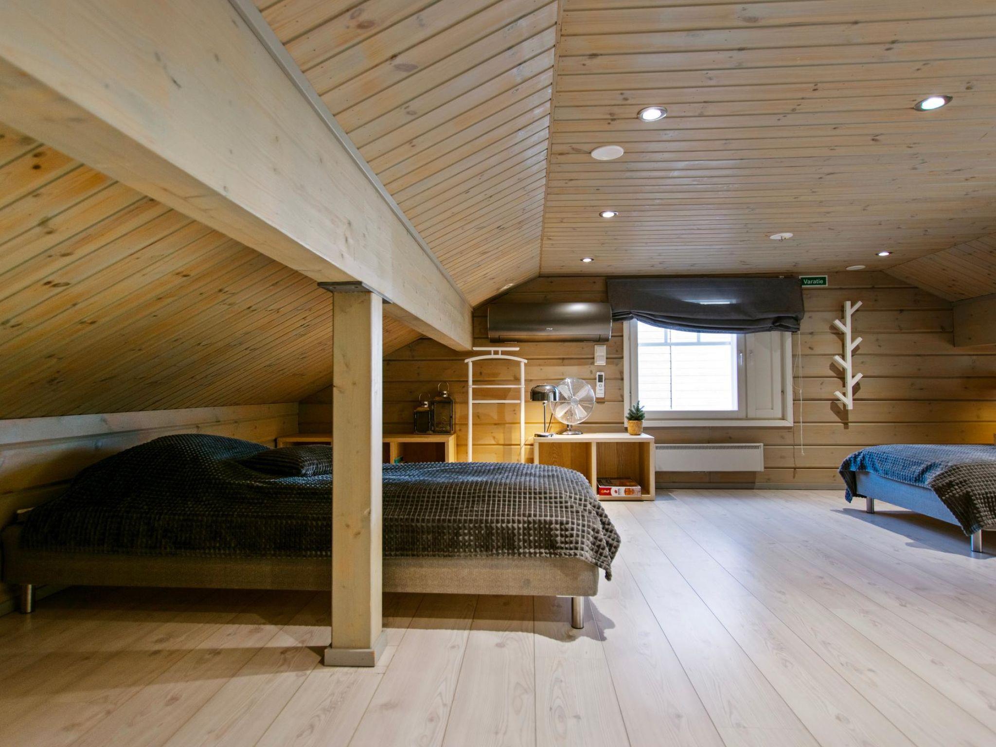 59 km from Jyväskylä, a wooden cottage (2008) located in the Himos ski resort, well-equipped kitchen-living room with a spacious dining area, a sofa and a large TV in the living room (including Chromecast, which can be used to project streamed broadcasts to the TV). The cottage also has a Bluetooth speaker. Two bedrooms, each with two beds. In addition, the loft has five 90 cm wide beds. Note. the room height in the loft is lower than usual.
