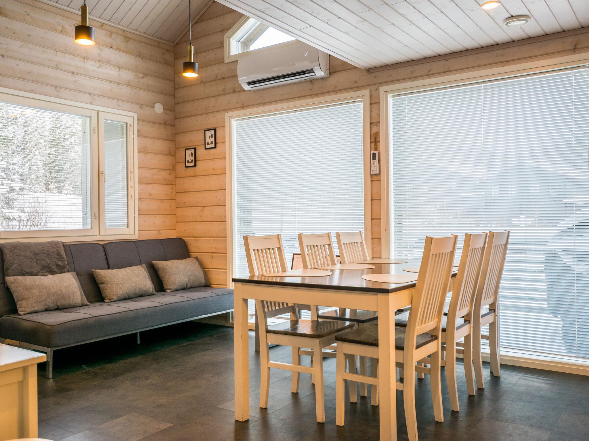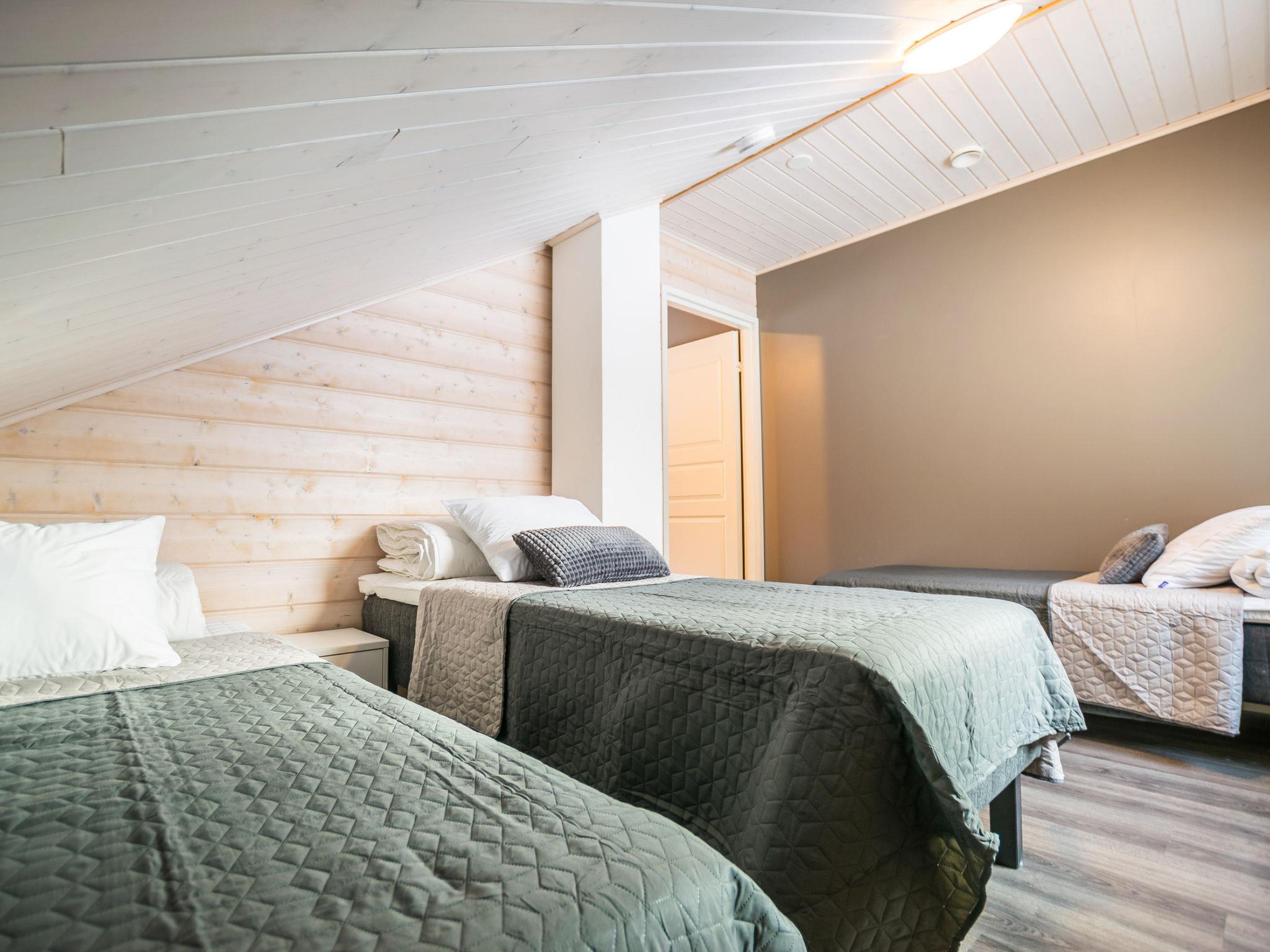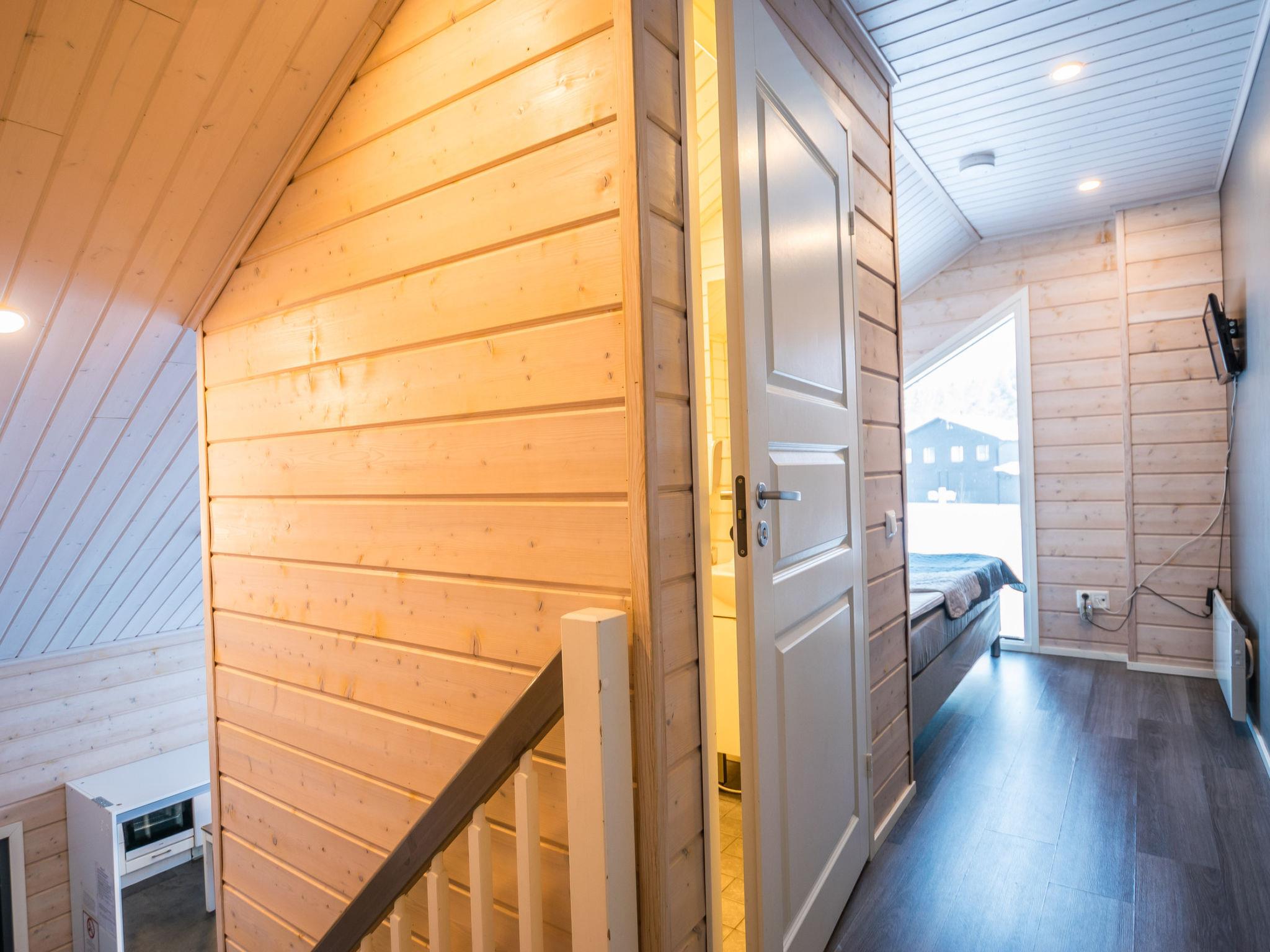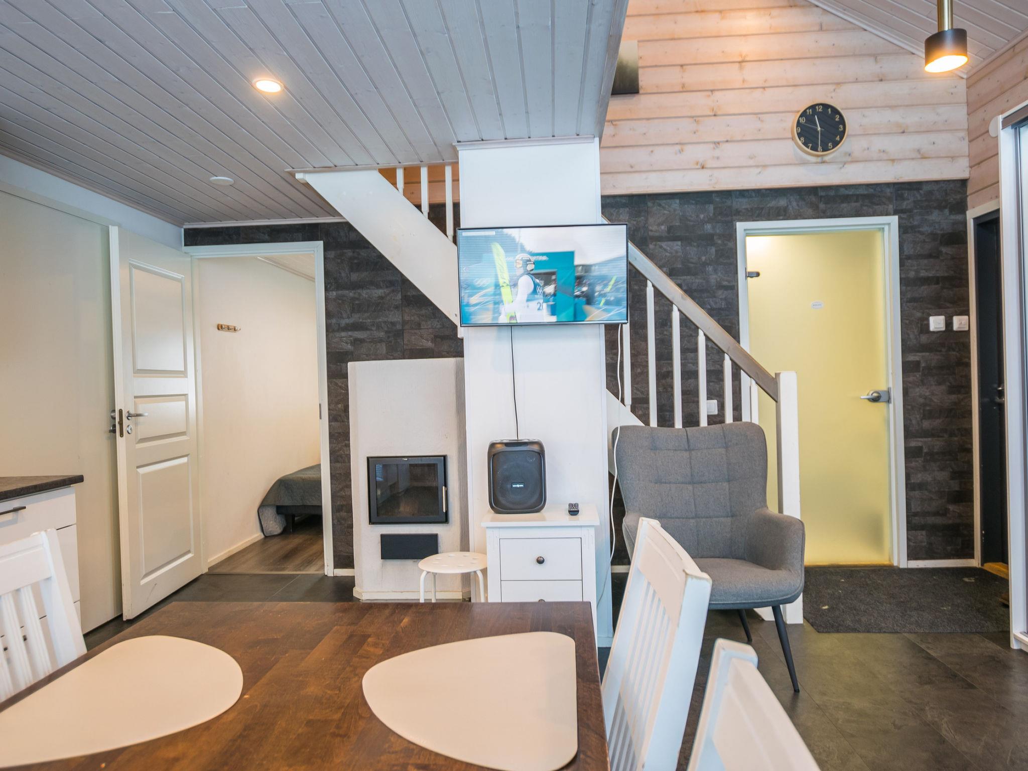 This wooden-structured aparment includes a combined kitchen/living room. The living room is equipped with a heat-storing fireplace, dining set, sofa, smart TV, and Bluetooth speaker. The downstairs bedroom has two 80x200 cm beds. The living room sofa can be converted into an extra bed for one person. The downstairs also includes a bathroom with a toilet, an electric sauna, and a washing machine.