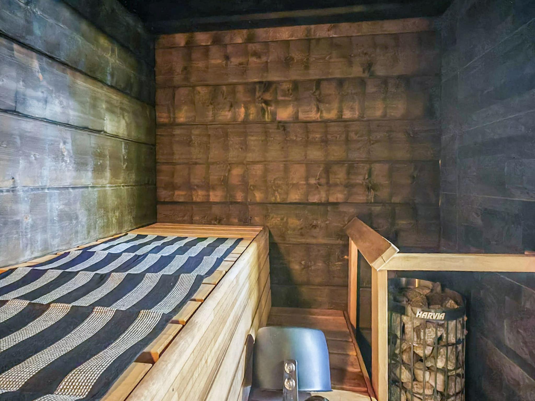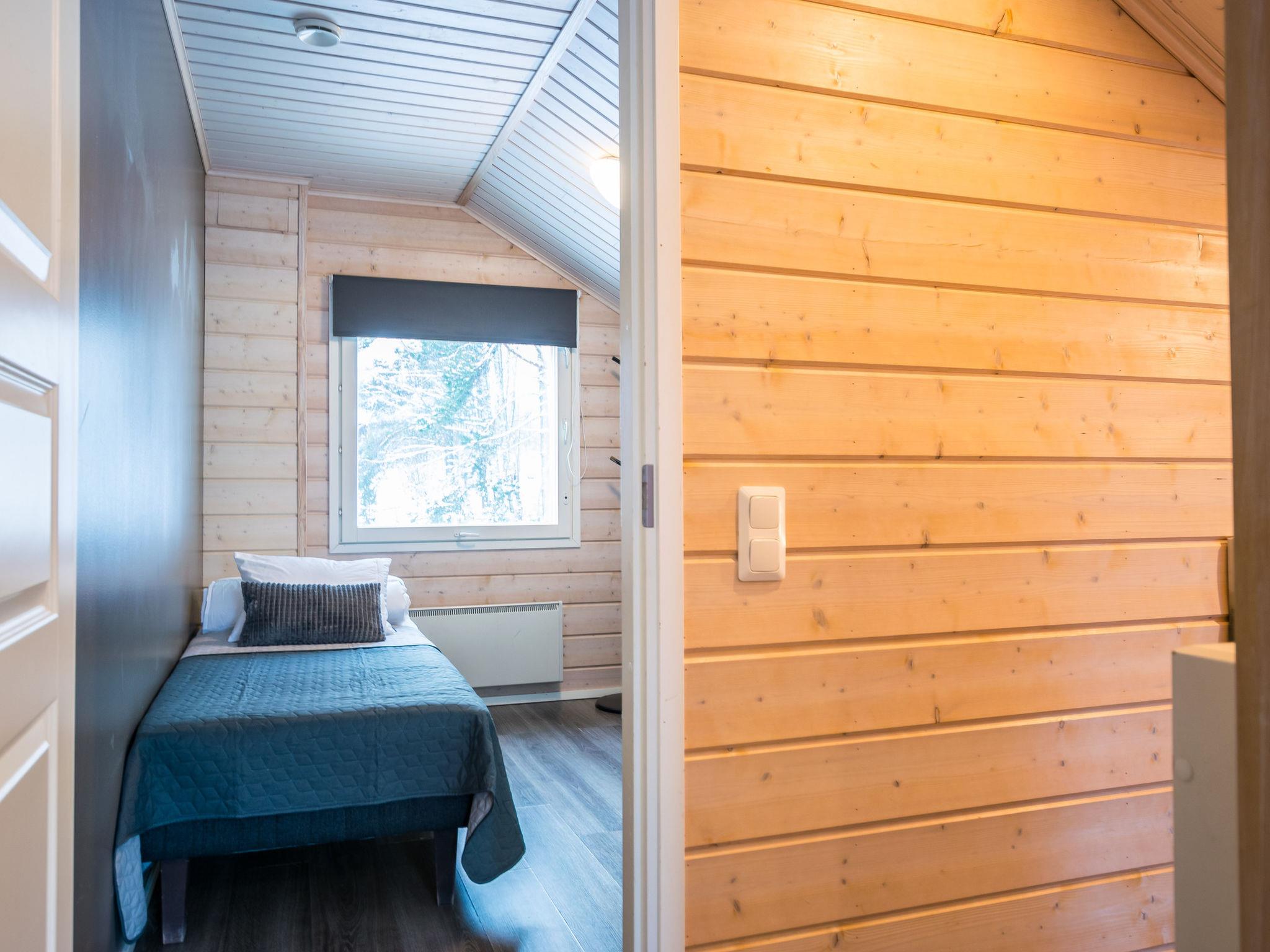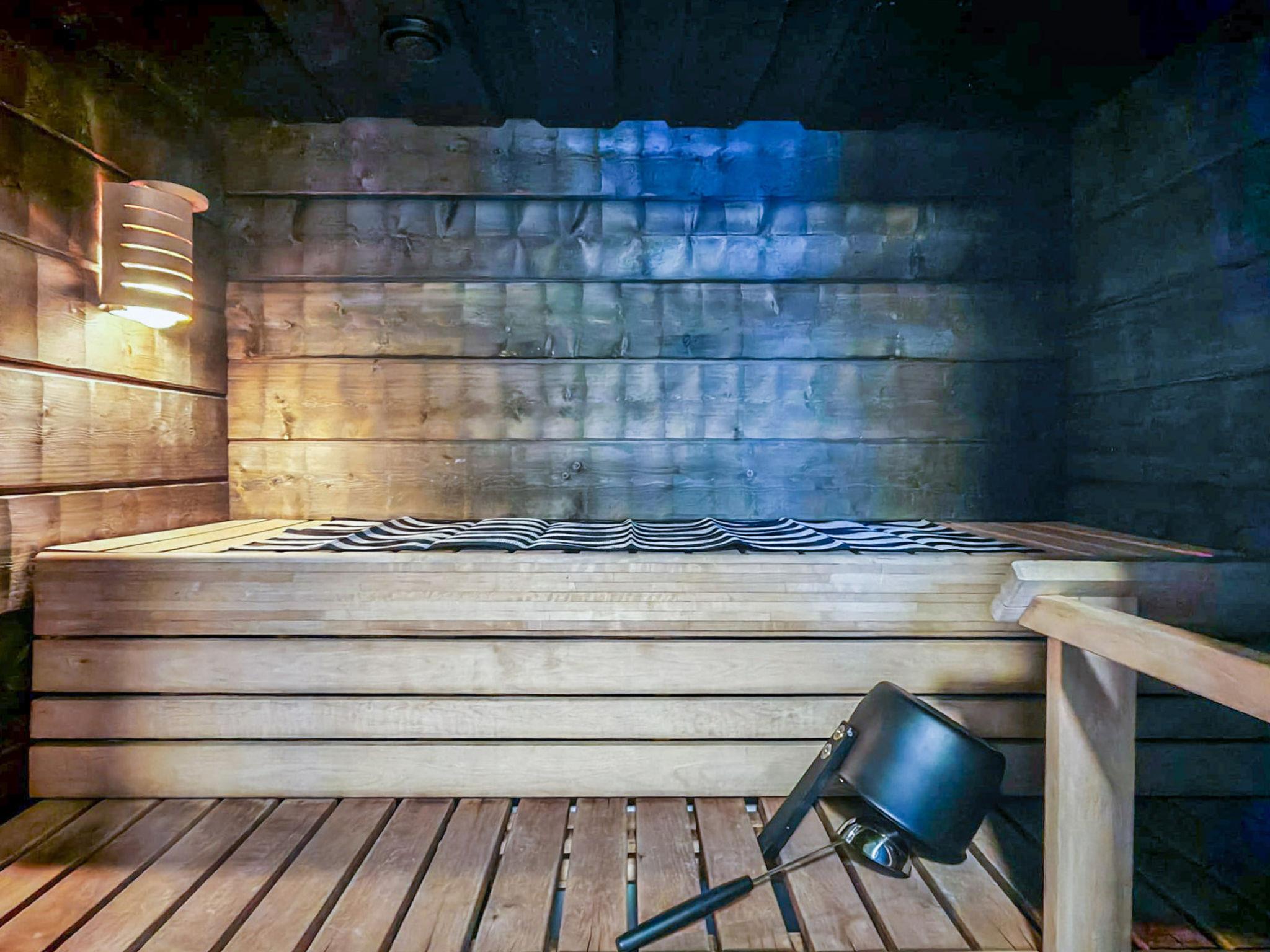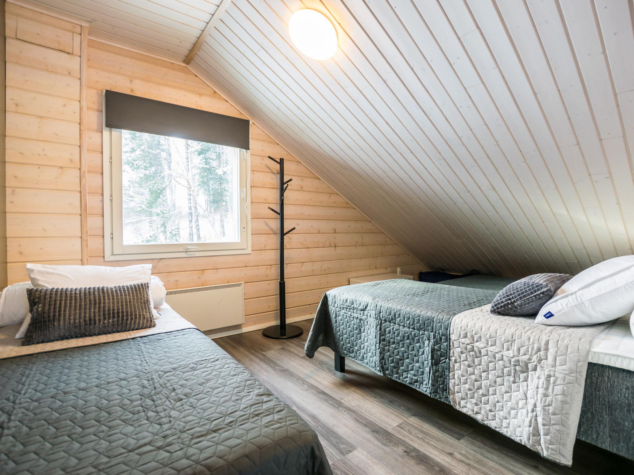 This wooden-structured aparment includes a combined kitchen/living room. The living room is equipped with a heat-storing fireplace, dining set, sofa, smart TV, and Bluetooth speaker. The downstairs bedroom has two 80x200 cm beds. The living room sofa can be converted into an extra bed for one person. The downstairs also includes a bathroom with a toilet, an electric sauna, and a washing machine.