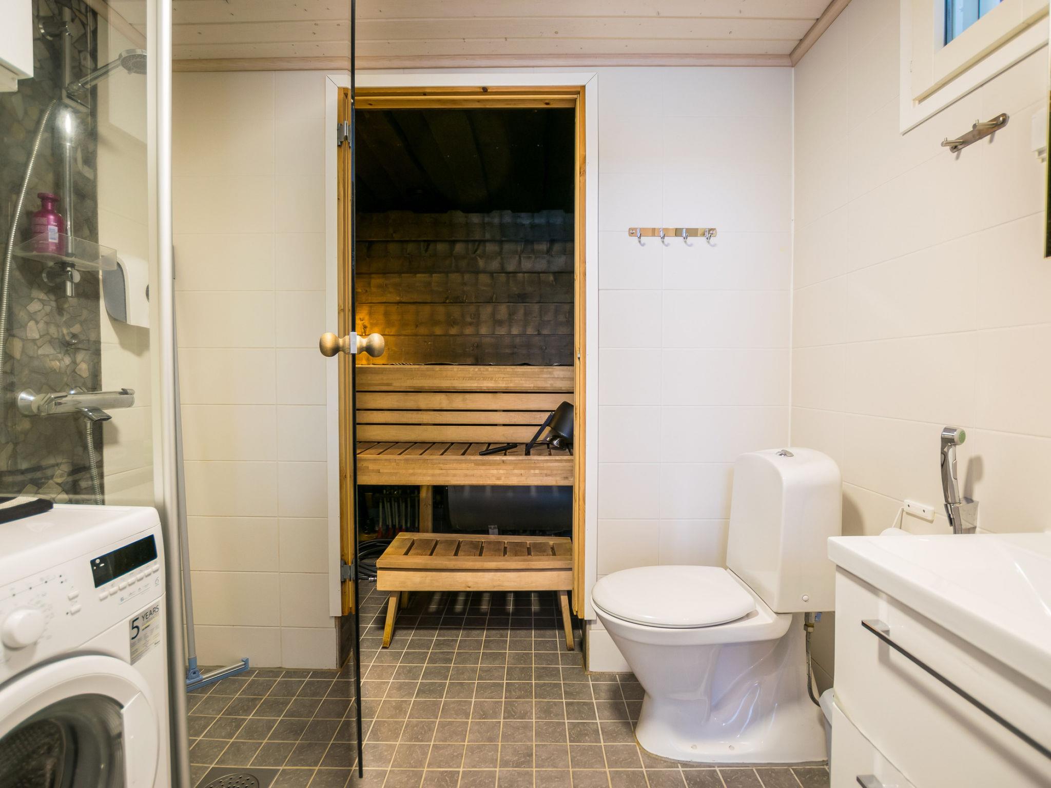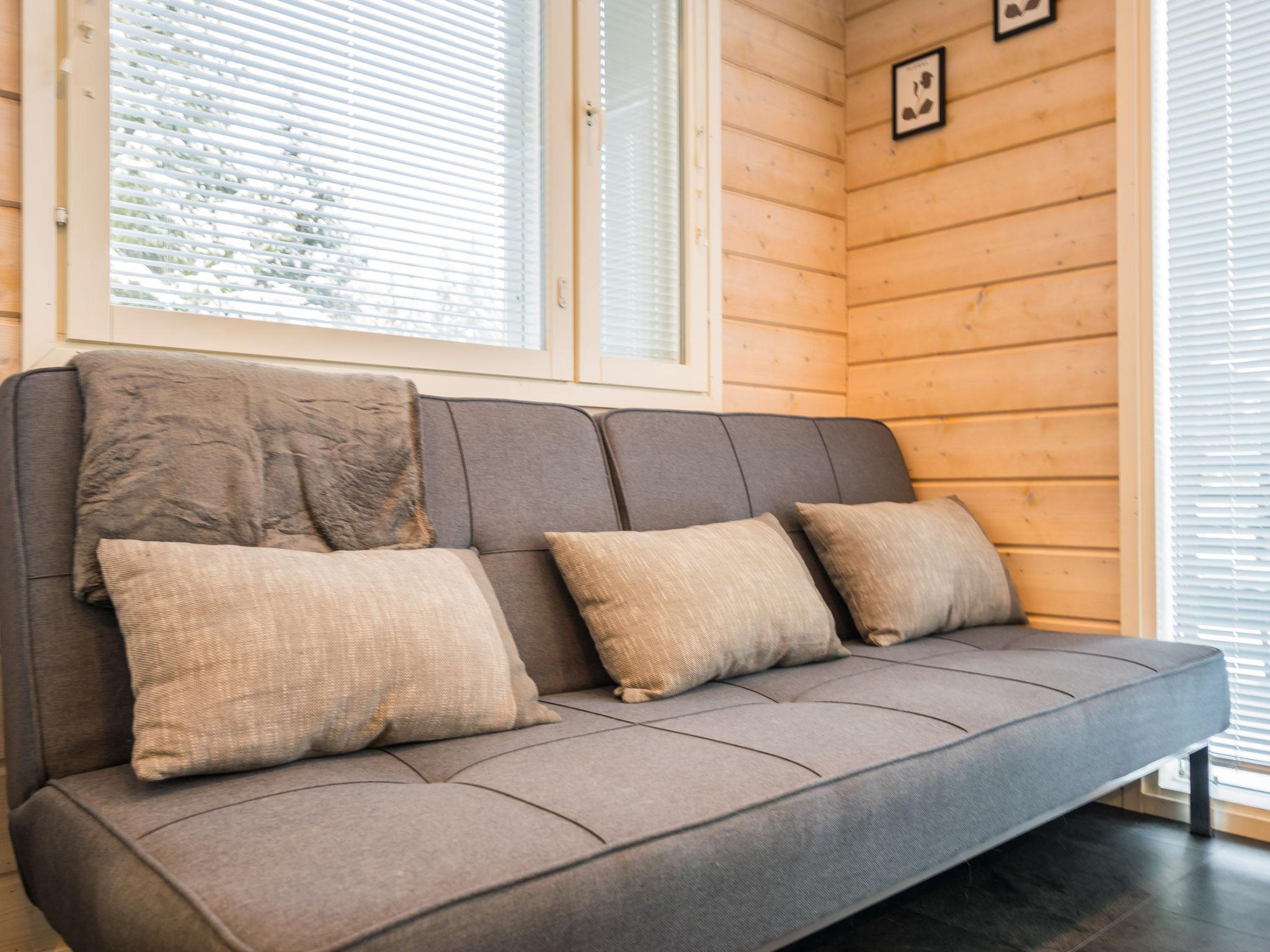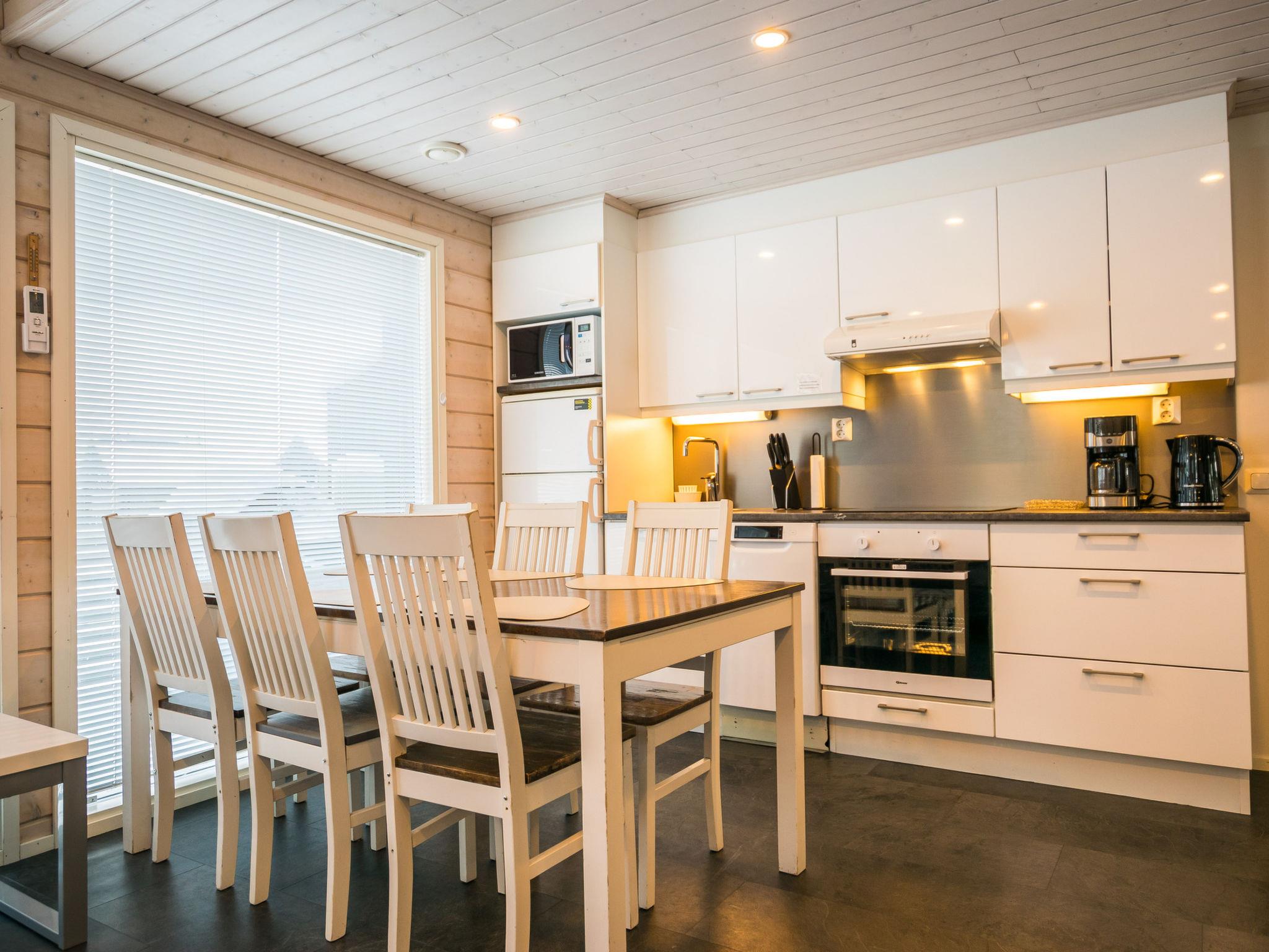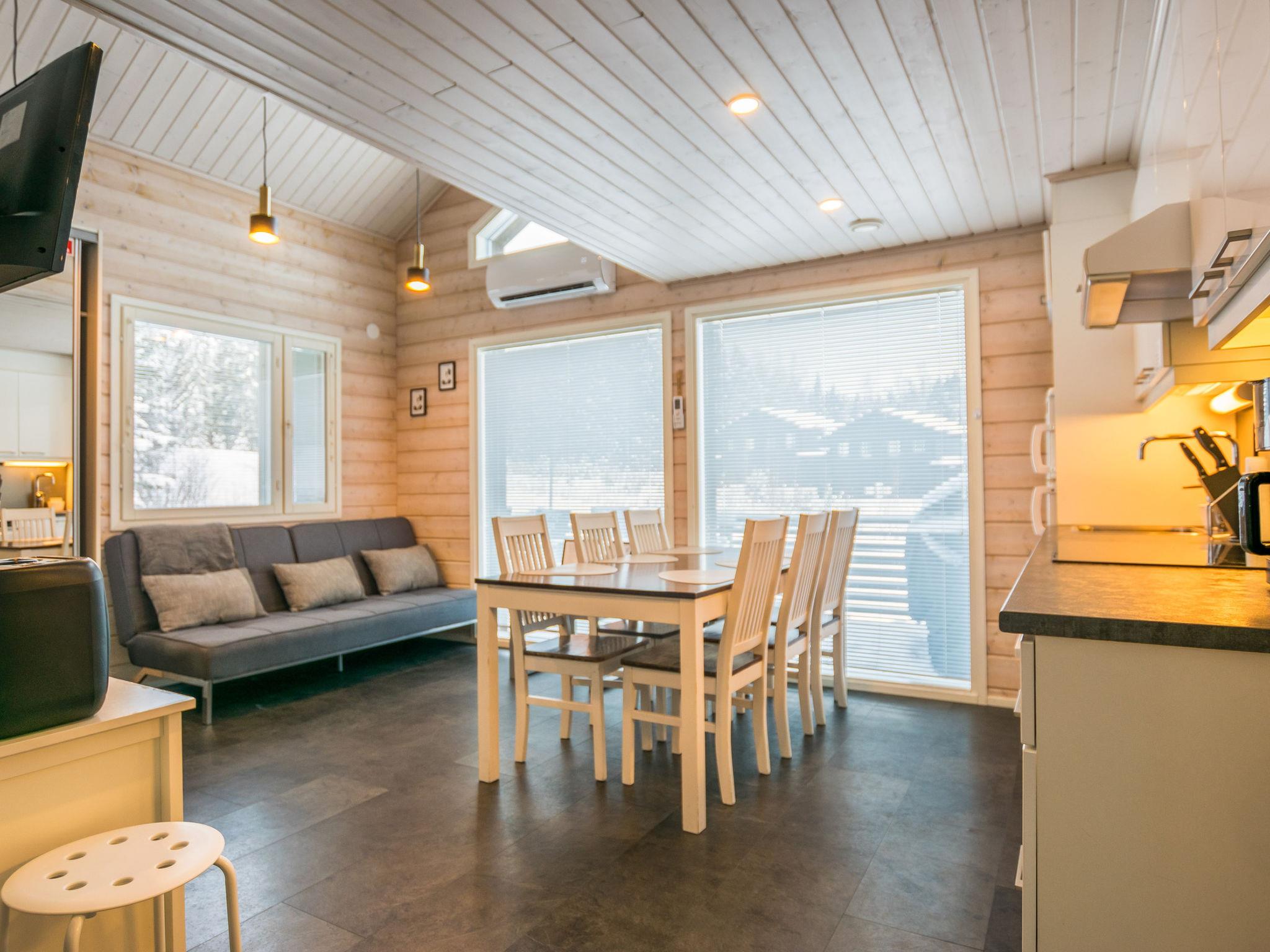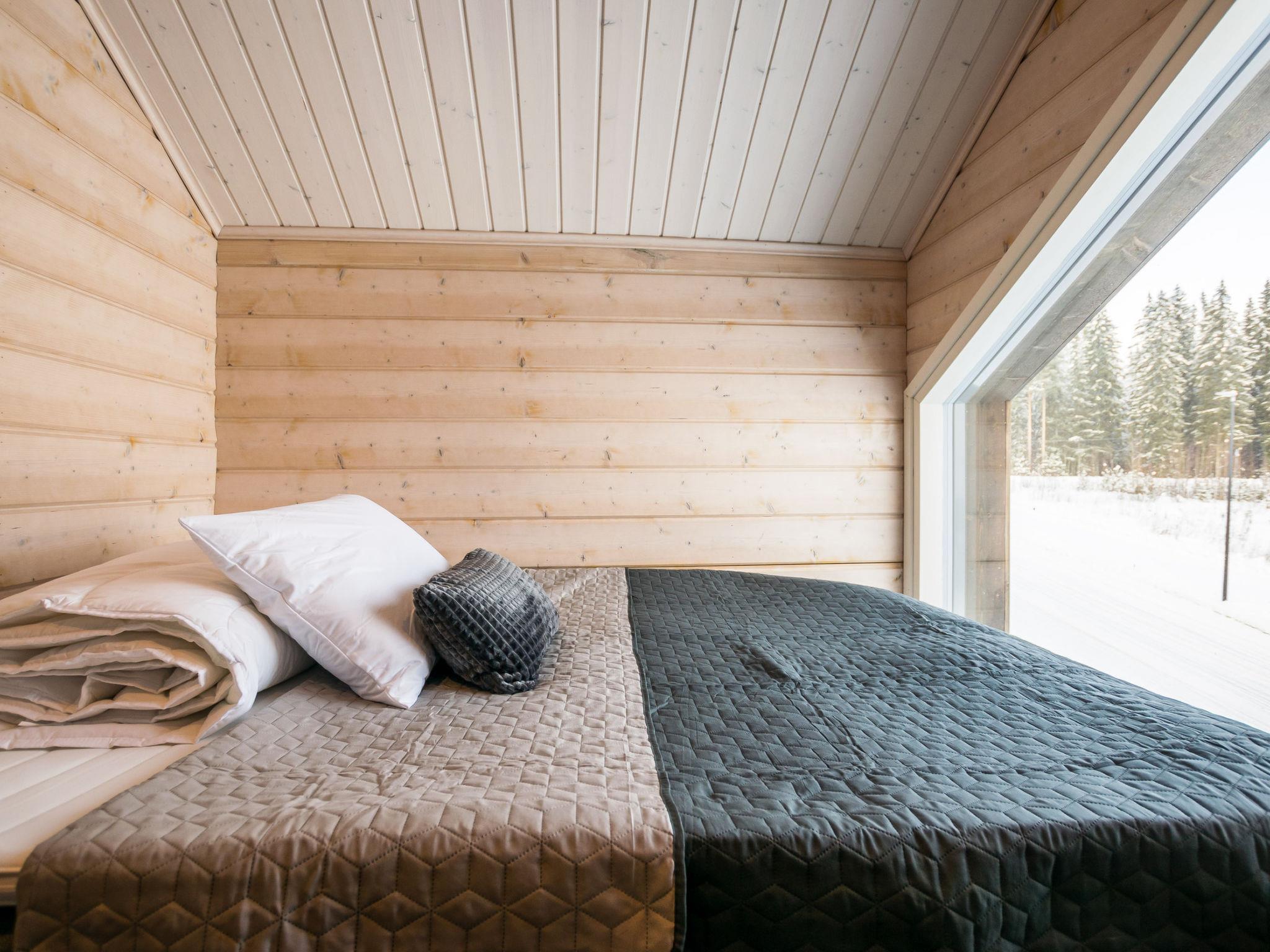 This wooden-structured aparment includes a combined kitchen/living room. The living room is equipped with a heat-storing fireplace, dining set, sofa, smart TV, and Bluetooth speaker. The downstairs bedroom has two 80x200 cm beds. The living room sofa can be converted into an extra bed for one person. The downstairs also includes a bathroom with a toilet, an electric sauna, and a washing machine.