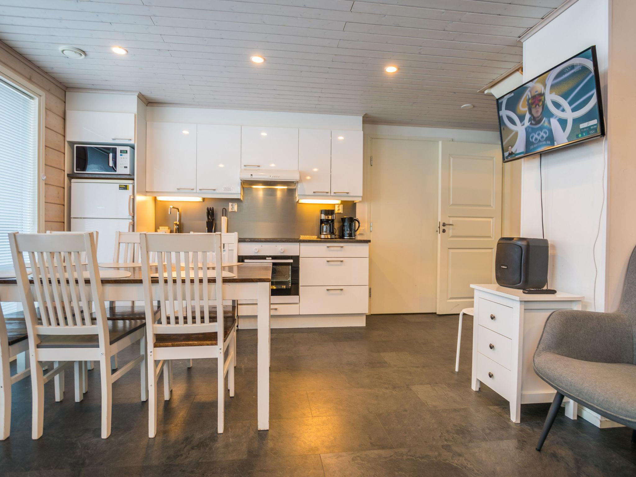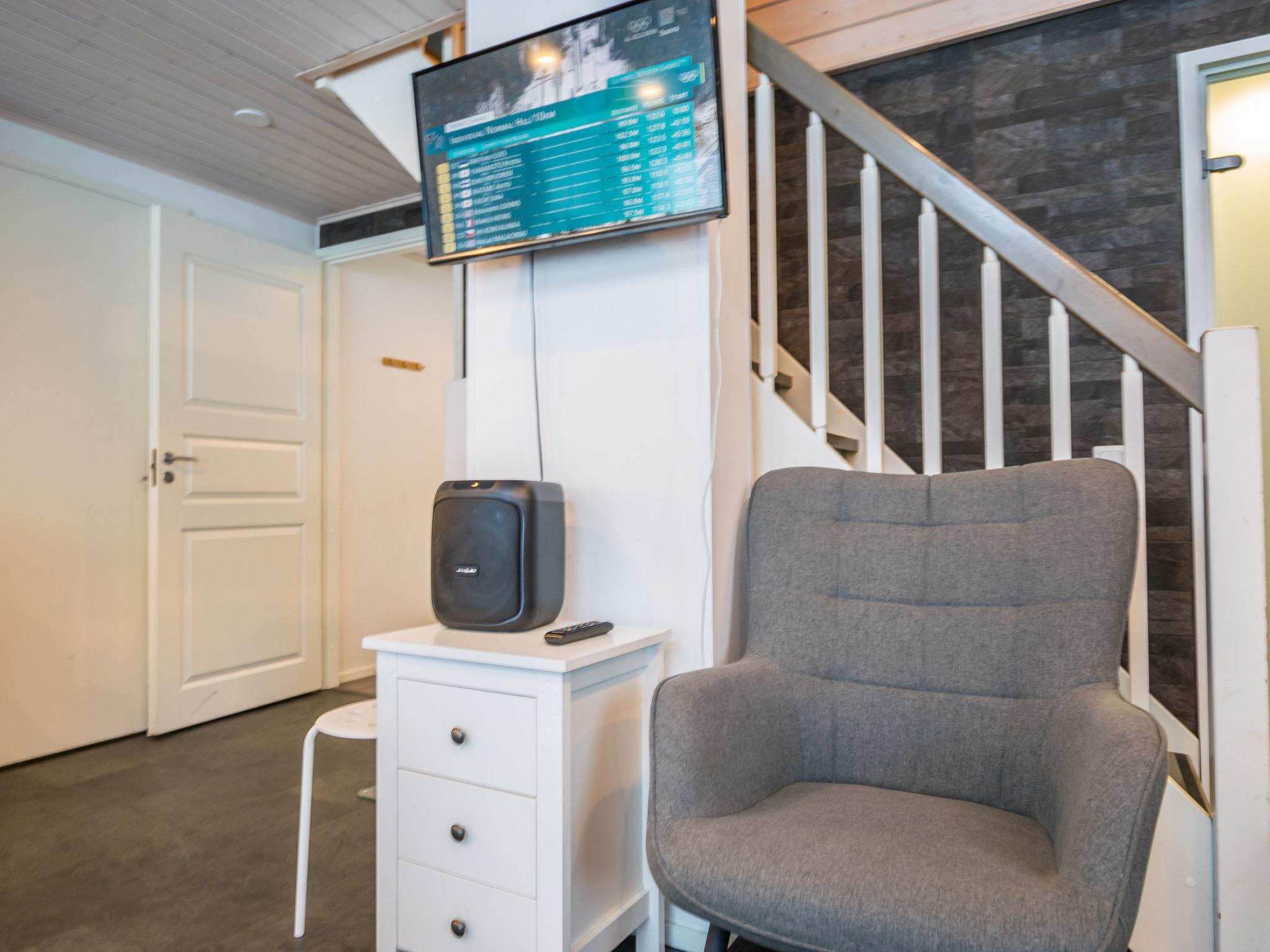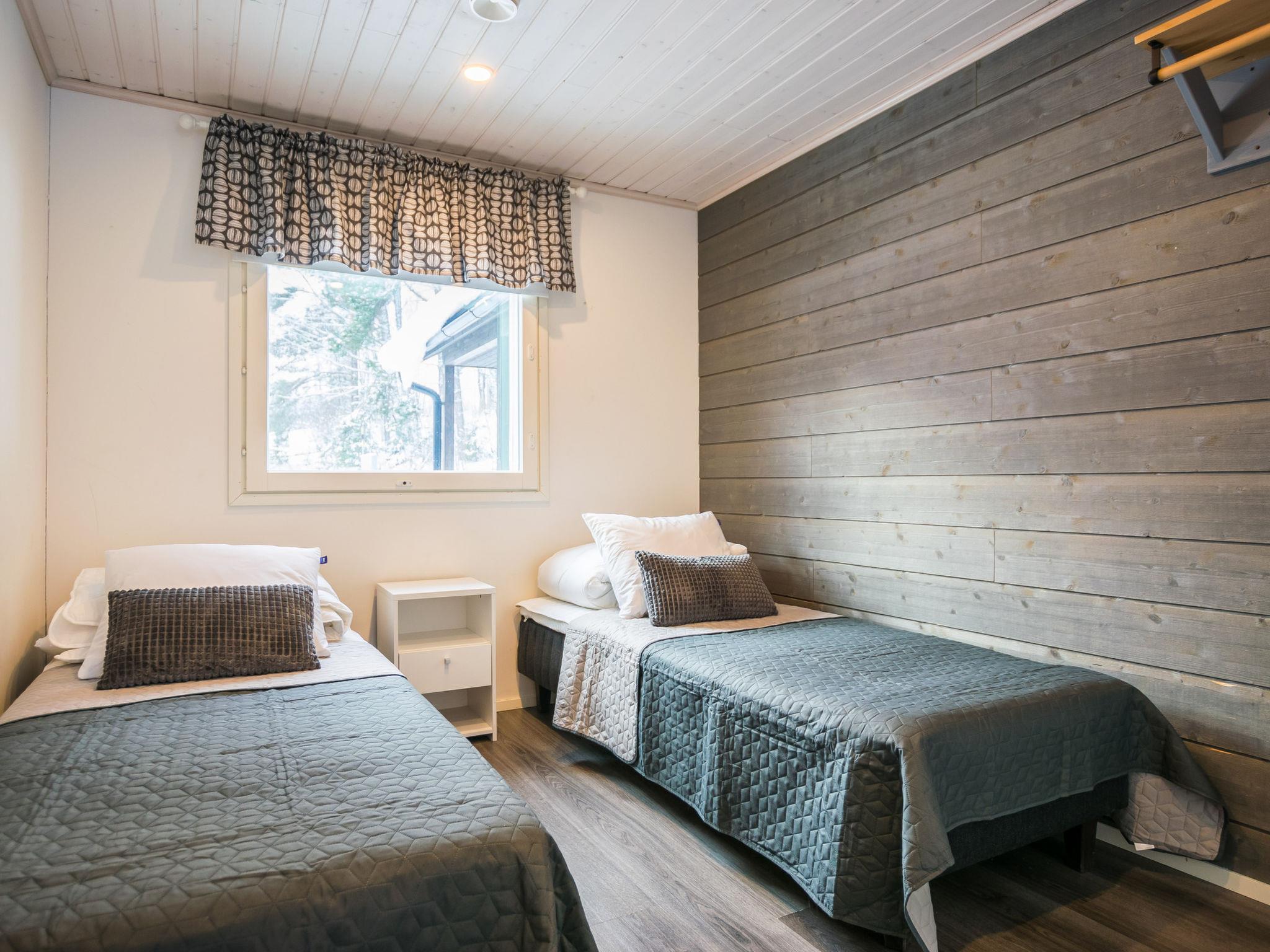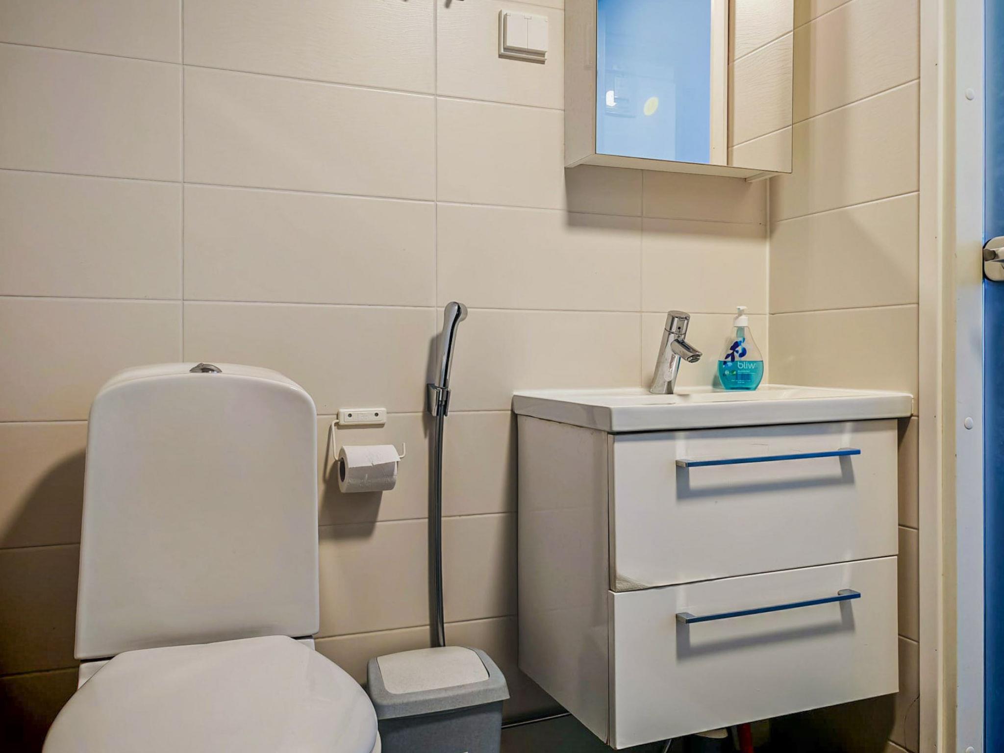 This wooden-structured aparment includes a combined kitchen/living room. The living room is equipped with a heat-storing fireplace, dining set, sofa, smart TV, and Bluetooth speaker. The downstairs bedroom has two 80x200 cm beds. The living room sofa can be converted into an extra bed for one person. The downstairs also includes a bathroom with a toilet, an electric sauna, and a washing machine.