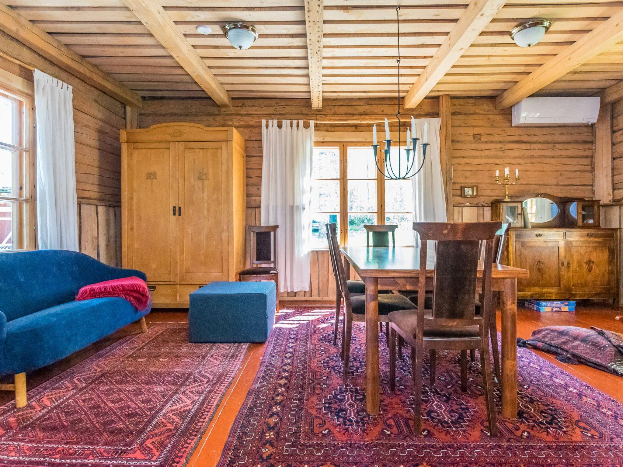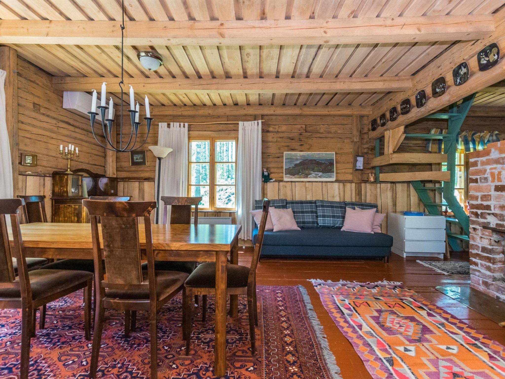 Log cabin built in 1995. Glazed porch, spacious living area with a large dining table and sofas, one of which converts into a 140×200 cm bed for two. Kitchenette, WC/washroom, and sauna with an electric sauna stove.