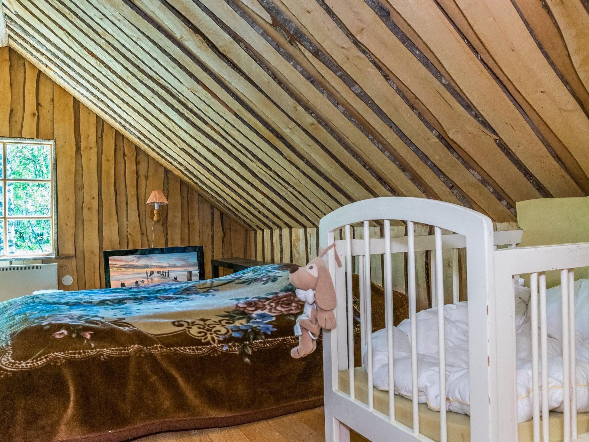 The upper floor features one 120×190 cm bed, a sofa bed that converts into a 140×190 cm bed, and one 80×200 cm mattress on the floor. A crib is also available. The cabin does not have a TV.