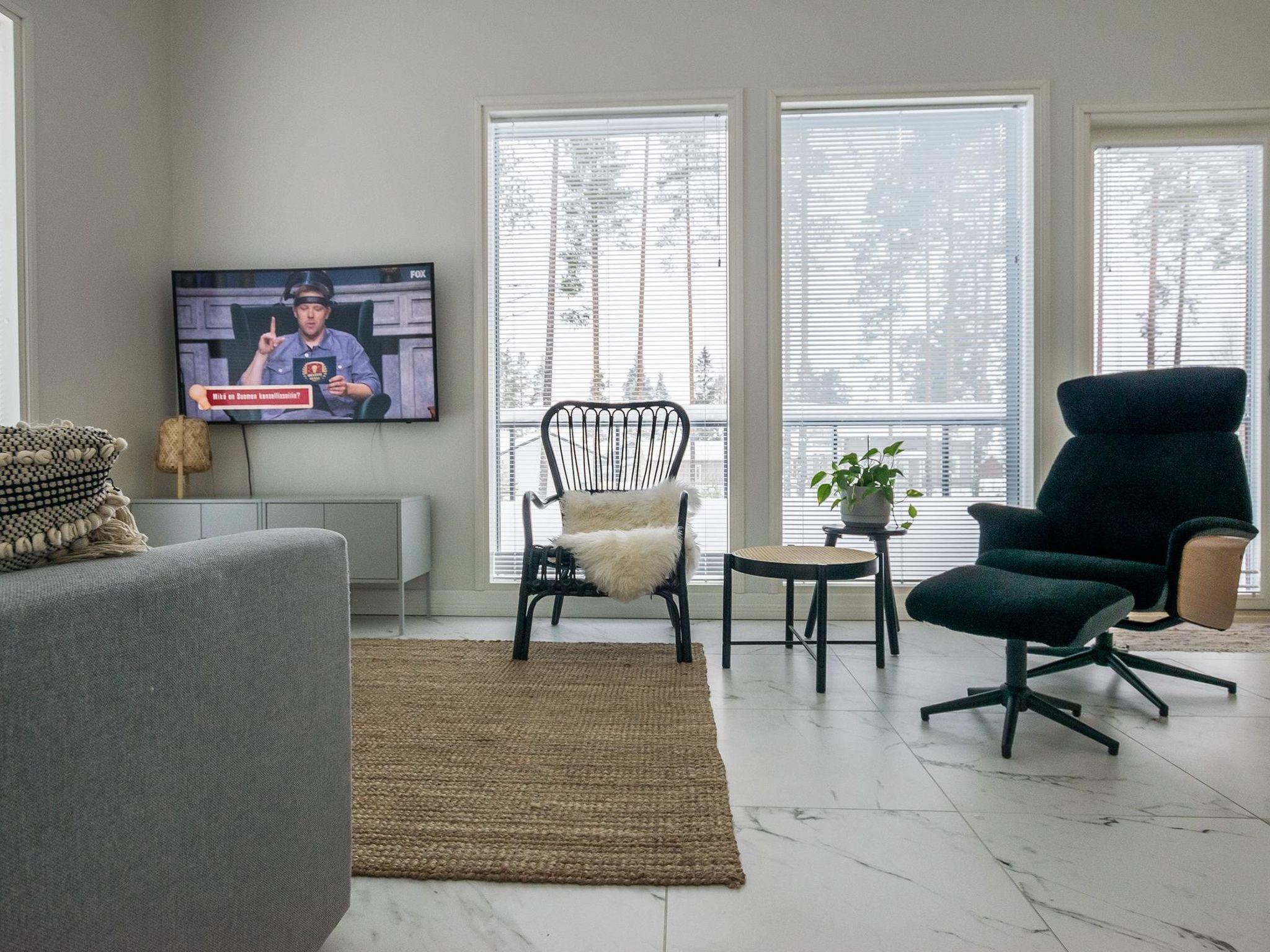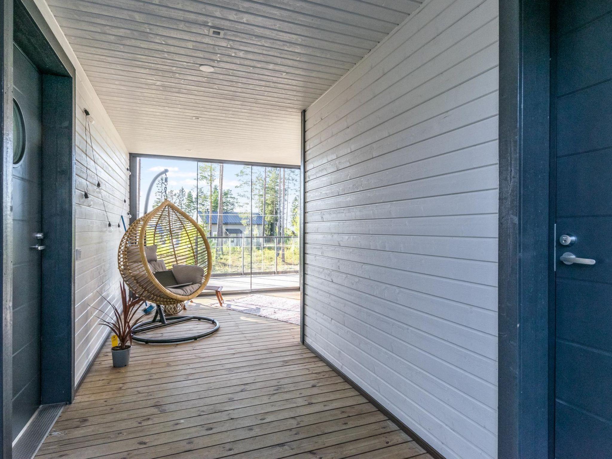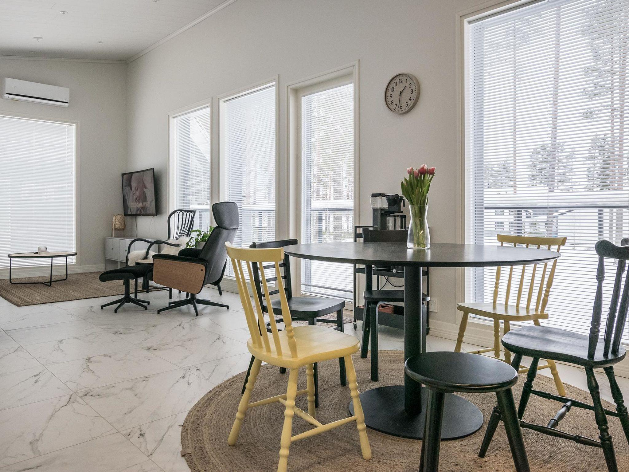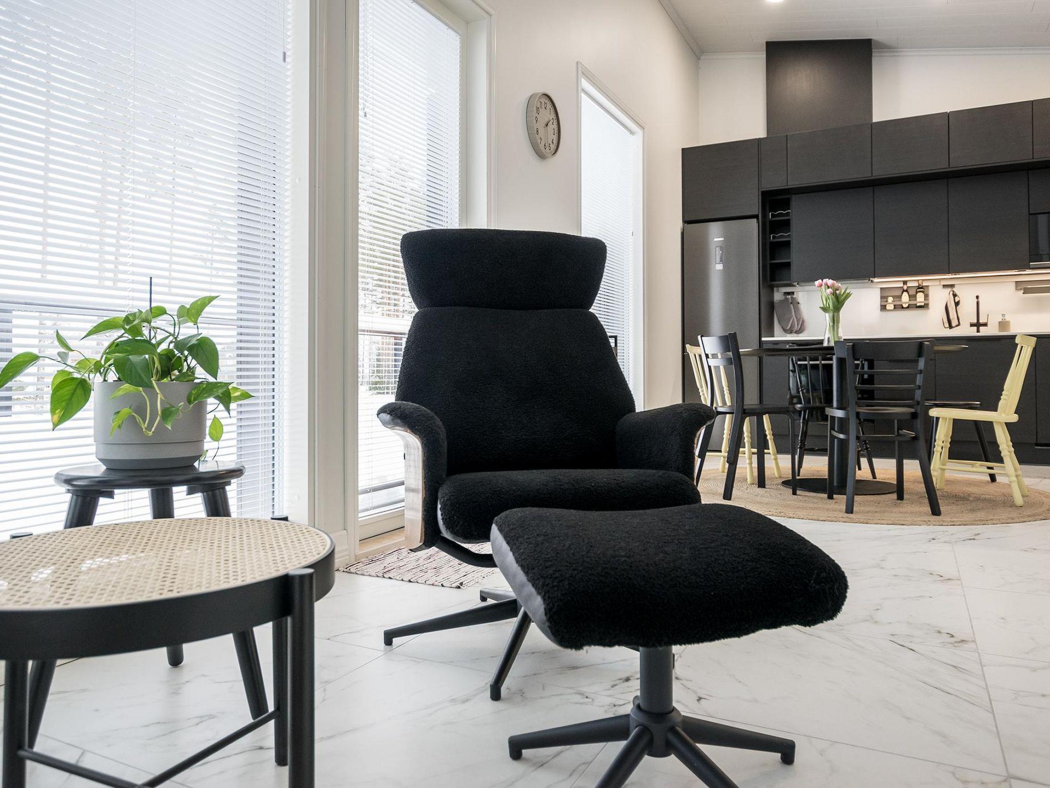 Wooden holiday home with boarded outer walls, built in 2021. Living room (140x190 cm sofa bed), living room/kitchen, heat storing fireplace, separate WC, utility room (washing machine and tumble dryer). Two bedrooms, bedroom 1: double bed, bedroom 2: double bed 140x200 cm and sofa bed (120 cm). Access to the bedroom is from the glazed terrace, the room is also a dressing room for sauna. Sauna is equipped with electric sauna stove, washroom with shower and WC, spacious glazed terrace.