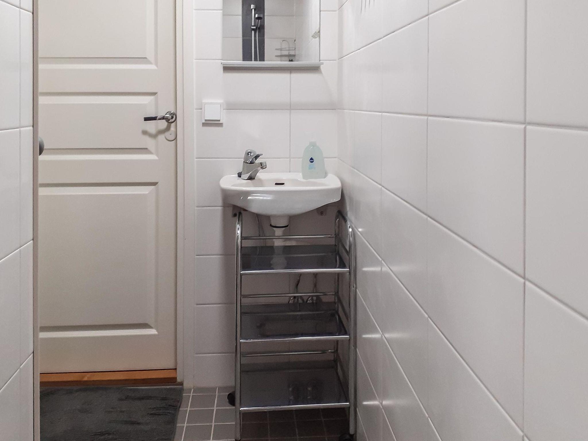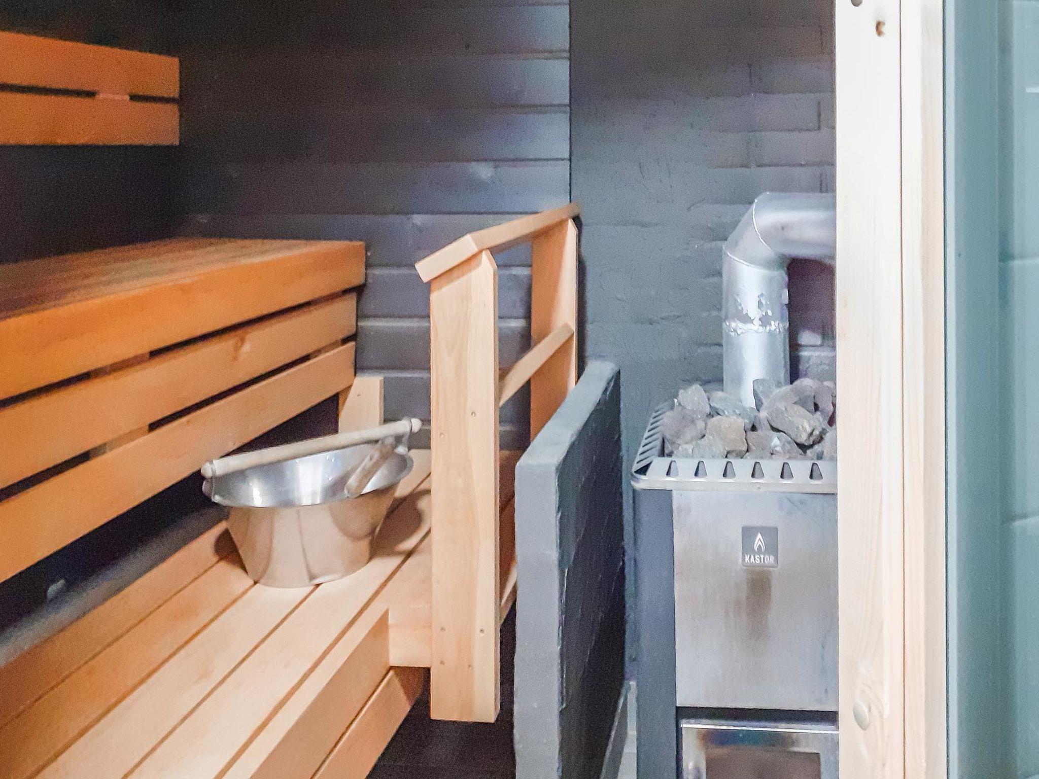 Living room with sofa bed for 1-2 persons, kitchen, bedroom with 120 cm wide bed, loft with two mattresses (rather steep steps to loft). Wood heated sauna, shower, toilet, terrace. Downstairs 42 m² + loft 12 m².