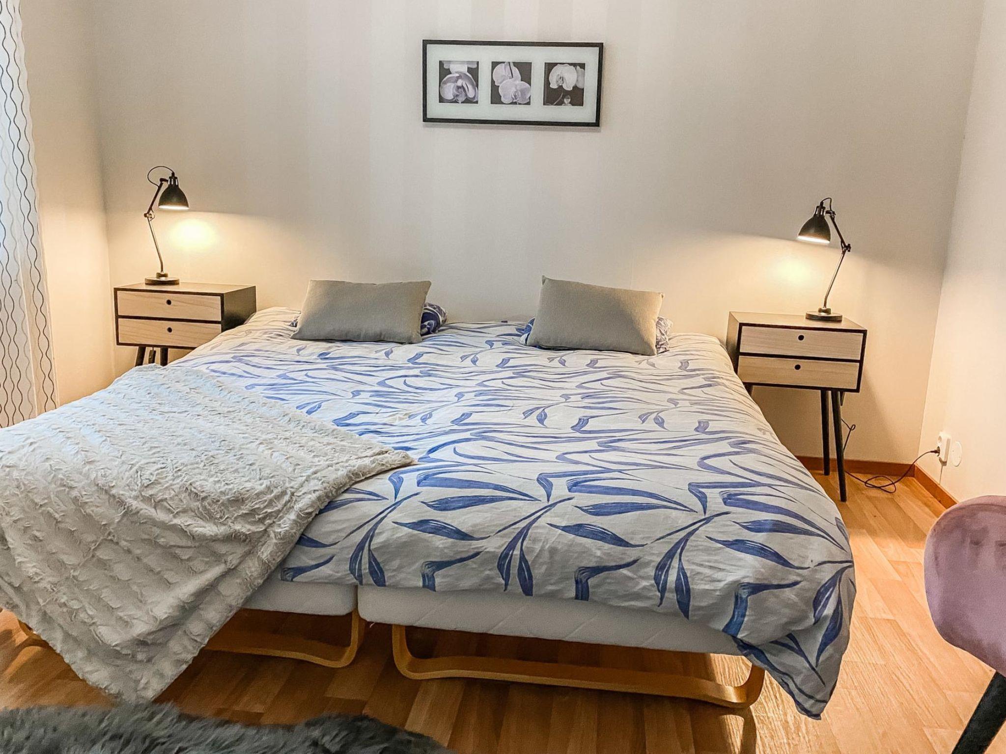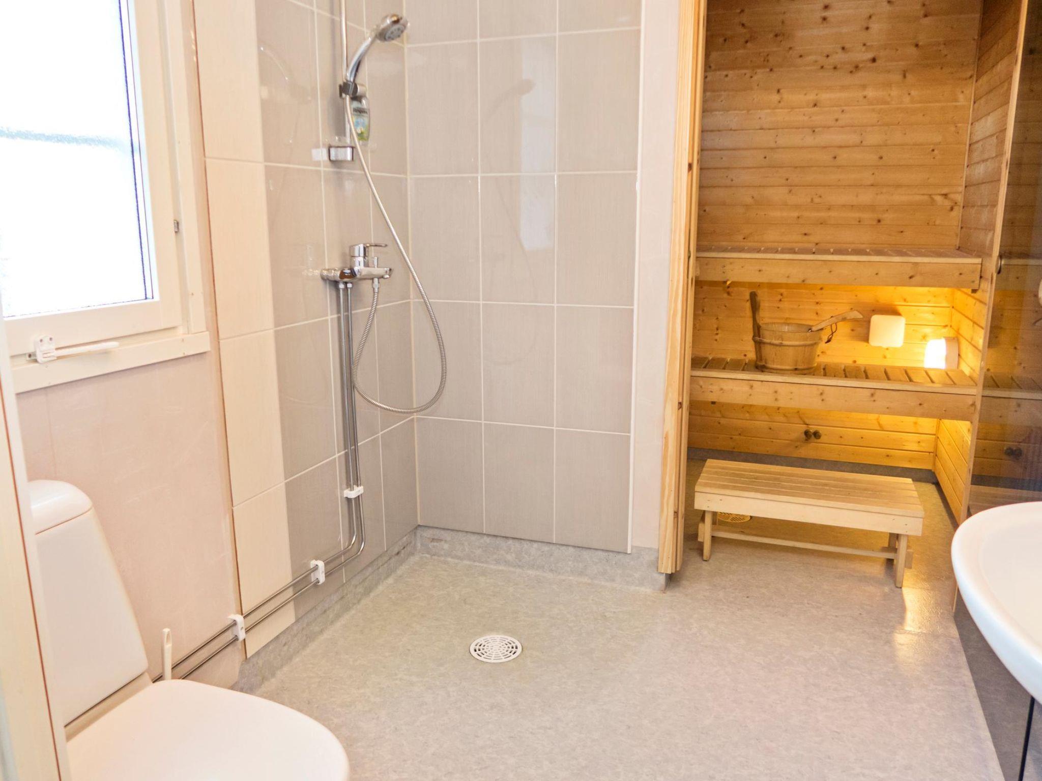 On the ground floor, lobby, living room with a sofa bed, bedroom: 2 beds á 80x200 cm (connected together but can be separated), utility room, washroom+WC, electric sauna, separate WC, large kitchen with dining table for 8 persons, two terraces.