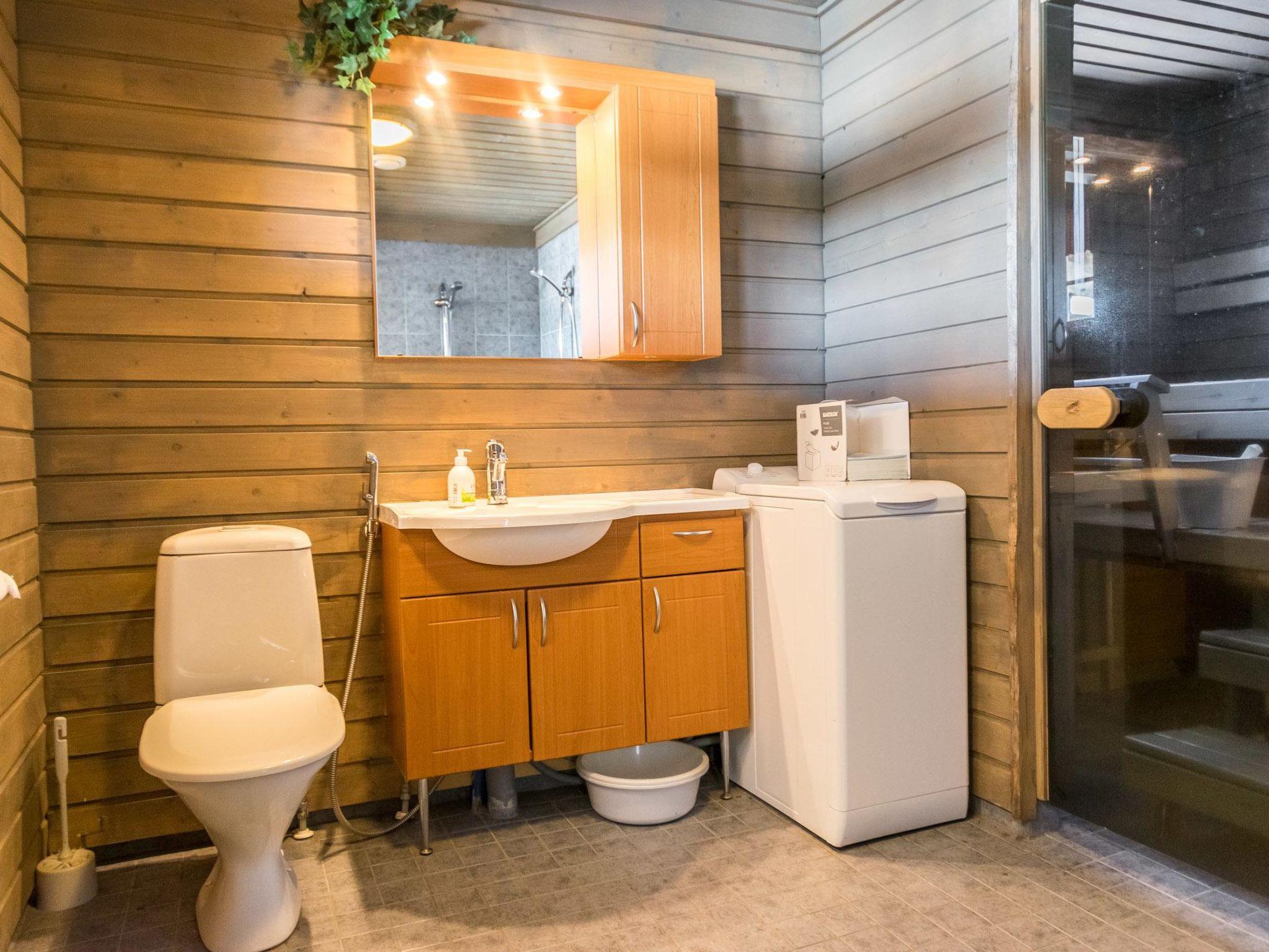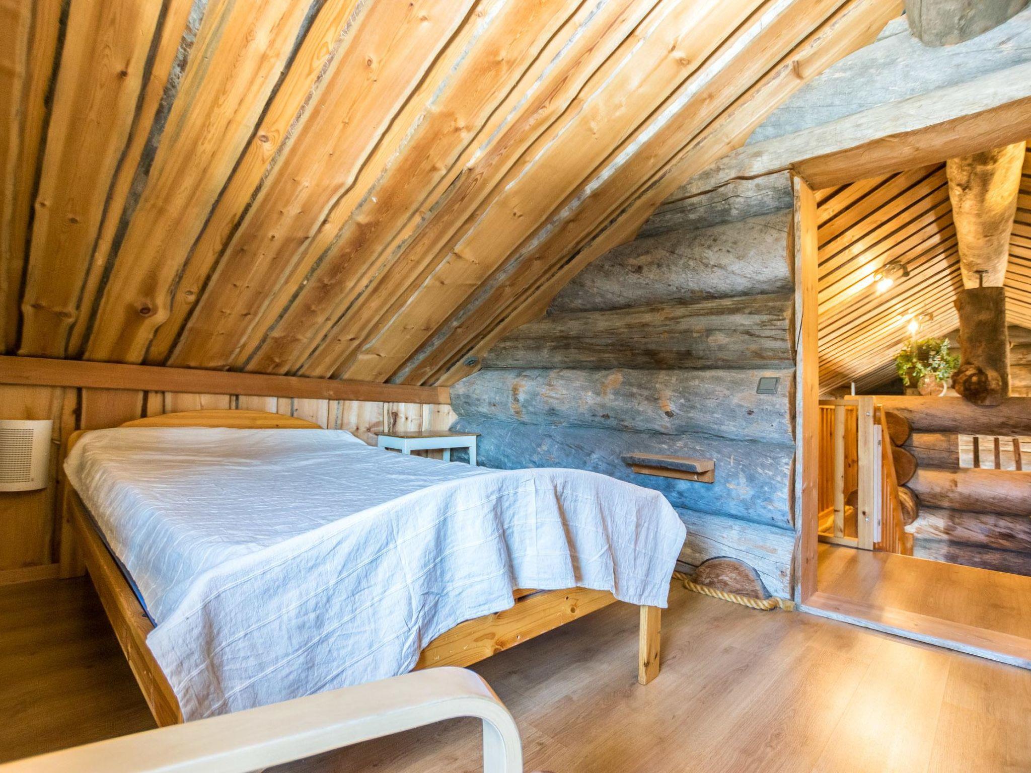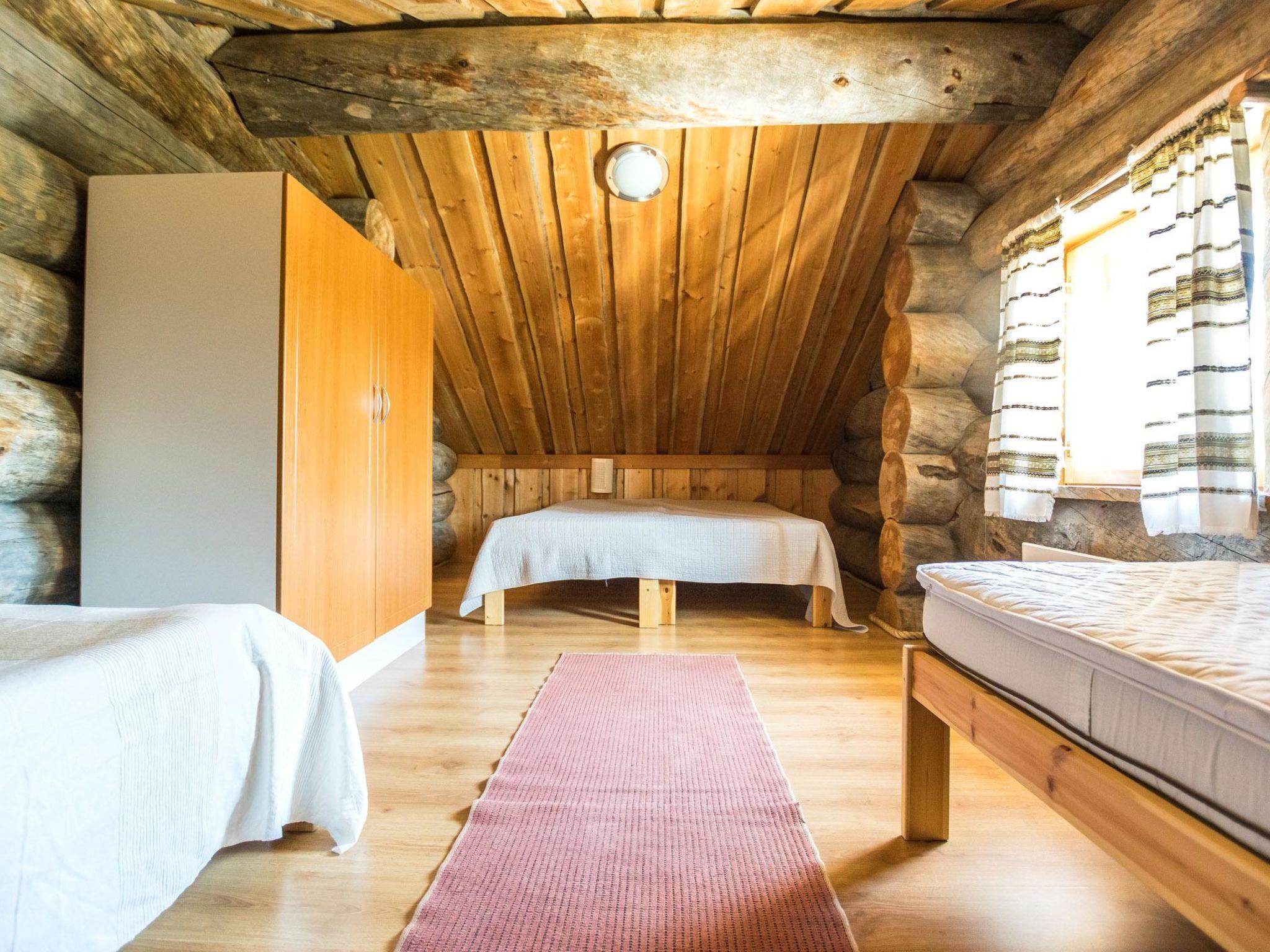 Log cabin, built in 2007. Living room/kitchen. Ground floor: three bedrooms, each with 2 beds. Upstairs with sloping ceilings: two bedrooms (no door): one with 2 beds and mattress, other with 3 single beds. Convertible sofa bed as extra bed in upstairs lobby. Electric sauna and bathroom with toilet. Additionally separate toilet.