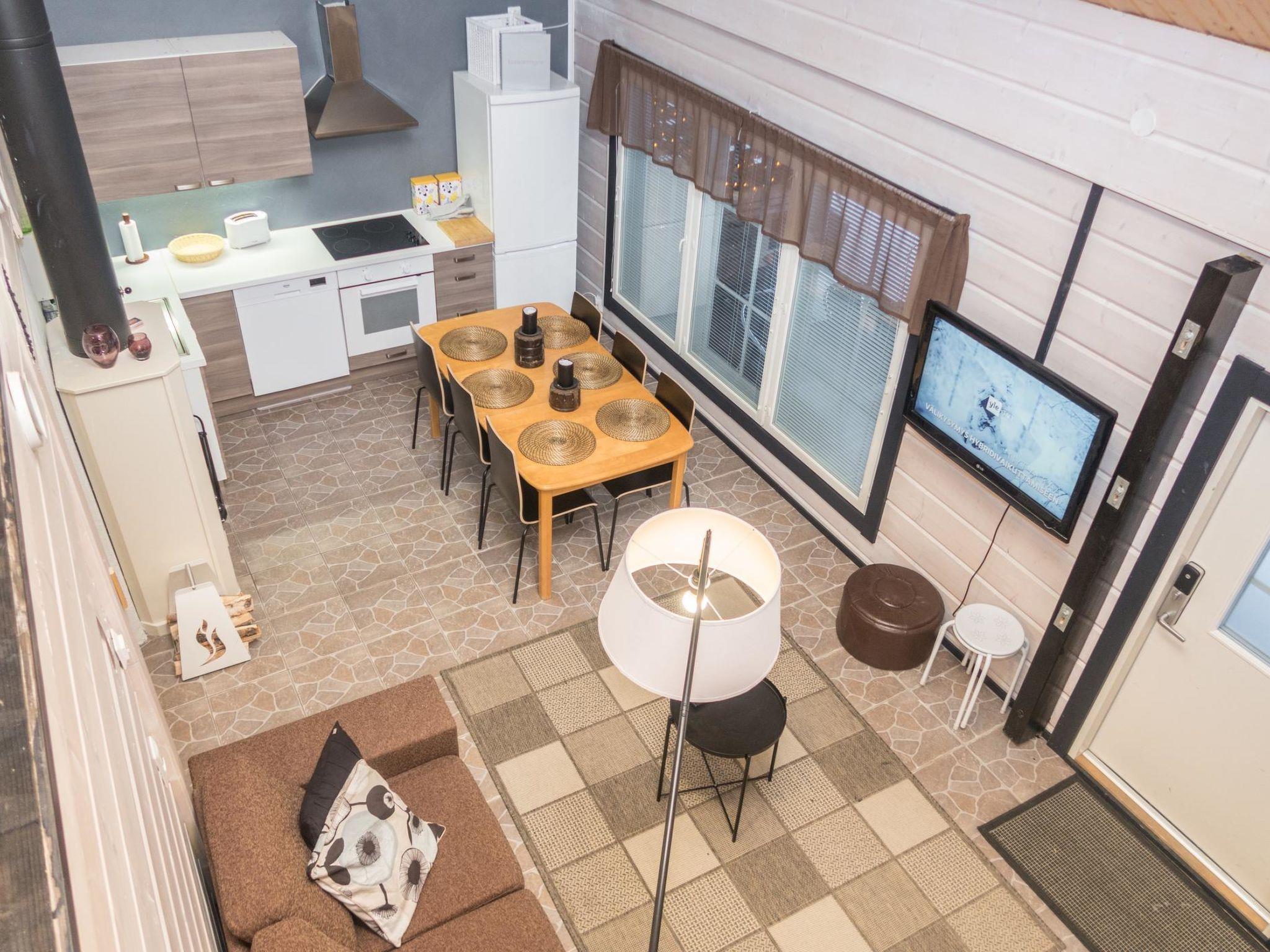 Log semi-detached house, built in 2014. Bedroom: double bed, loft: 2 beds + 2 mattresses, steep stairs to the loft. Living area, living room/kitchen, electric sauna.