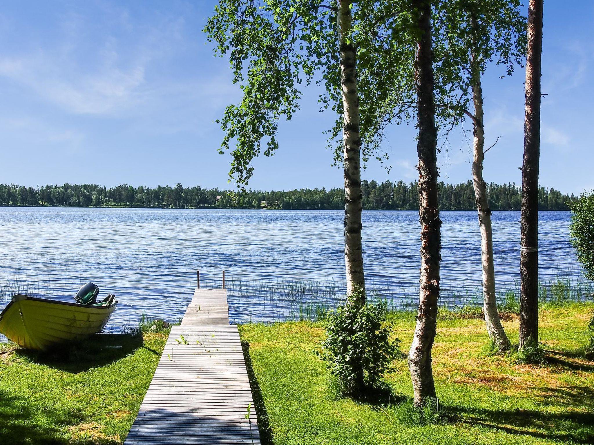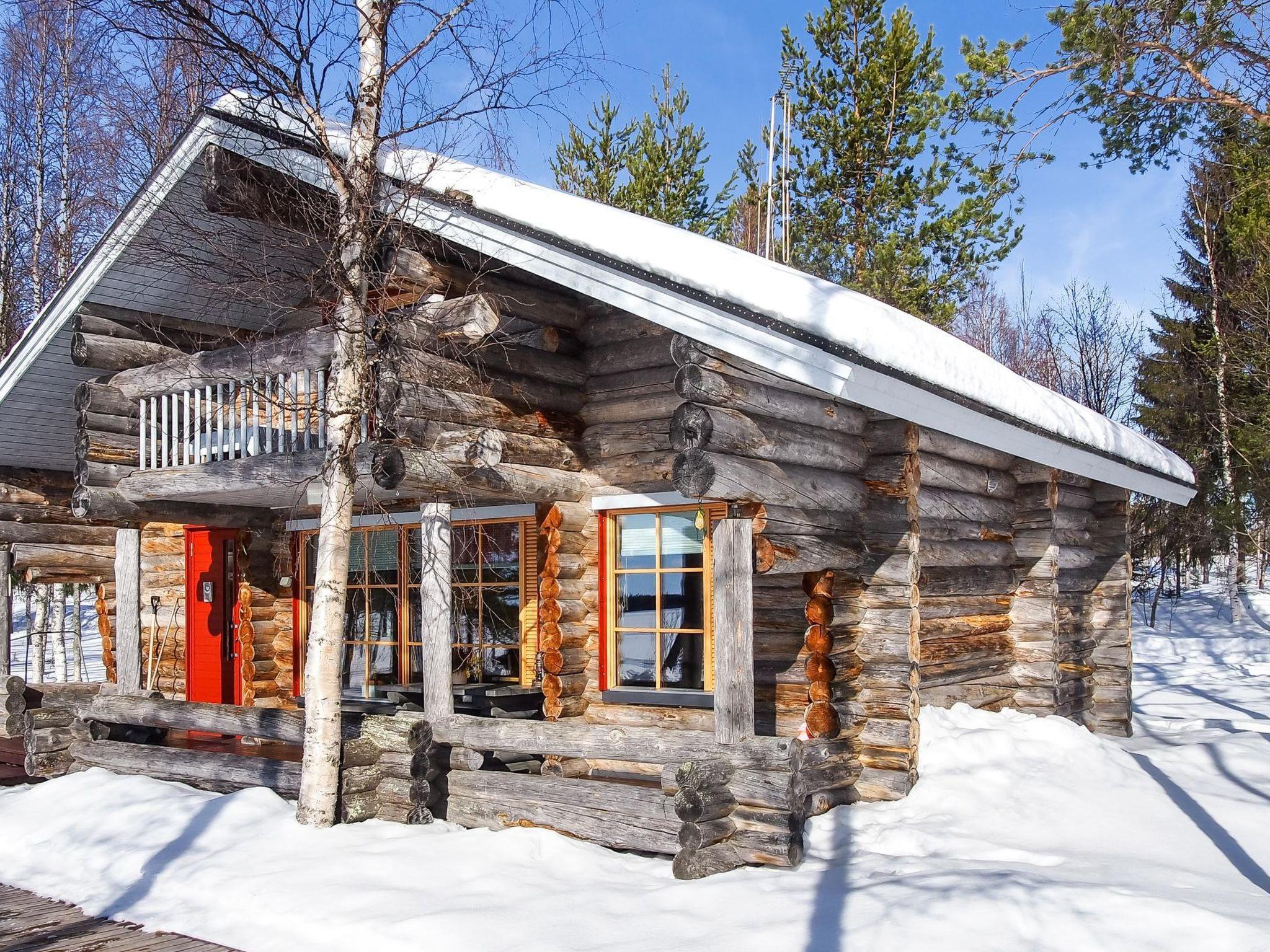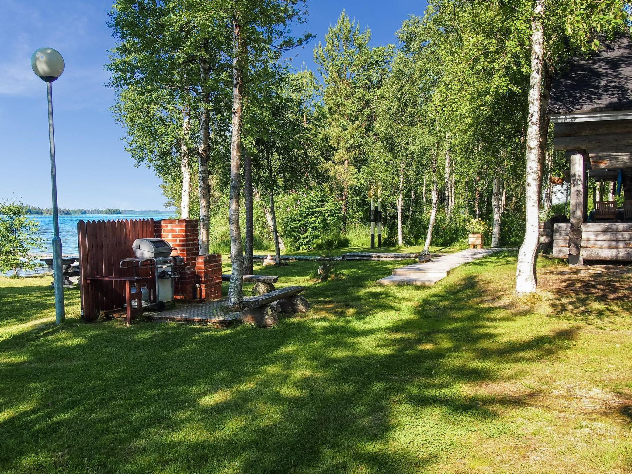 Log cabin on the shore of Lake Alakitkajärvi. The yard is grassy and well maintained.