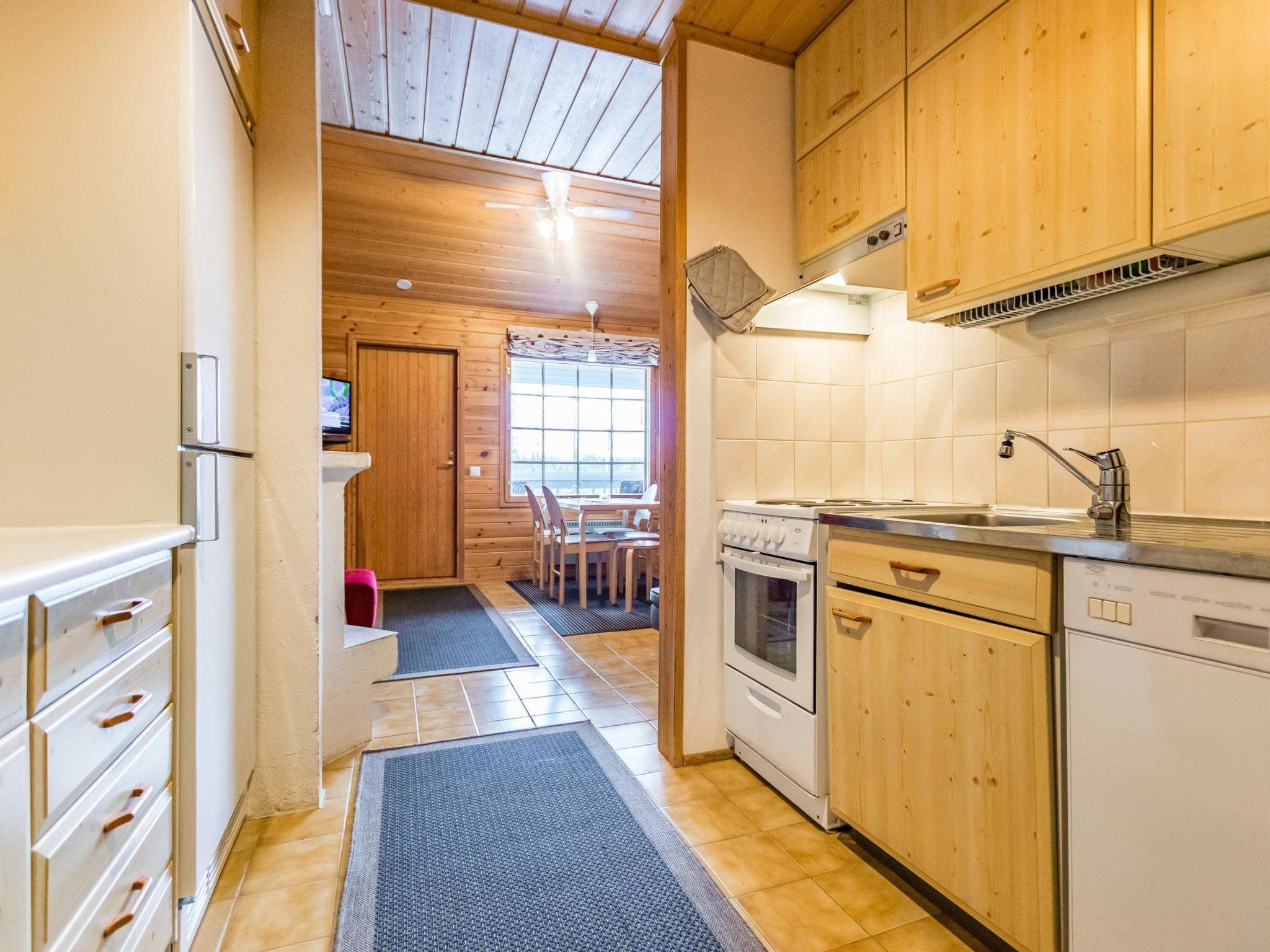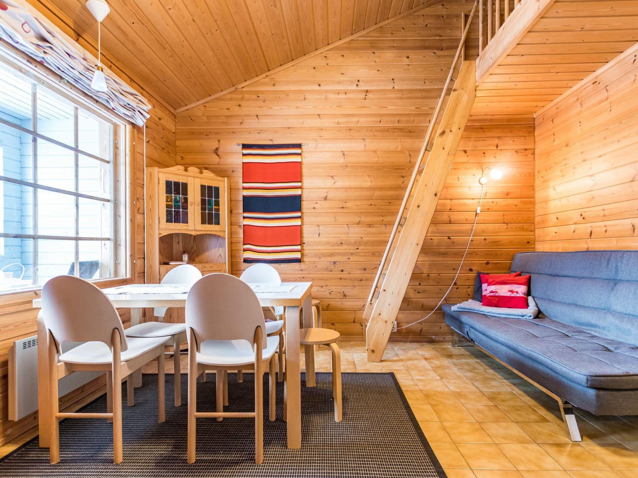 20km north of Kuusamo, Ruka 8km, Lake Ihtinkijärvi 50m, beach 100m, sandy/rock bottom beach, jetty. Studio in log-built row house, built in 1989, convertible sofa in living room, low loft: 4 mattresses (floor area 15 m², low room height, steep stairs to the loft), combined kitchen/living room, electric sauna.