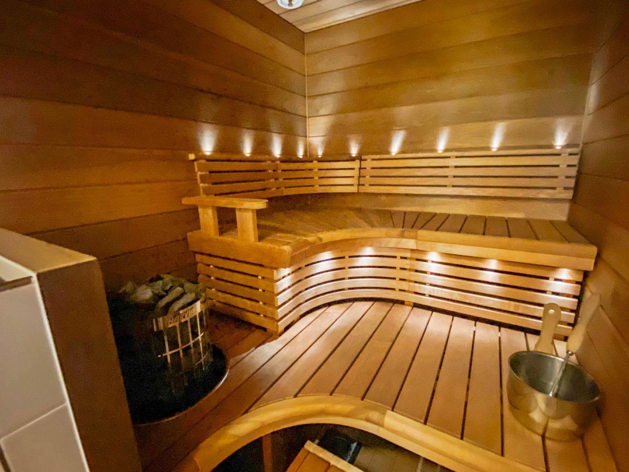 Downstairs there is a glazed cooling terrace at the second entrance. Washroom (2 showers), sauna, toilet, washing machine and drying cabinet. Dressing room.