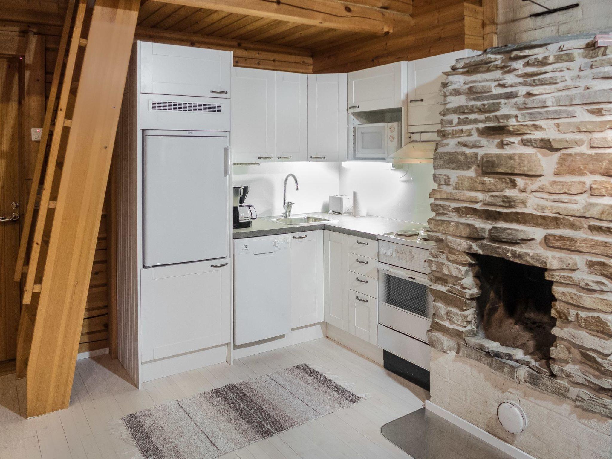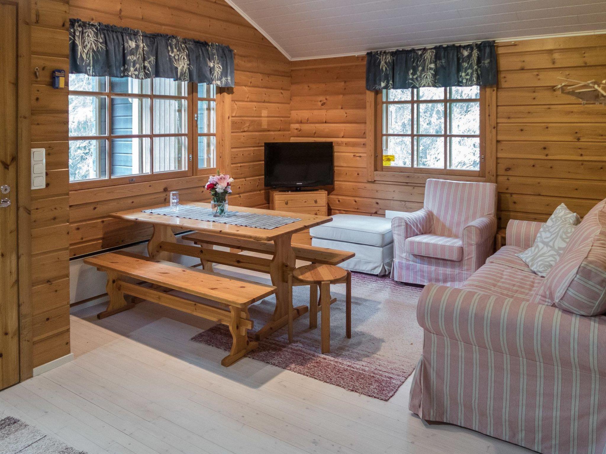 27km north of Kuusamo, East Ruka 3 km, Lake Vuosselijärvi 200m. Log apartment in the semi-detached cottage, built in 1990, bedroom 1: double bed, loft (8 m², sloping ceilings, steep stairs): 1 bed + 2 mattresses, combined kitchen/living room, electric sauna.