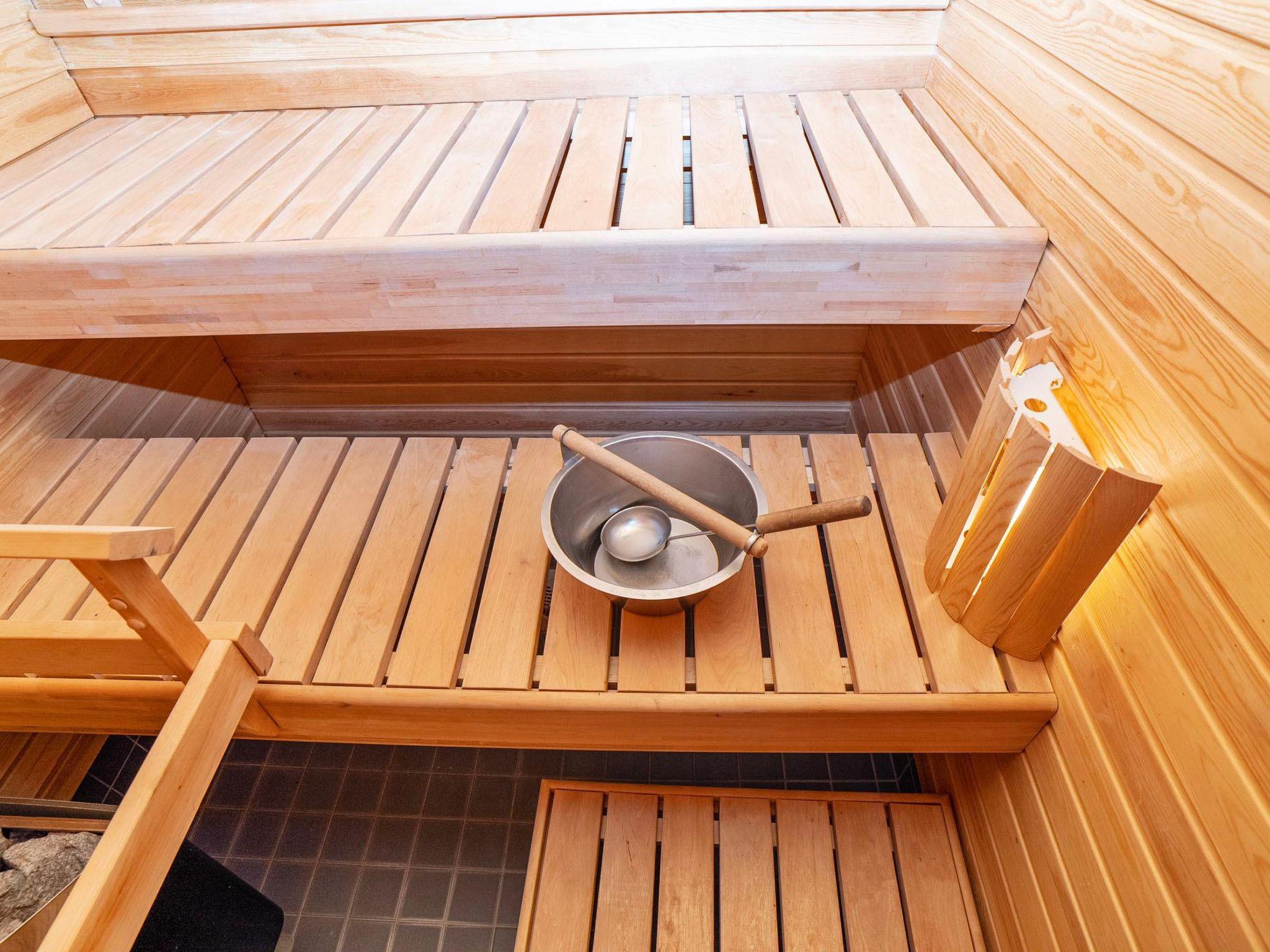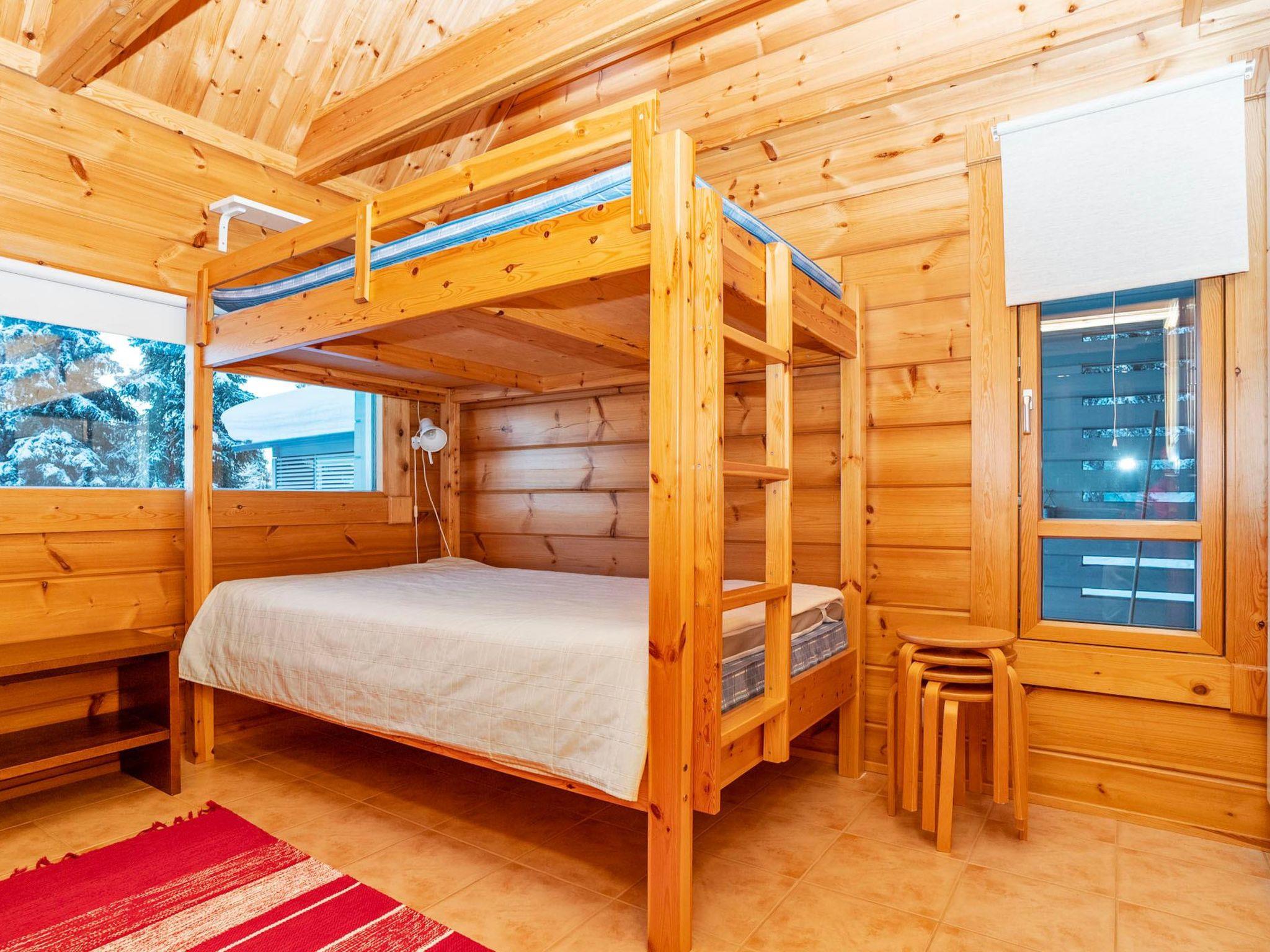 High level apartment in log-built semi-detached house, built in 2005. Bedroom 1: double bunk bed (width 140 cm), bedroom 2: 2 beds (can not be separated), bedroom in loft: 2 beds, loft (room heigth less than 2 m), steep stairs to the loft, living room: convertible sofa, combined kitchen/living room, electric sauna.