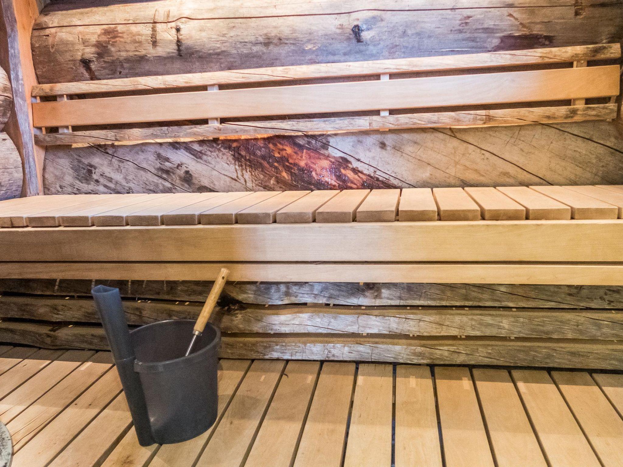Additional wood-heated sauna by the pond, dressing room with fireplace and double sofa bed.