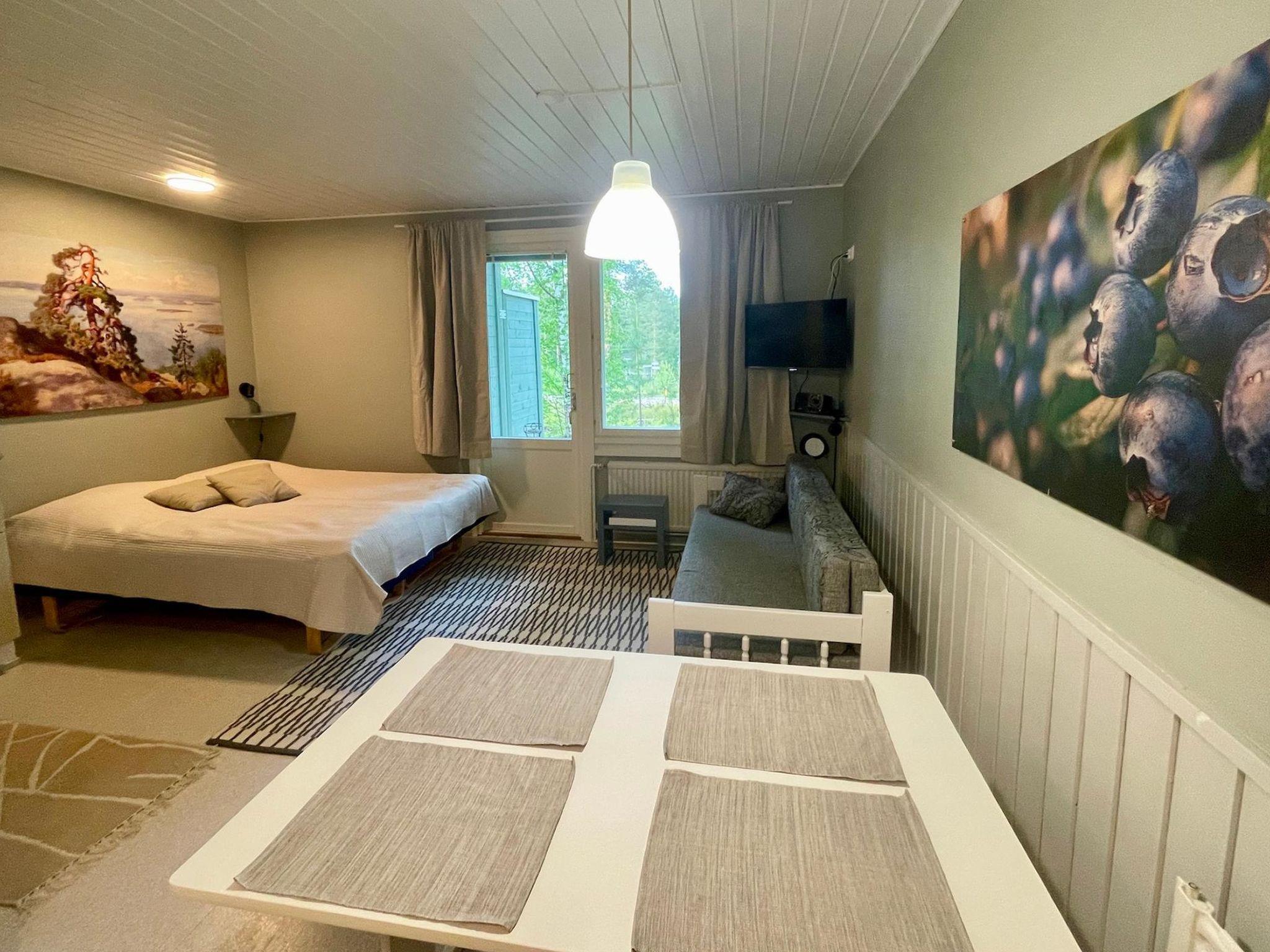 77 km north of Joensuu, 7 km to the village of Koli, pond Käränkälampi 180 m (length 2 km, width 1,5 km). Wooden row house flat, renovated in 1990 and updated in 2025. Kitchen-living room with 2 separate beds next to each others and convertible sofa (140 cm when extended), refrigerator with ice box. There are also a washroom, e sauna (elec. stove) and terrace. There is also an air cooler for warm weather.