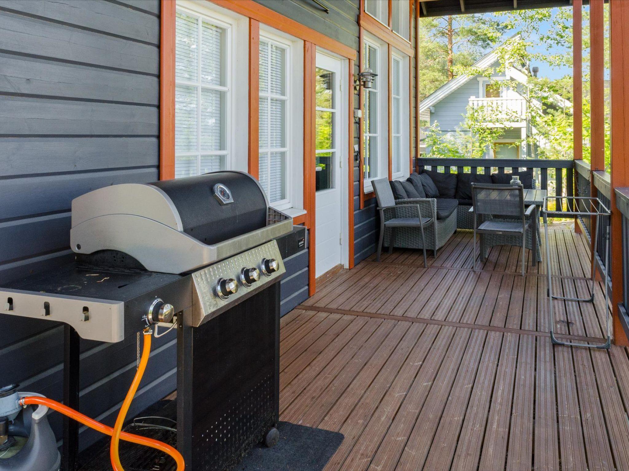 Wooden cabin, built in 2012, features a living room/kitchen and a bedroom with a double bed on the ground floor. The ground floor also includes a bathroom, a sauna with an electric sauna stove, and a separate WC.