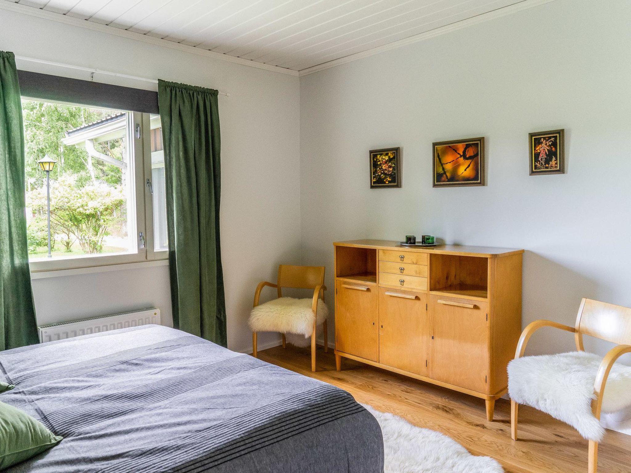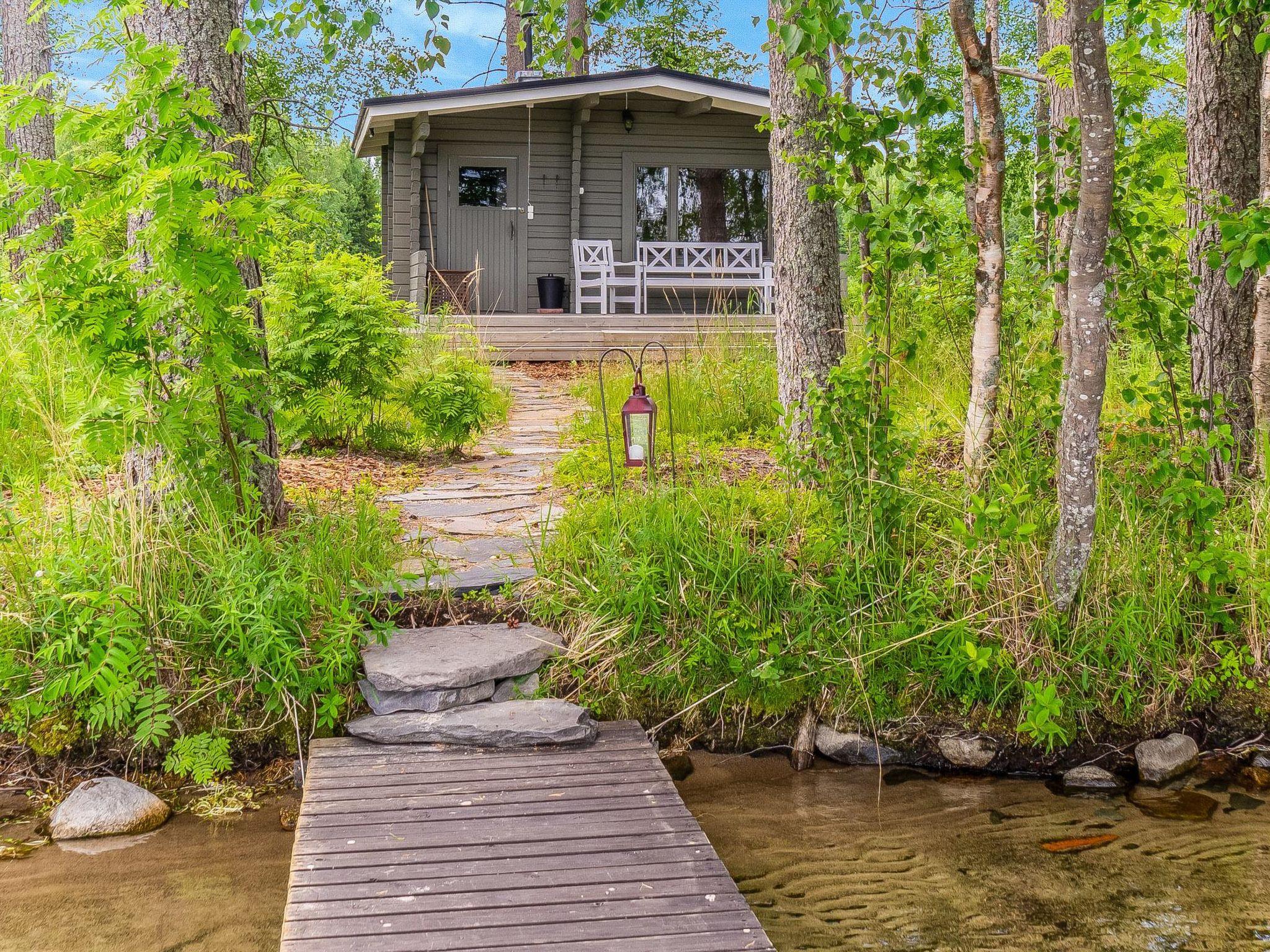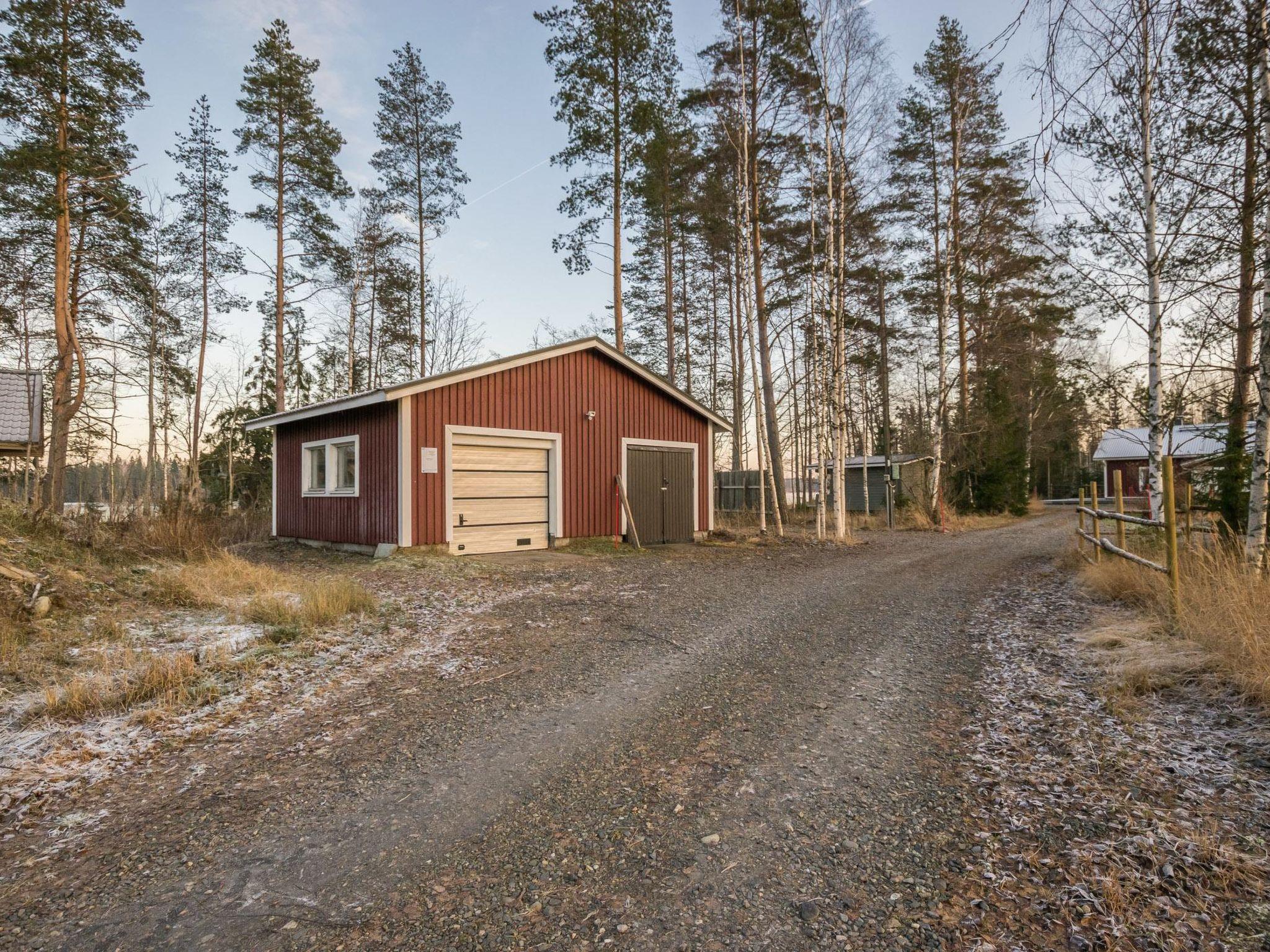 Lakeside sauna with wood-burning sauna stove and dressing room. Garage. Air source heat pump.