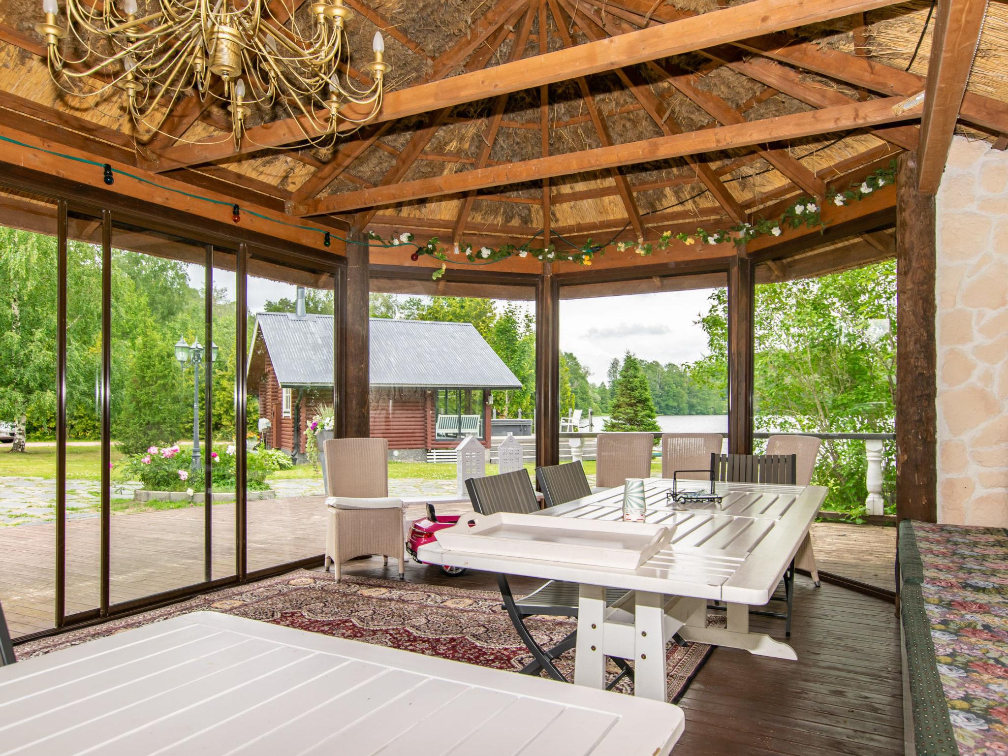 At the beach, there is a wood-heated lakeside sauna, which includes a separate living room (with sofas and a fireplace) and a terrace with a hydro massage bath. The private sandy beach is shallow at the shore but deepens quickly. Private pier and a rowing boat.
