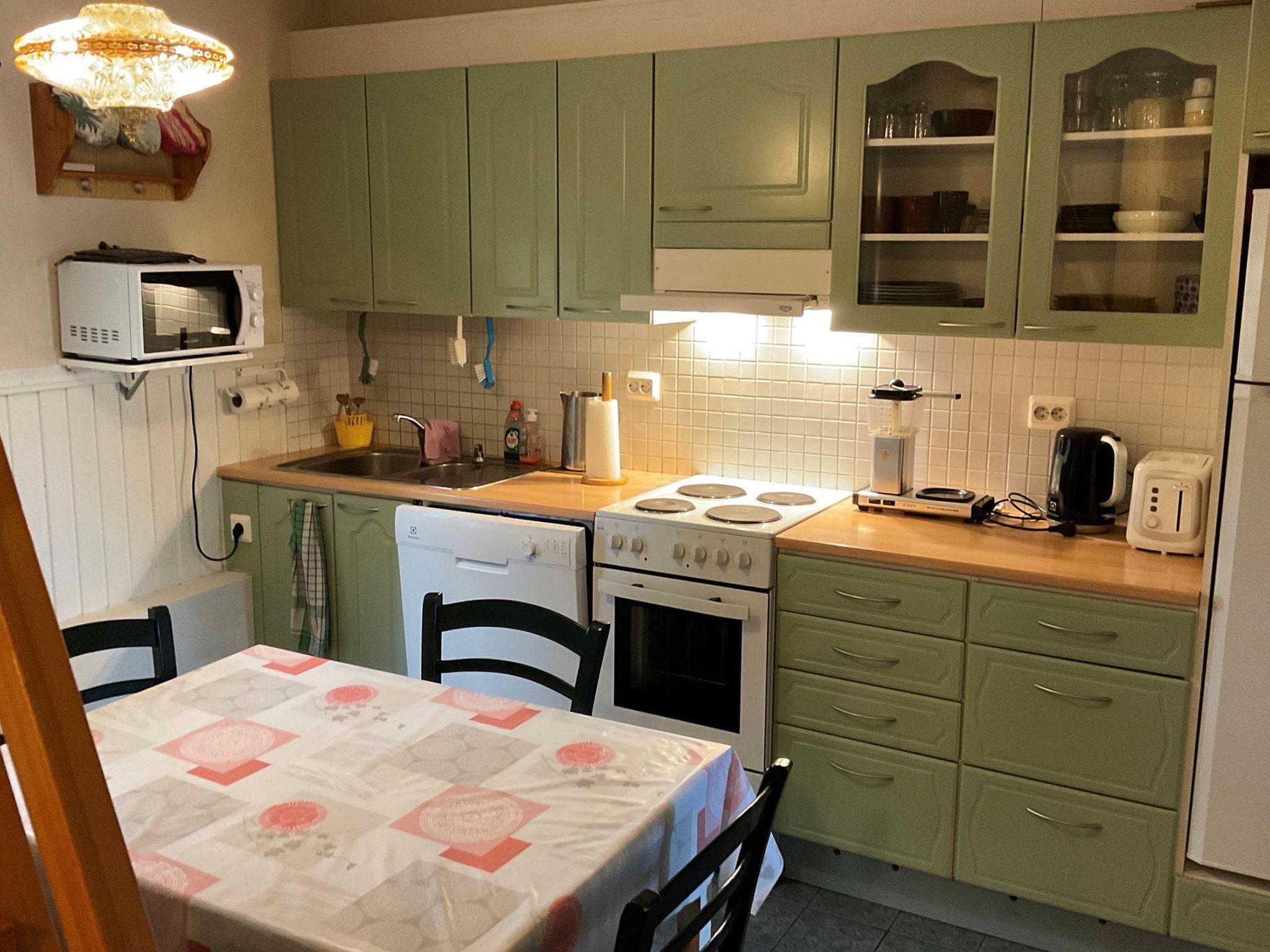 Wooden villa 2000, expanded 2006, kitchen, living room with 1 bed, bedroom with double bed, sleeping alcove (sliding door) 1 bed. Upstairs bedroom with double bed, another bedroom with single bed and rattan furniture group and window that can be fully opened. In addition Dream'n Play Plus travel bed / extra bed for baby. The entrance to the smaller bedroom is through the larger bedroom. Passage to the upper floor via steep staircase. Electric sauna, hall, terrace.