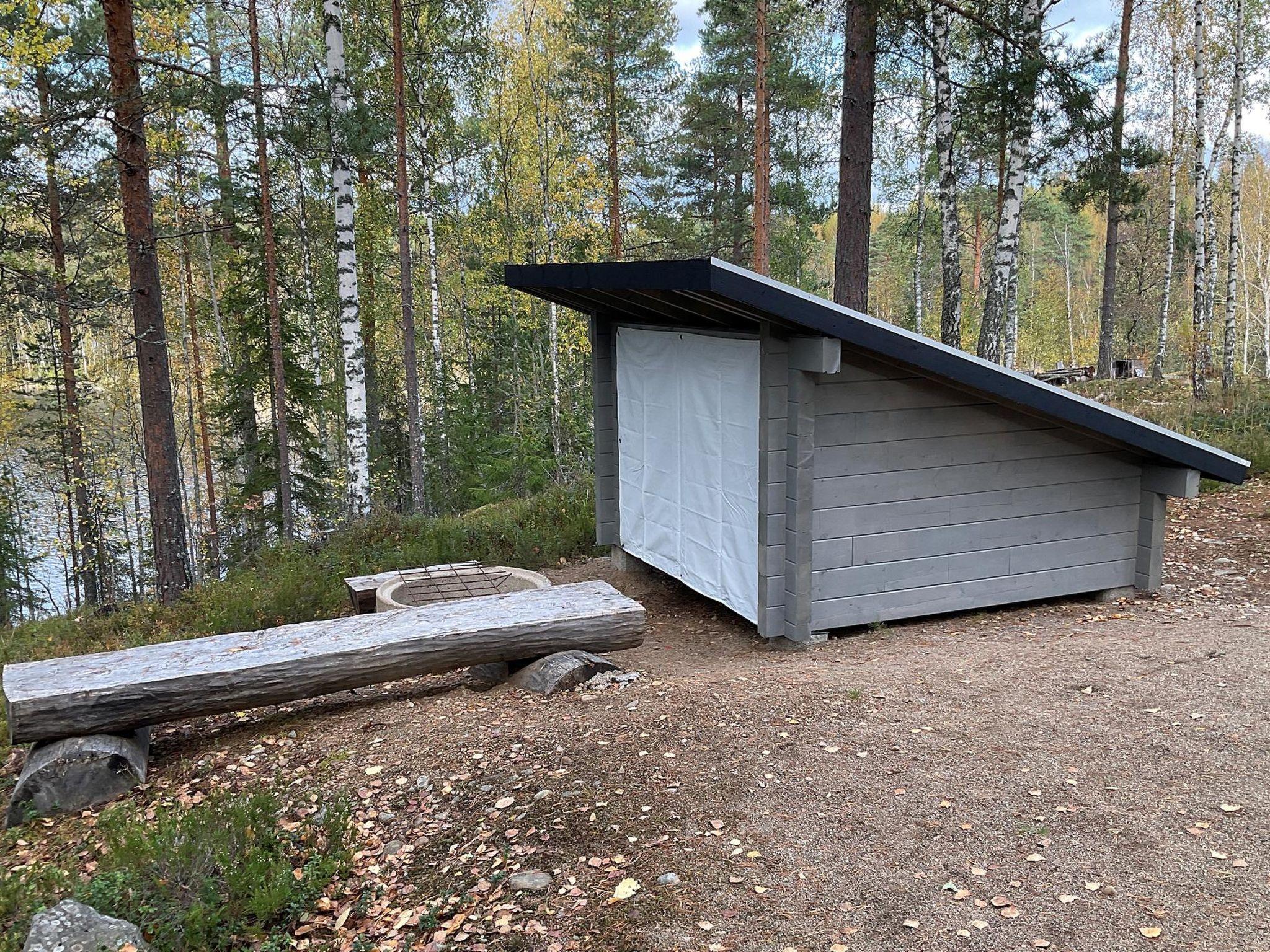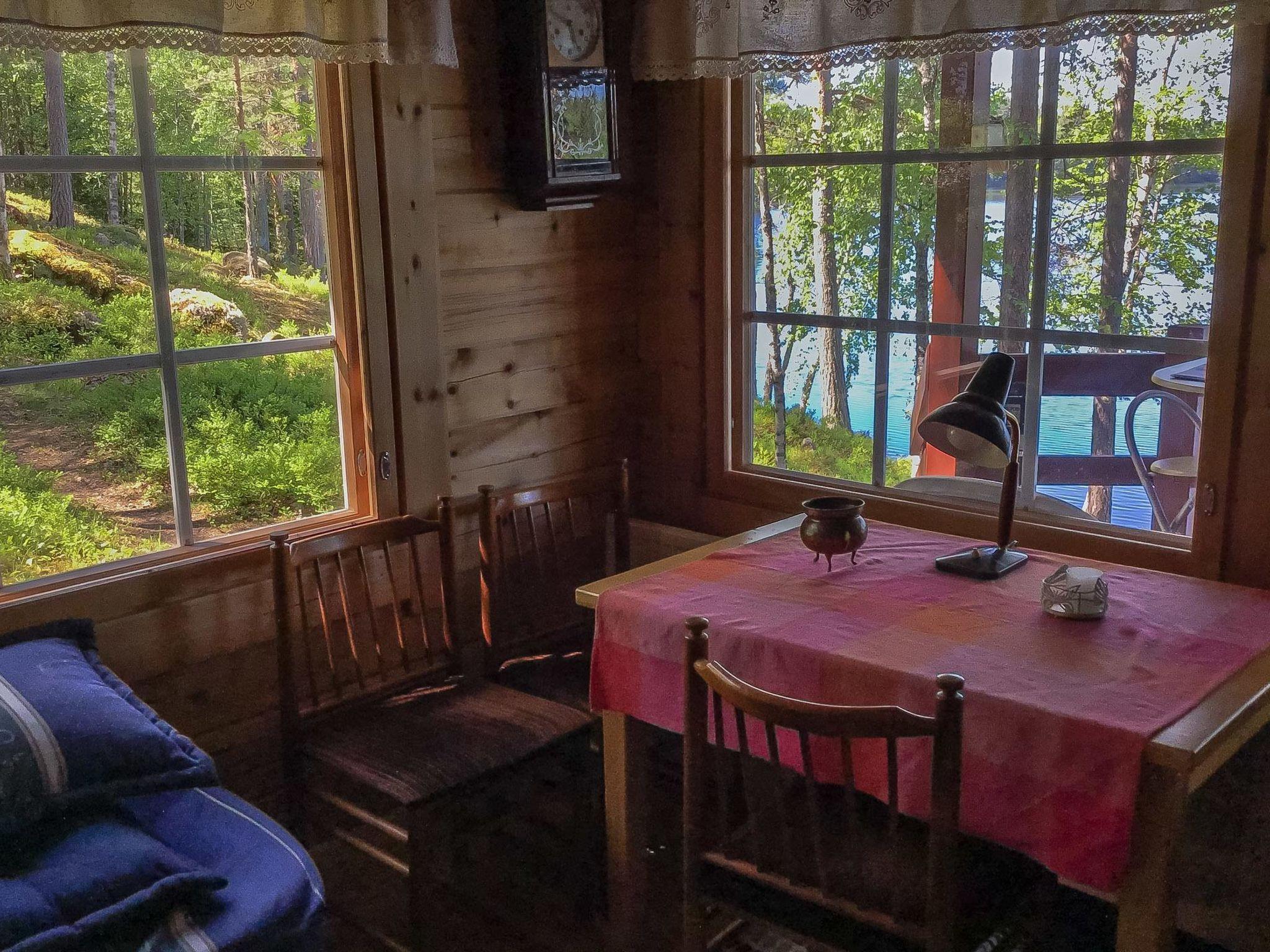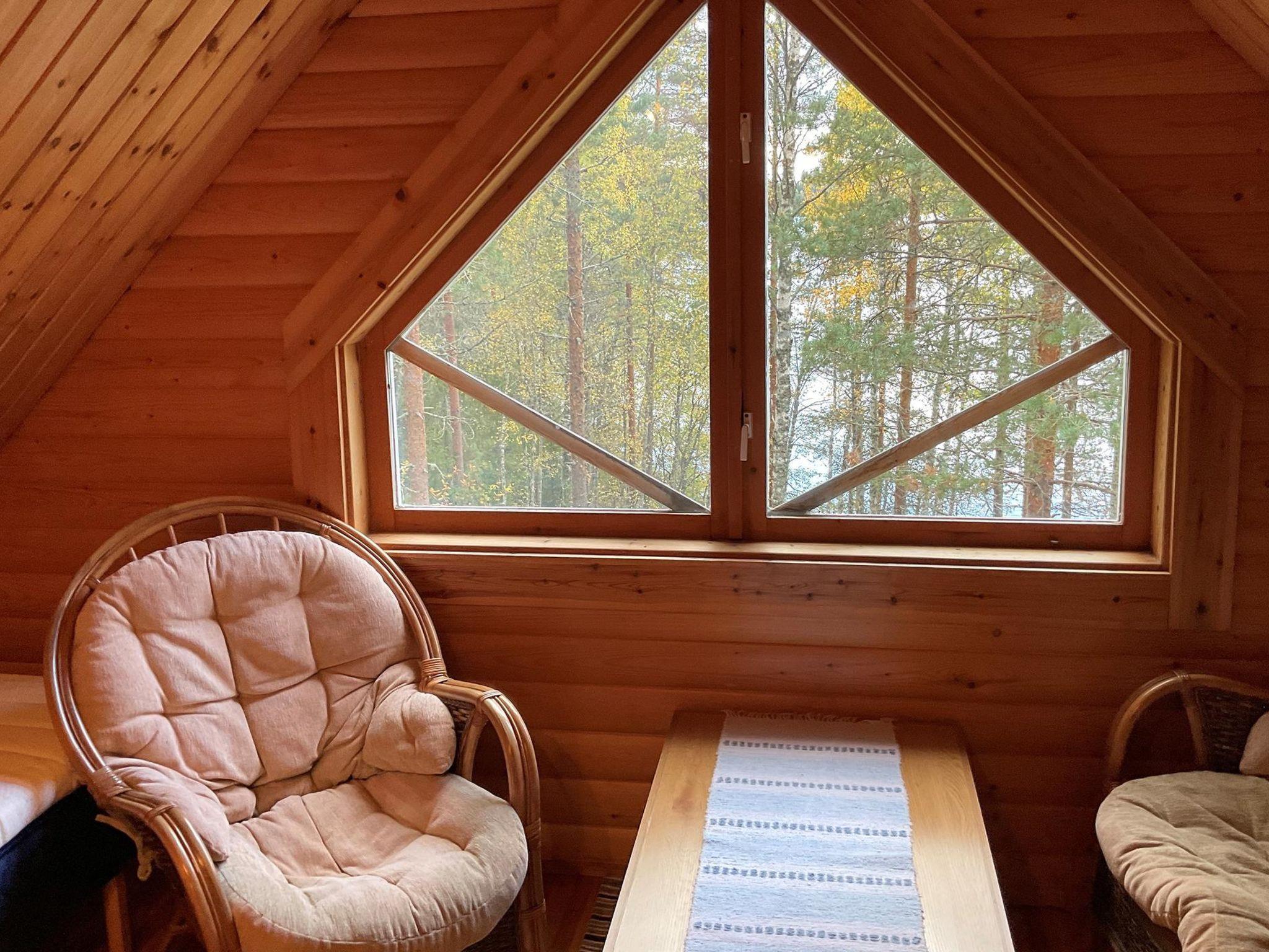 Separate lakeside sauna with wood-burning stove, dressing room, living room with fireplace and convertible sofa bed, covered terrace. Sauna building's fireplace room has minikitchen facilities without running water. There is electric radiator and fireplace for heating.