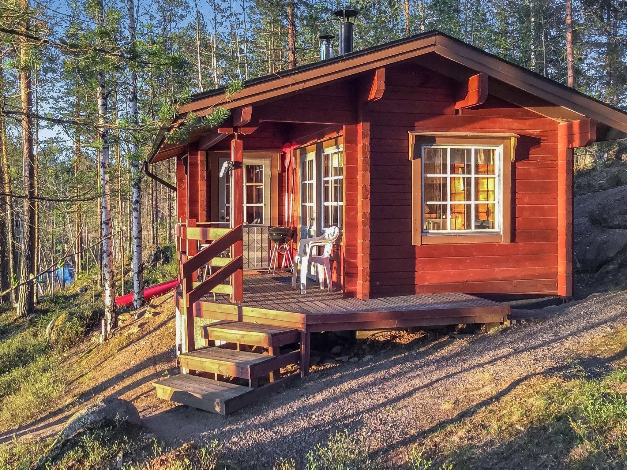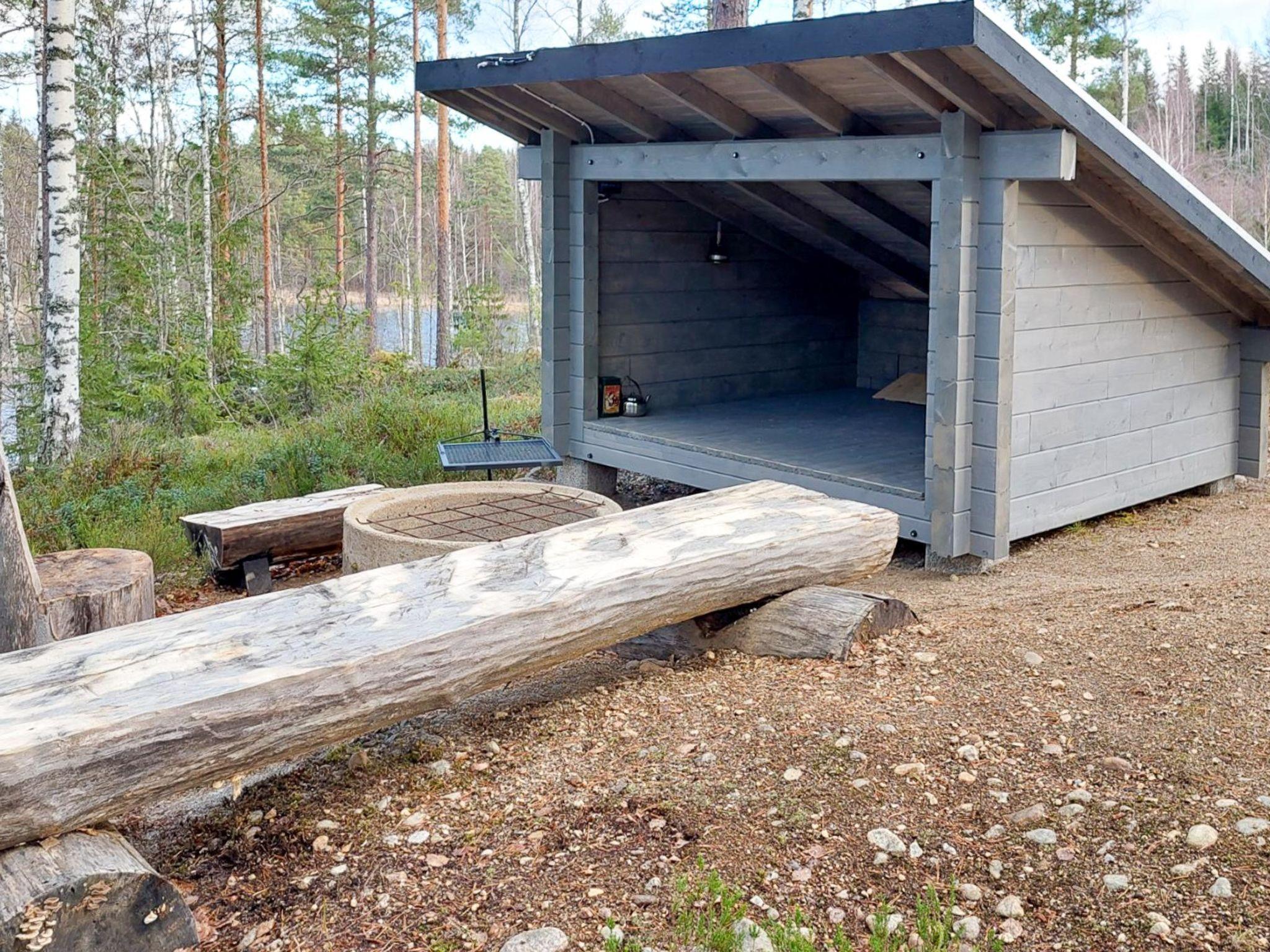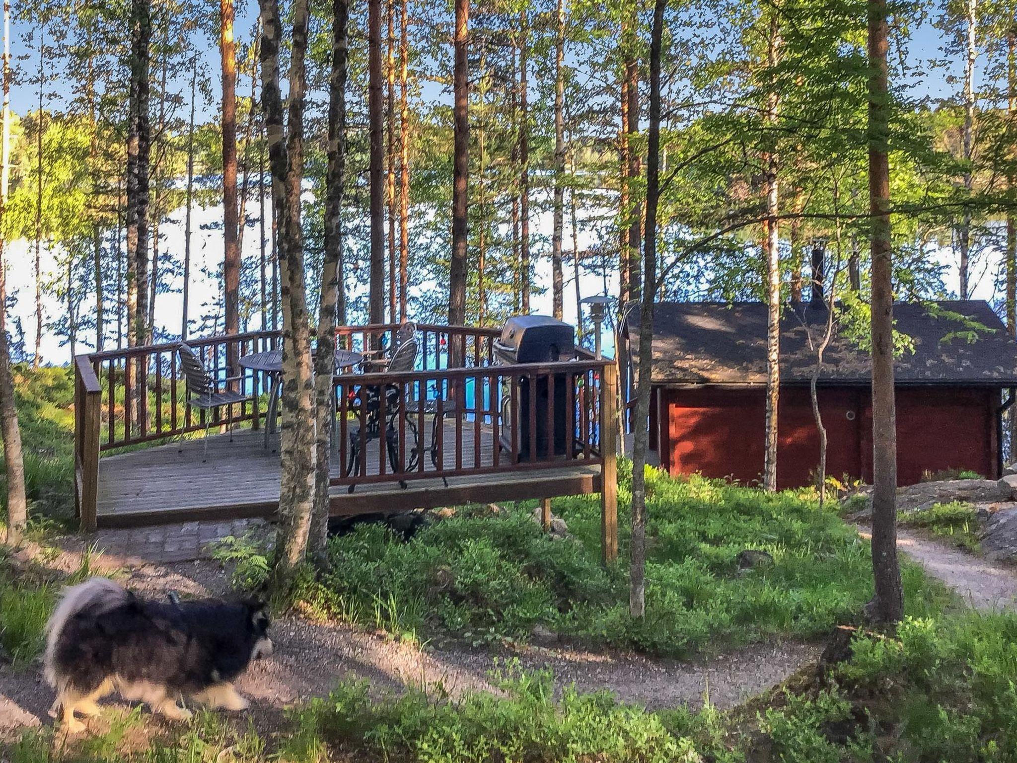 Separate lakeside sauna with wood-burning stove, dressing room, living room with fireplace and convertible sofa bed, covered terrace. Sauna building's fireplace room has minikitchen facilities without running water. There is electric radiator and fireplace for heating.