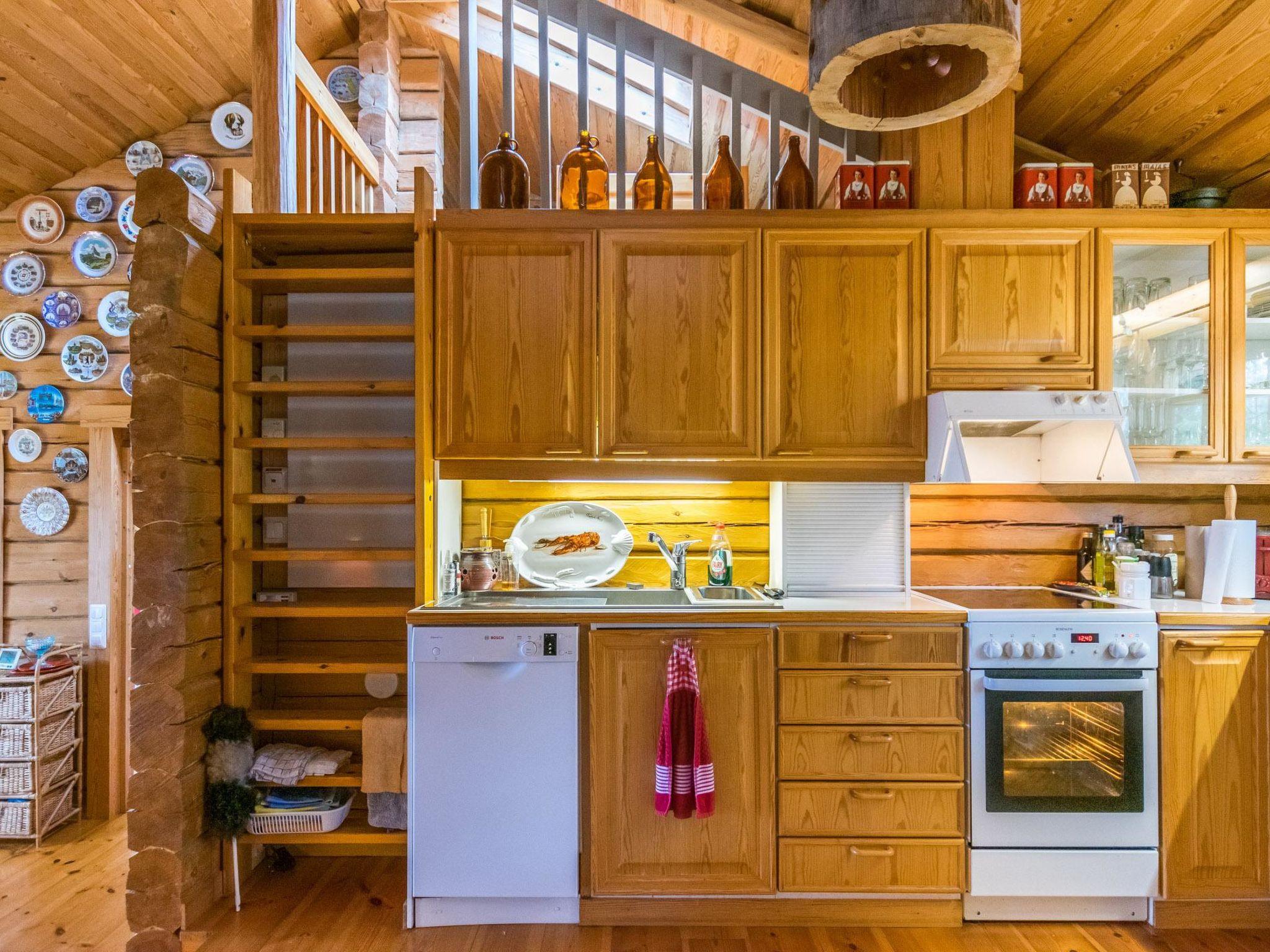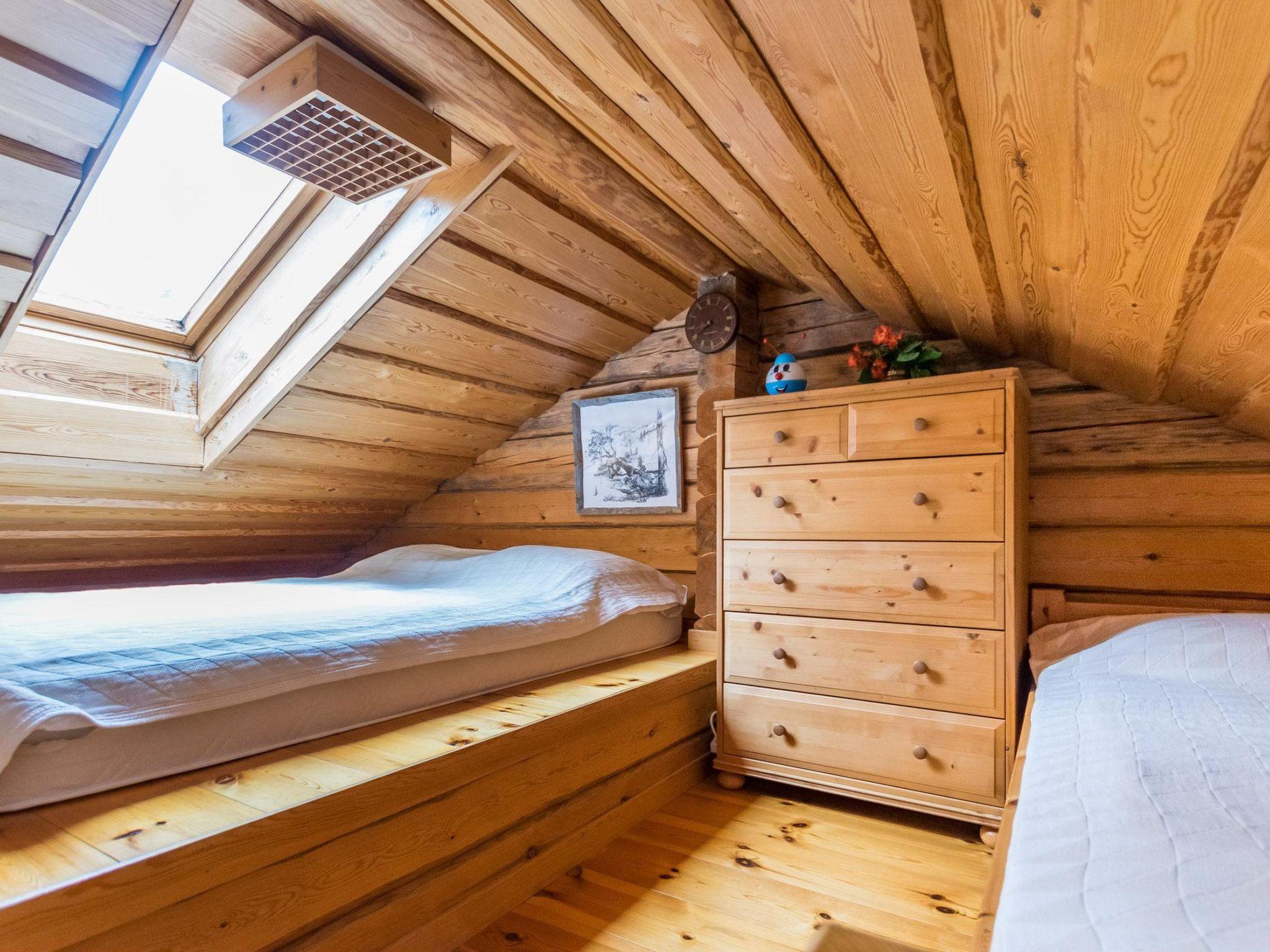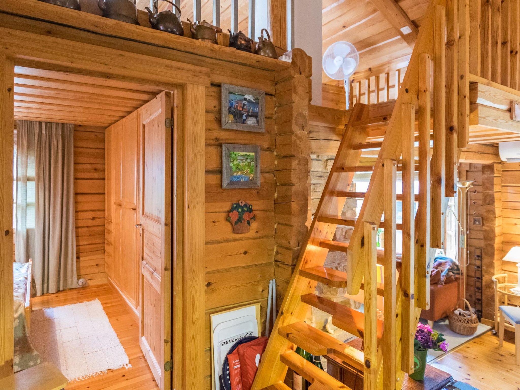 A log cottage (1998), living room and kitchen. Bedroom with a double bed (160 cm), and a sleeping alcove with one bed (120 cm). In addition, two lofts, one loft with two beds and the other with one bed. Indoor toilet. The fireplace is a cast iron hearth with a glass door.