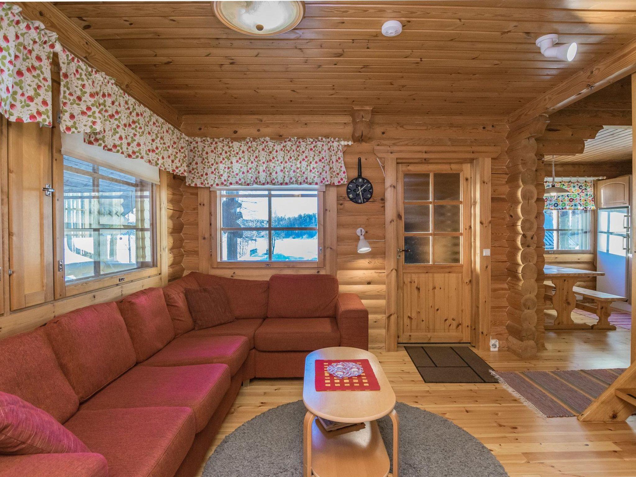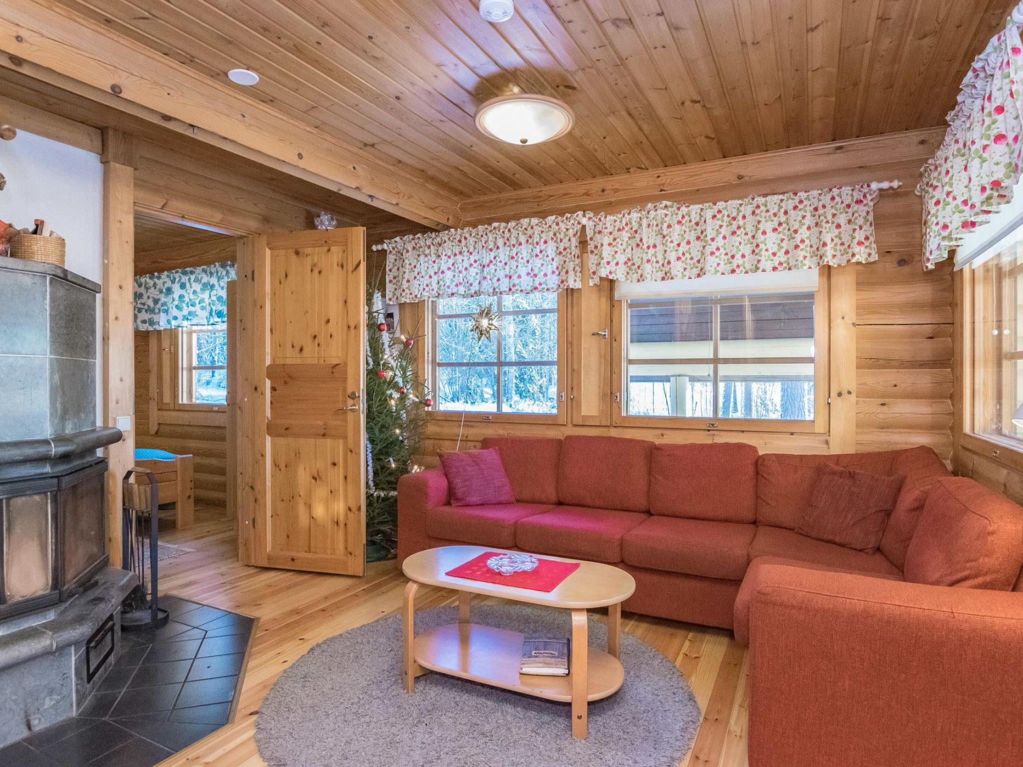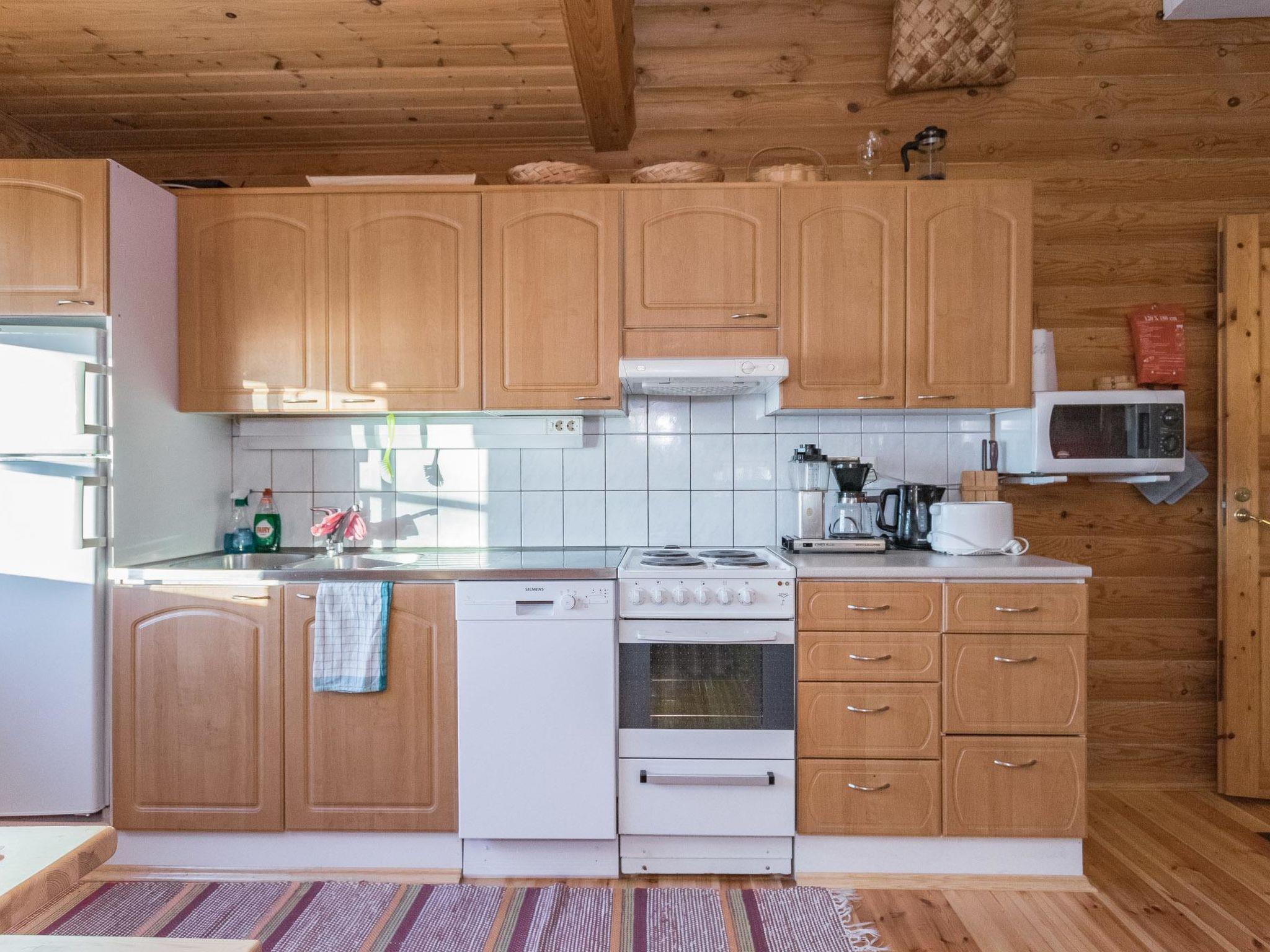 Log cabin 1994, kitchen, living room, bedroom (8.5 m²) with double bed, washroom, WC, sauna (wood-burning sauna stove), on the upper floor bedroom (9.5 m²) with 2 beds, sleeping alcove (6 m²), 2 extra beds in the lobby by using mattresses, balcony. Covered porch.