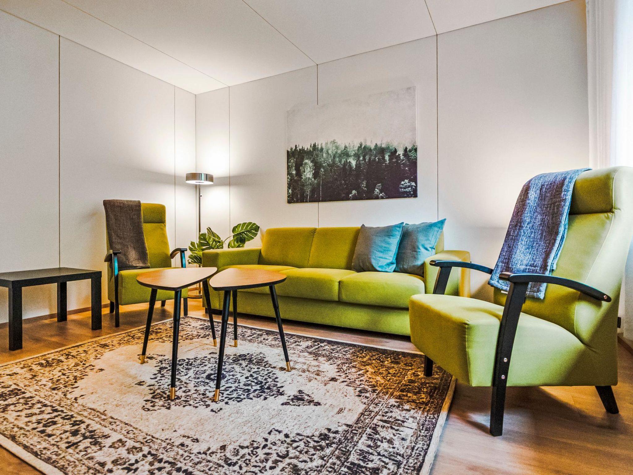 Sauna facilities shared by nine apartments. Sauna facilities includes dressing room, washroom, electric sauna stove, cooling terrace and washing machine. Sauna sessions (included in the price) can be booked at the reception.