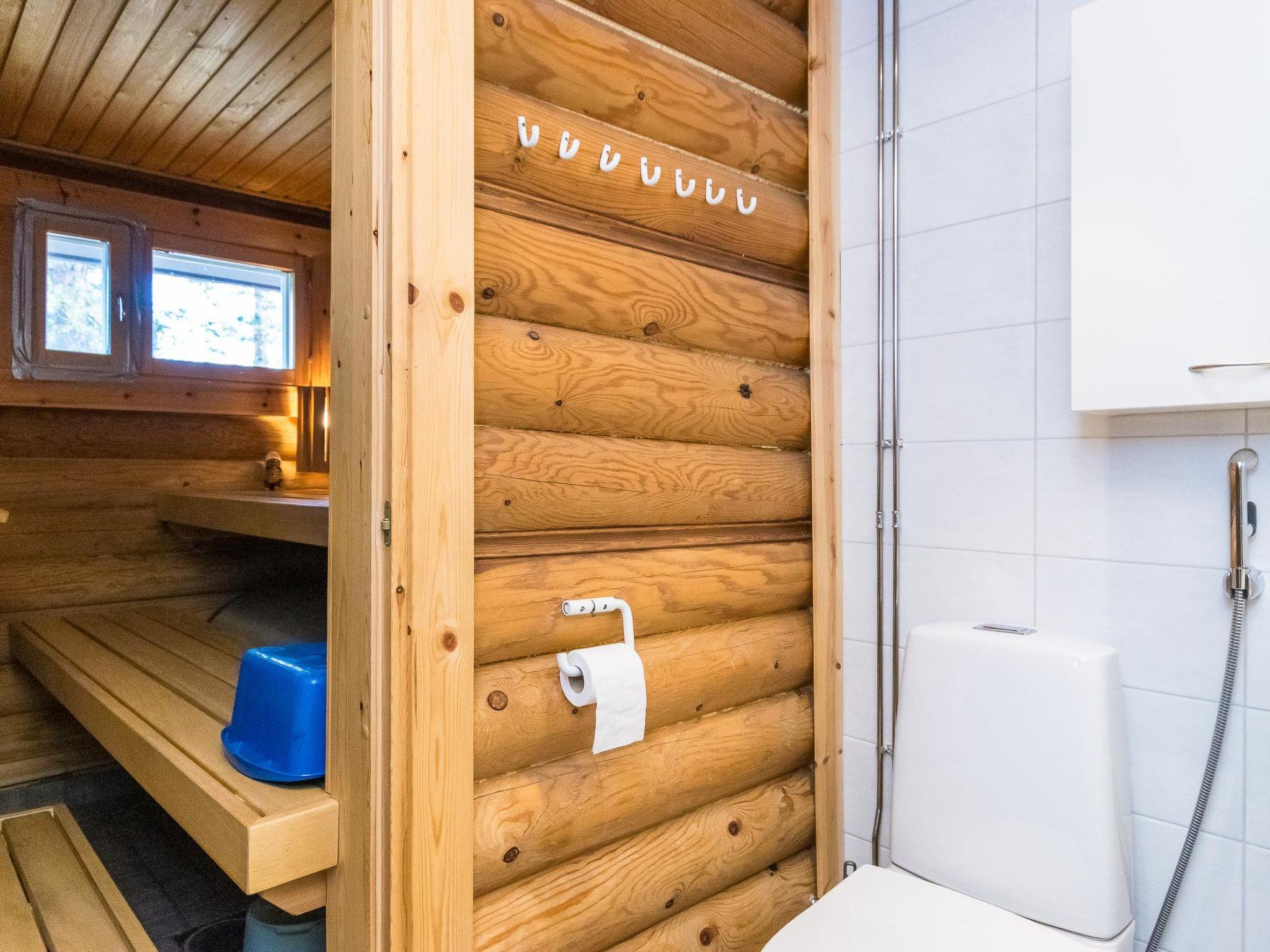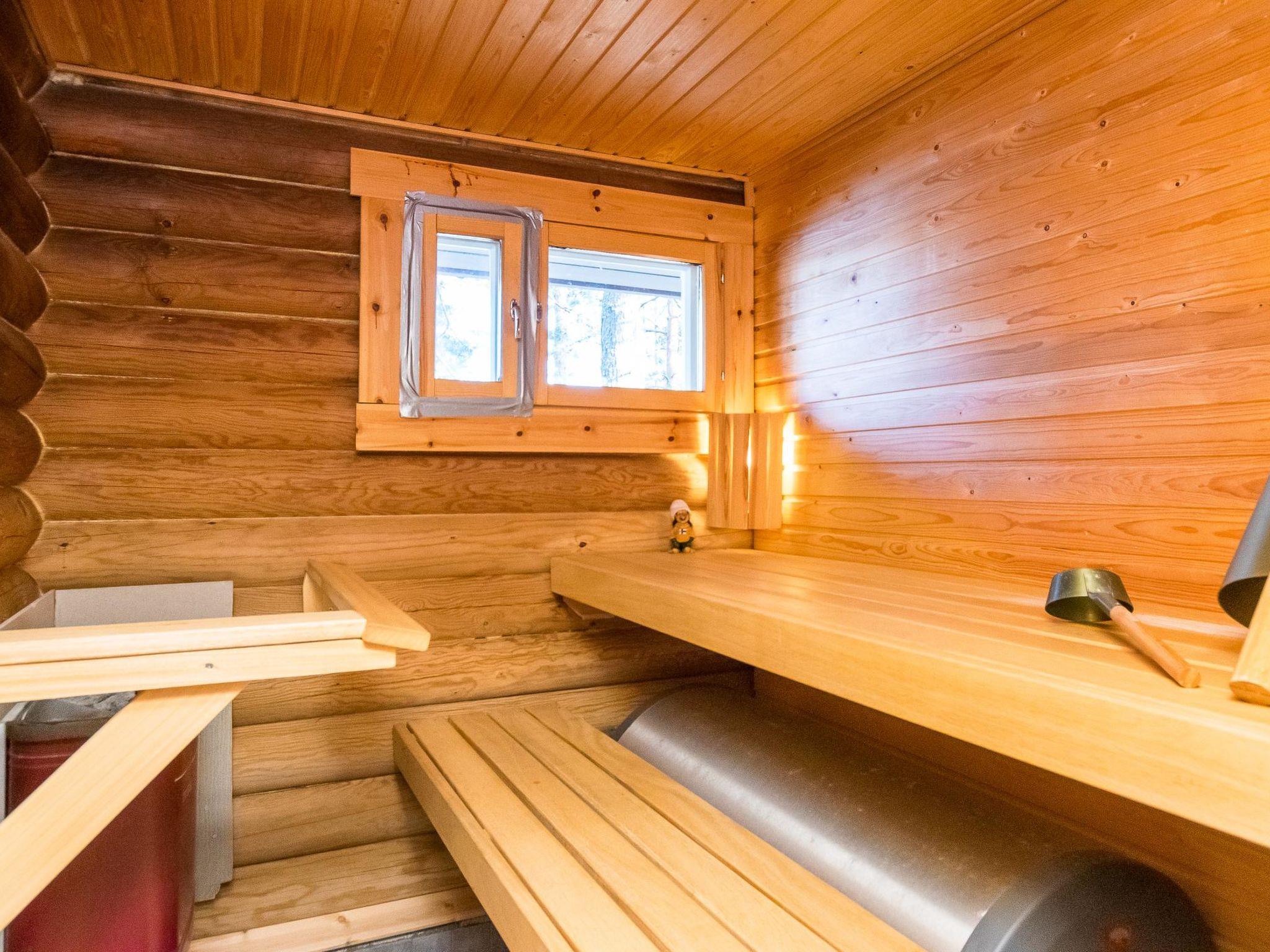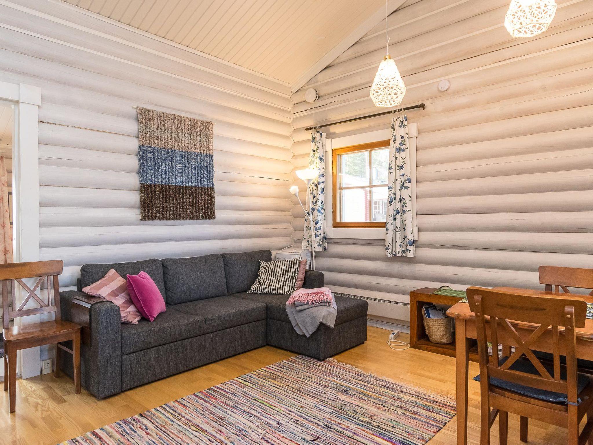 Round-log semi-detached apartment built in 1985, features a kitchenette (renovated in 2021), bedroom with a double bed, sleeping alcove with one bed, living room with sofa bed (145 cm x 195 cm when opened), loft with two mattresses accessed via steep stairs, washroom with shower and WC, electric sauna (washroom and sauna renovated in 2012), and a covered porch.