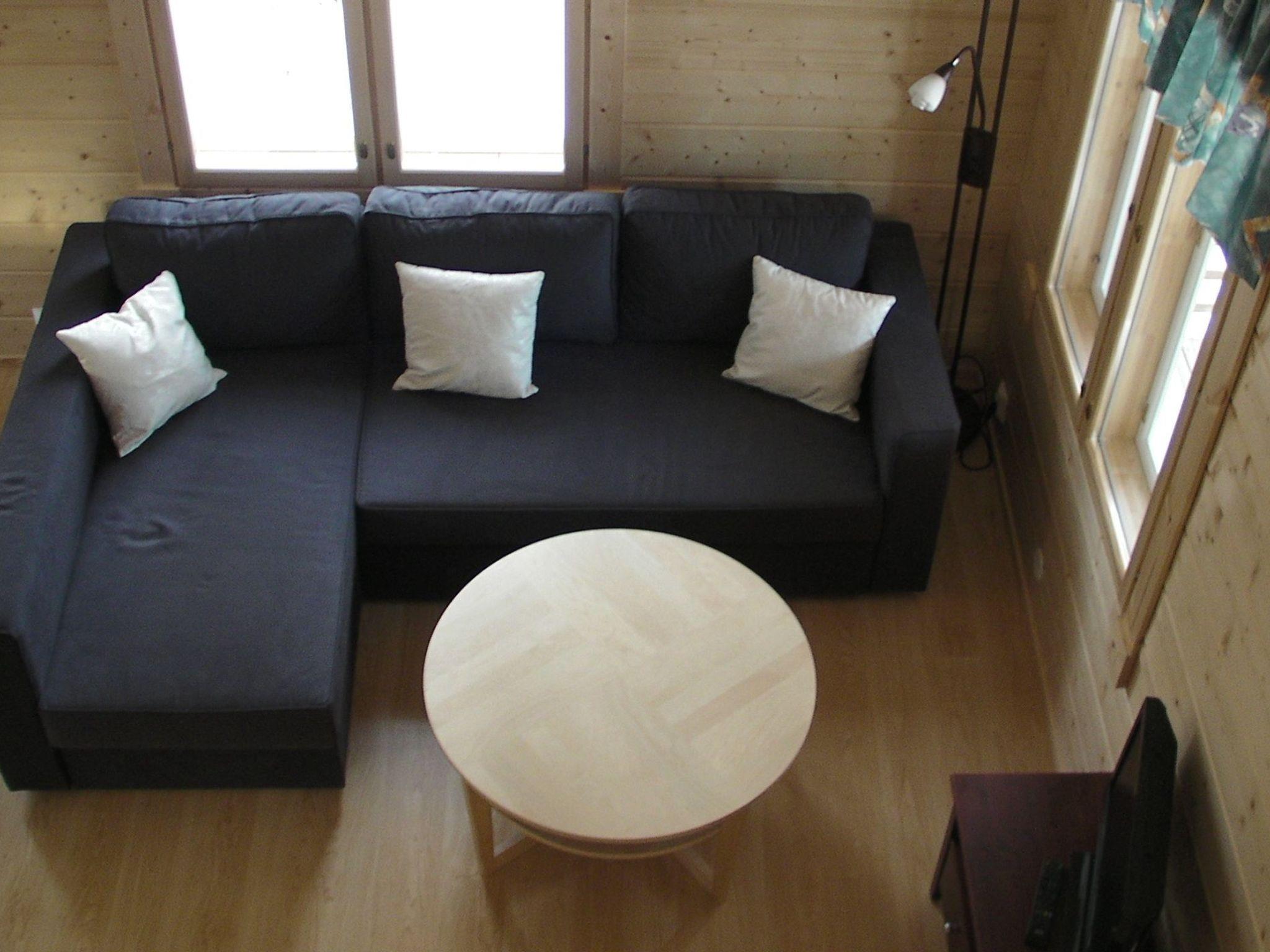 On the ground floor there is an open-plan living room (with sofa bed) and adjoining kitchen area, 1 bedroom (double bed and large built-in wardrobe), bathroom, separate toilet incl. bidet and sauna as well as a sufficiently large anteroom where you can store your weather gear and the washing machine. The living room has a soapstone fireplace, TV, DVD player, Internet radio and a small selection of books and DVDs. The kitchen with dining area for 5 people is equipped with everything you need, from crockery and cutlery to a cooker and dishwasher. On the upper floor (sleeping loft) is the sleeping area for two people with 2 single beds and a beautiful view of the countryside.